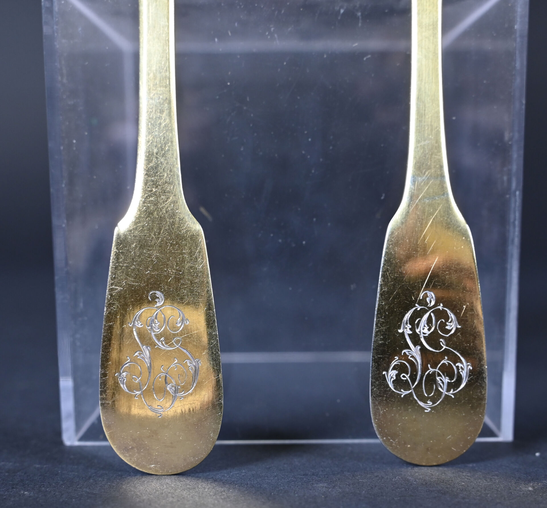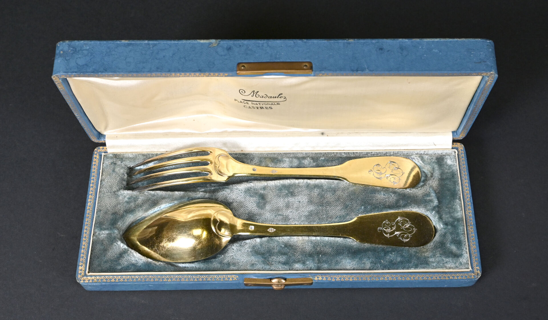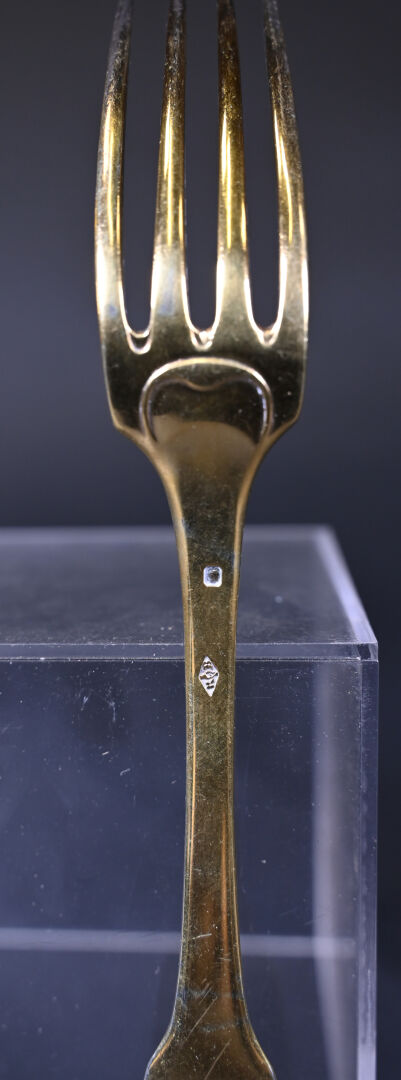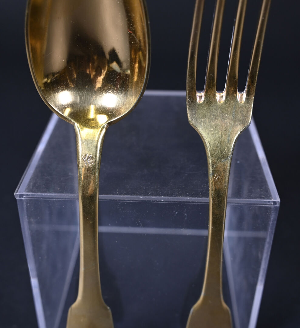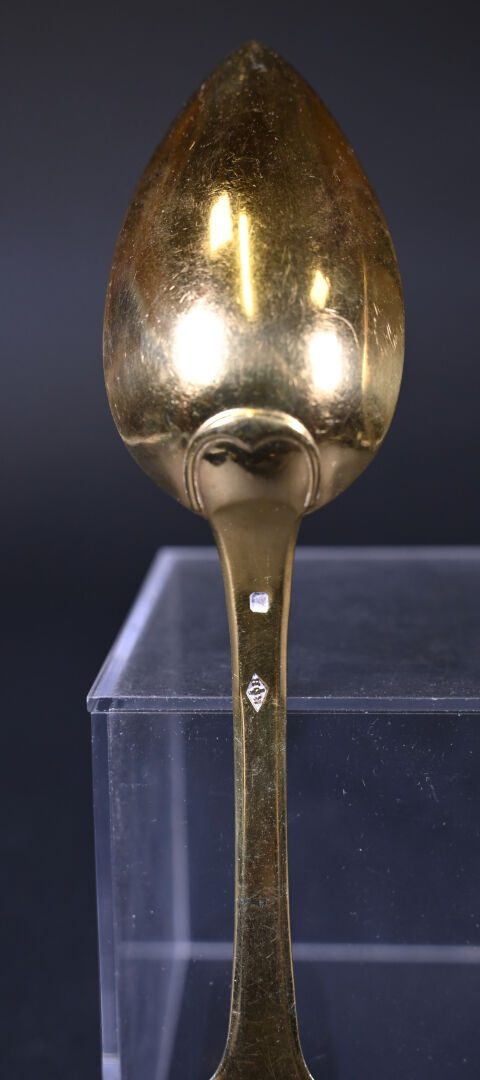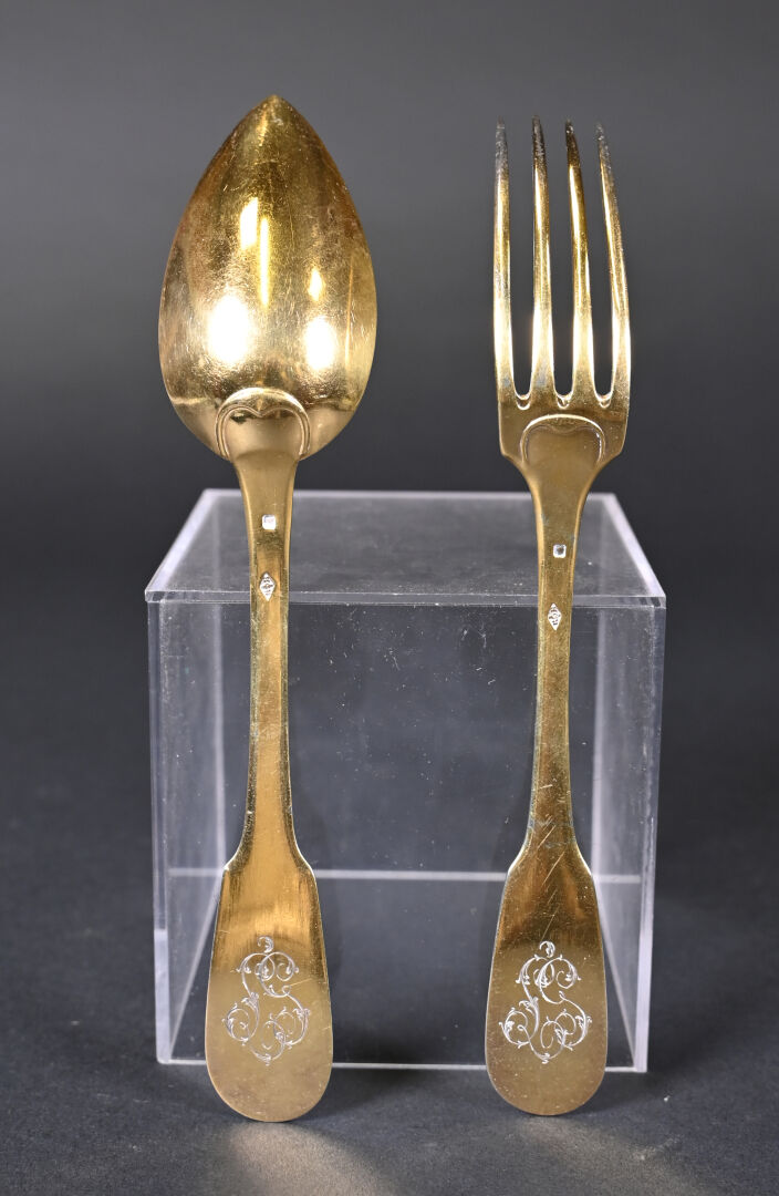 Grand couvert en argent doré 925/1000e, la spatule chiffrée. Poids : 119 g. Ecrin.