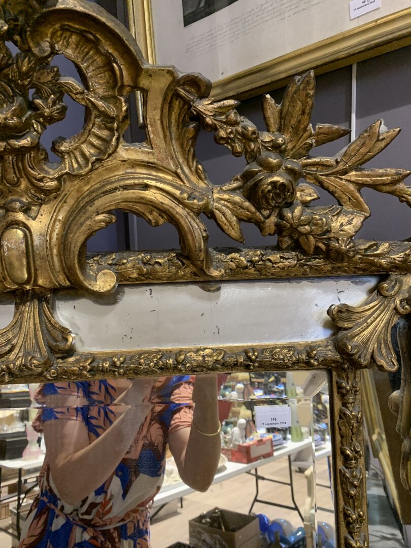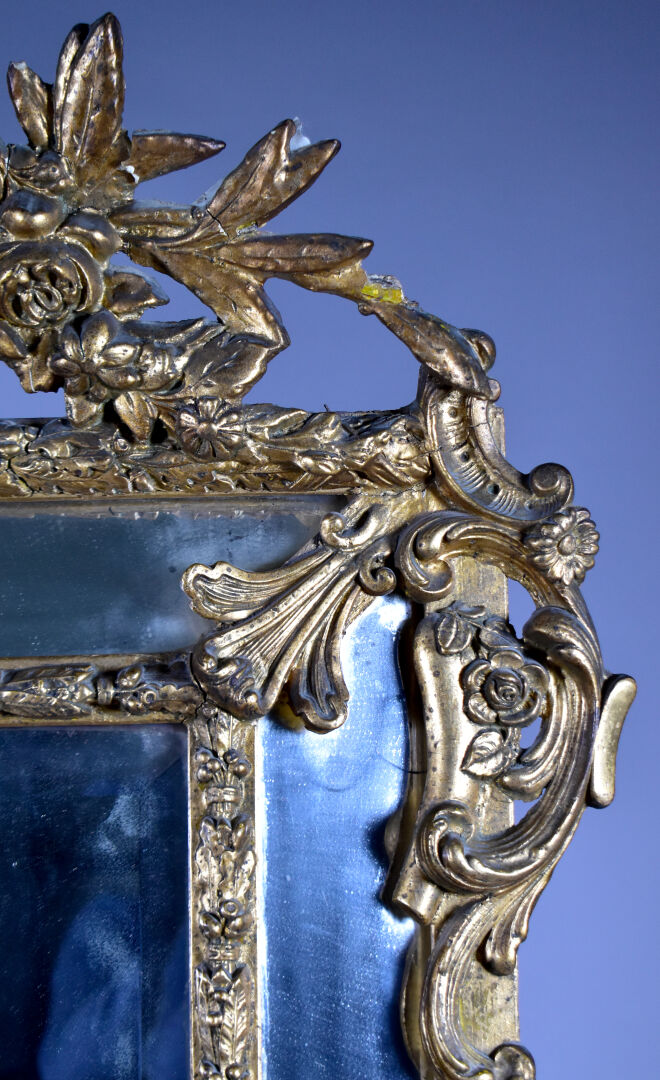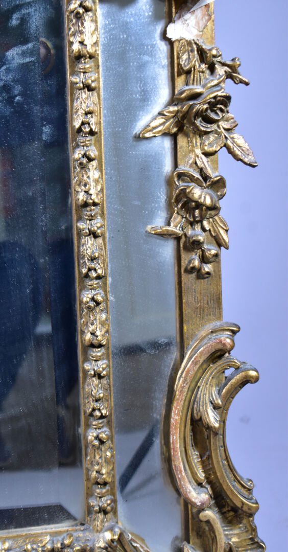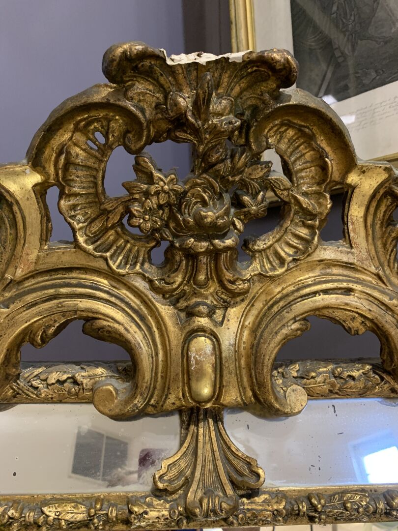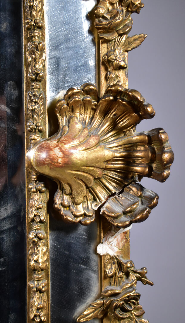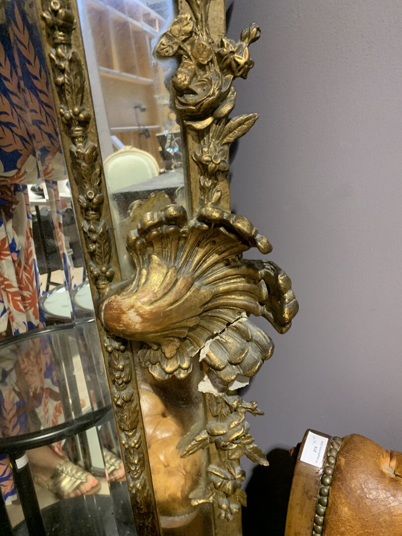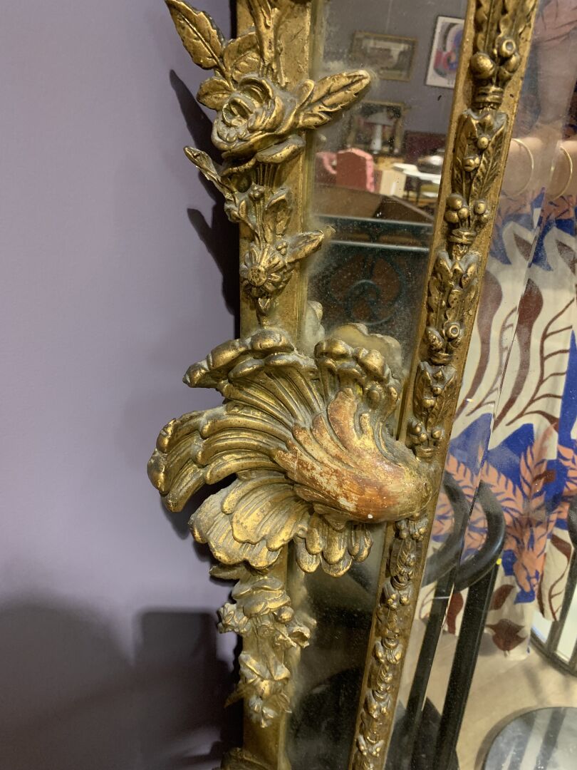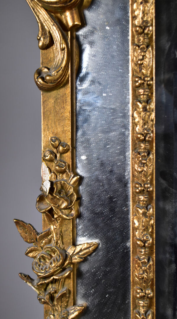 Grand miroir à parecloses en bois sculpté doré à décor de palmettes, acanthes (éclats et manques). Epoque Napoléon III. 178 x 104 cm.