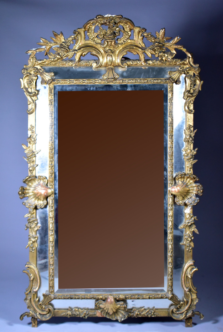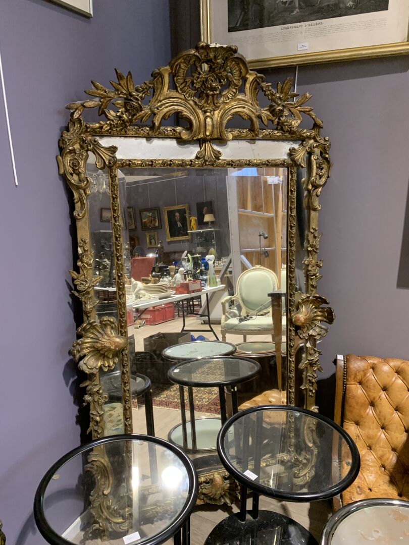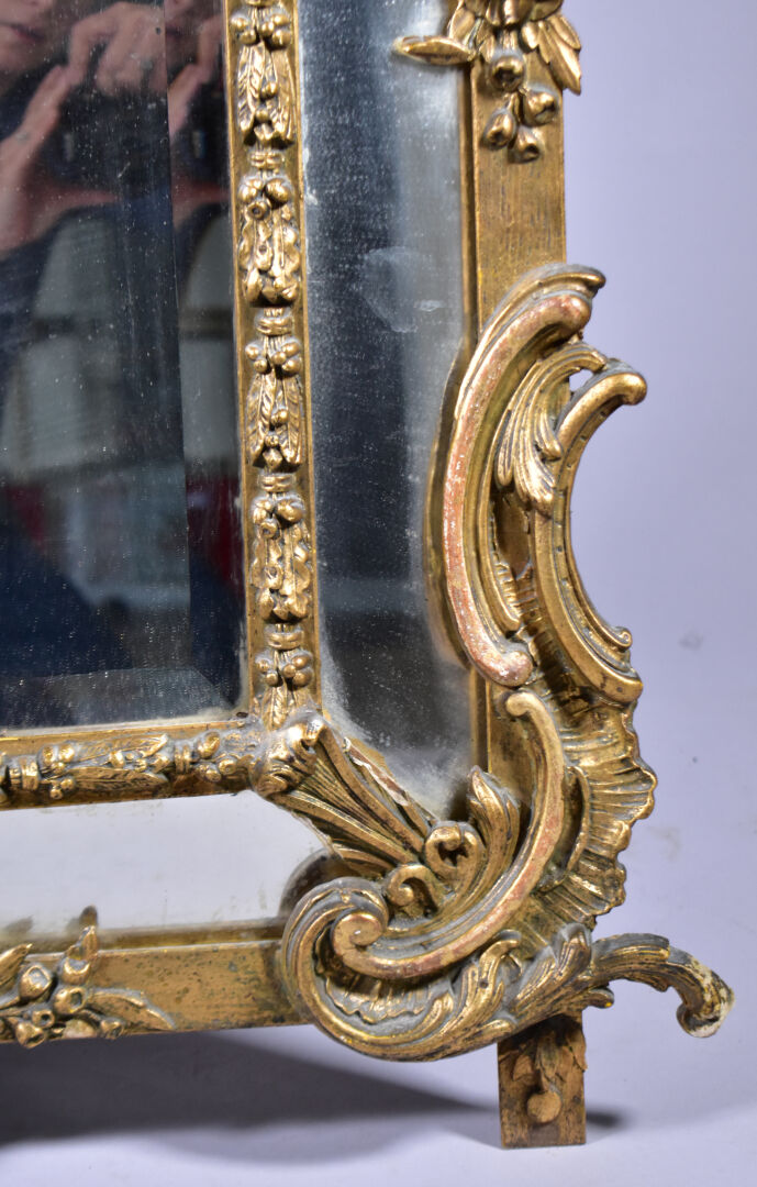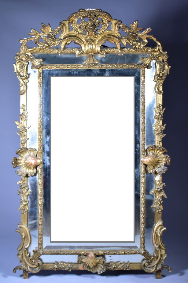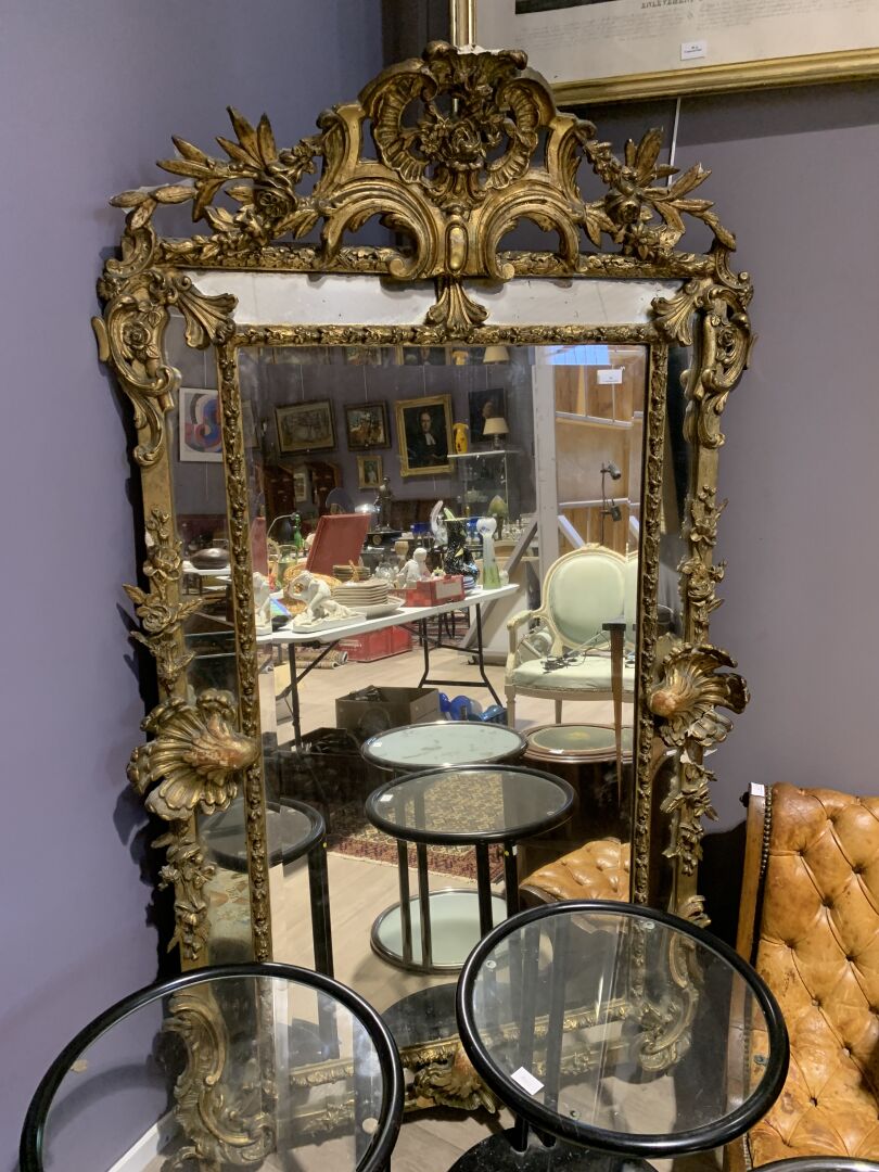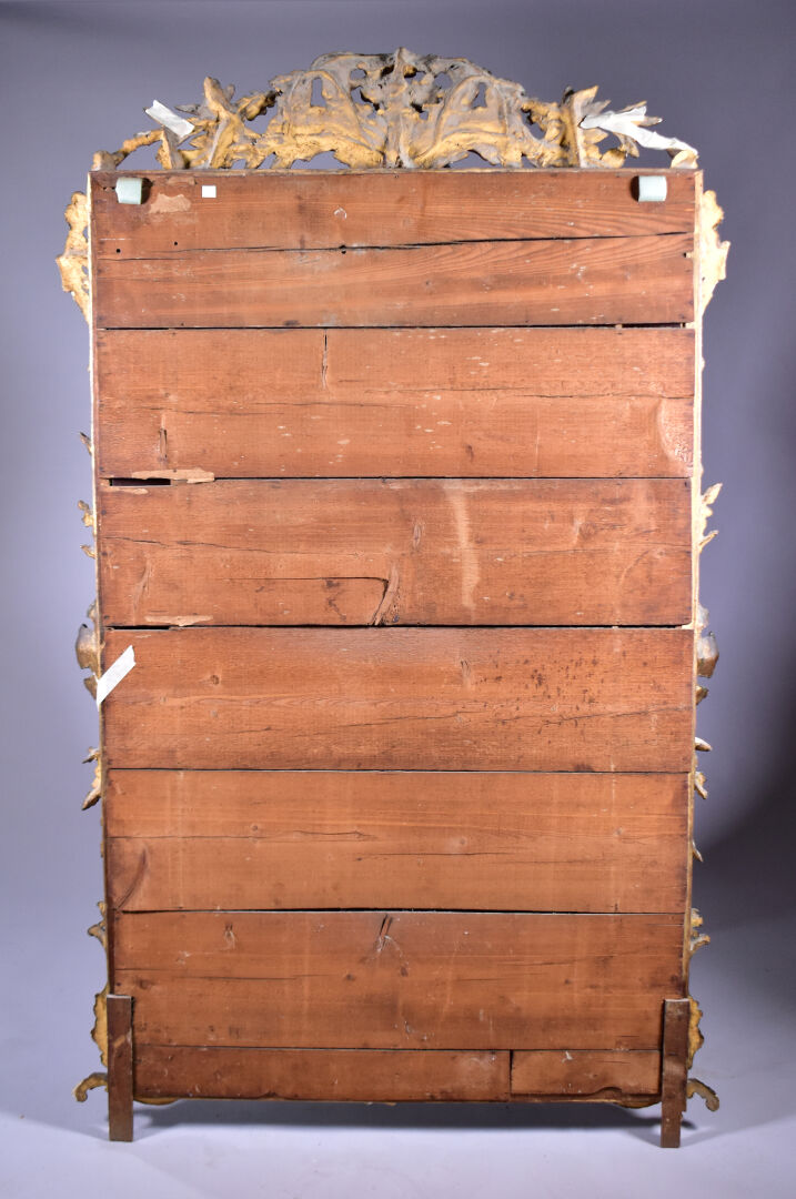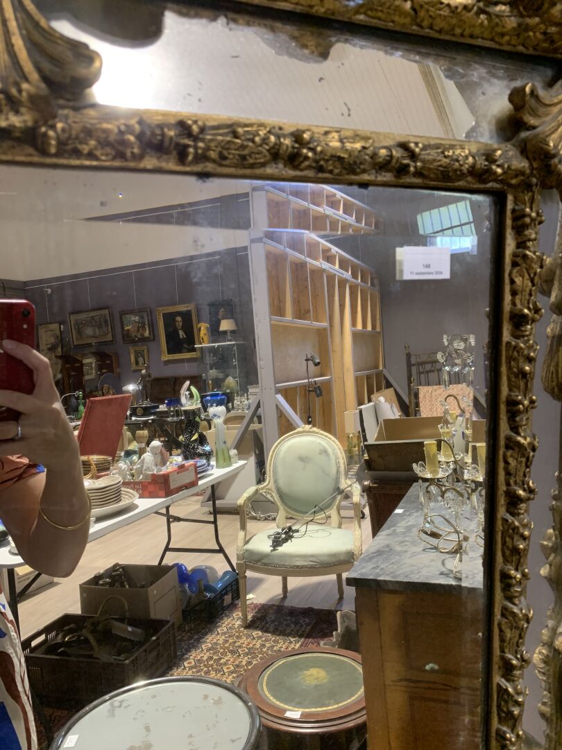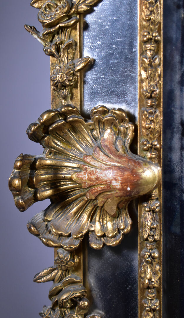 Grand miroir à parecloses en bois sculpté doré à décor de palmettes, acanthes (éclats et manques). Epoque Napoléon III. 178 x 104 cm.