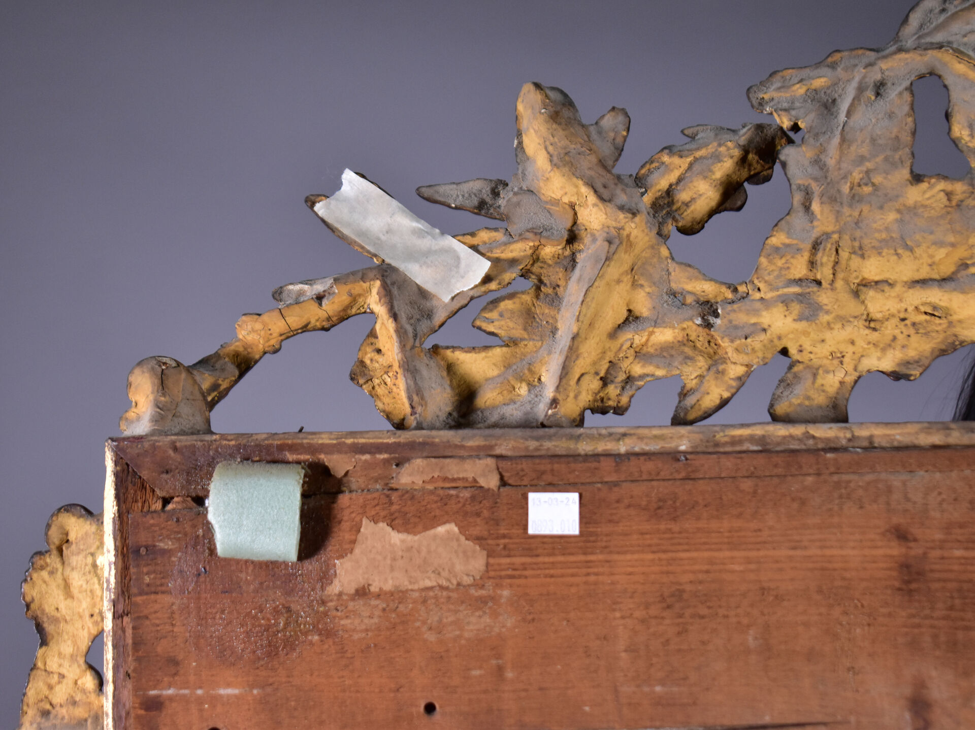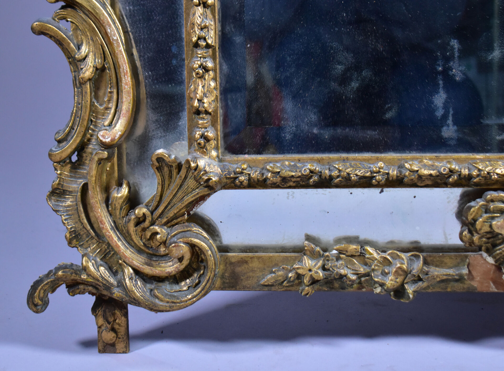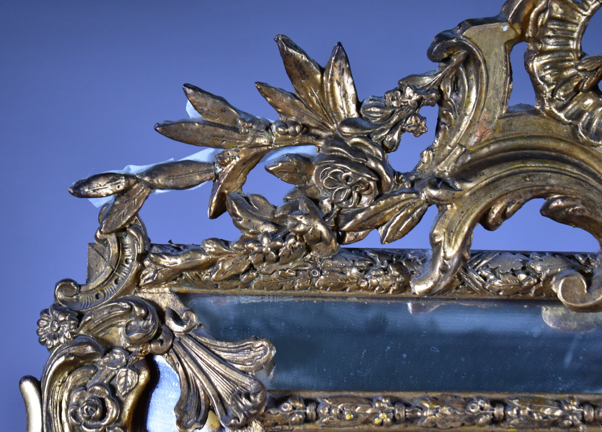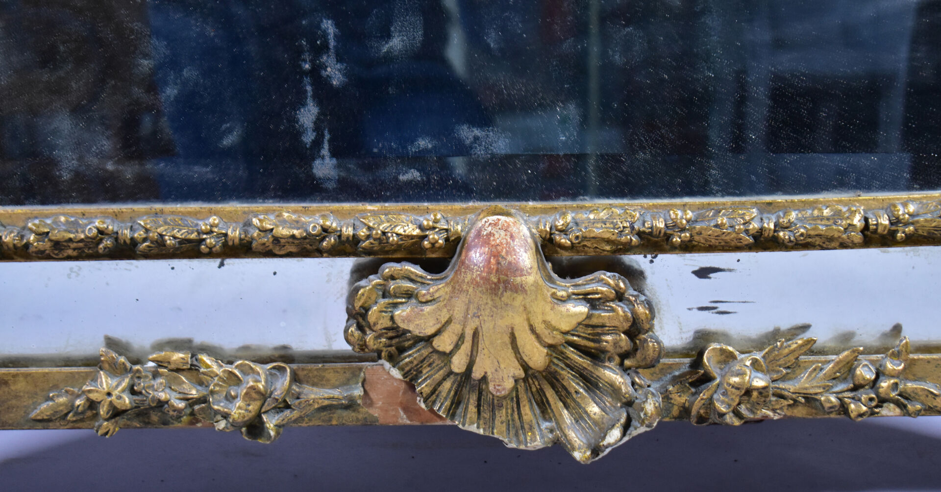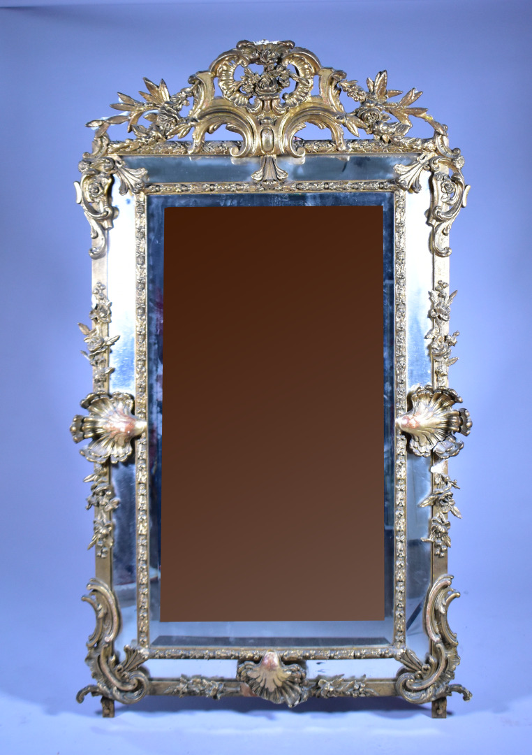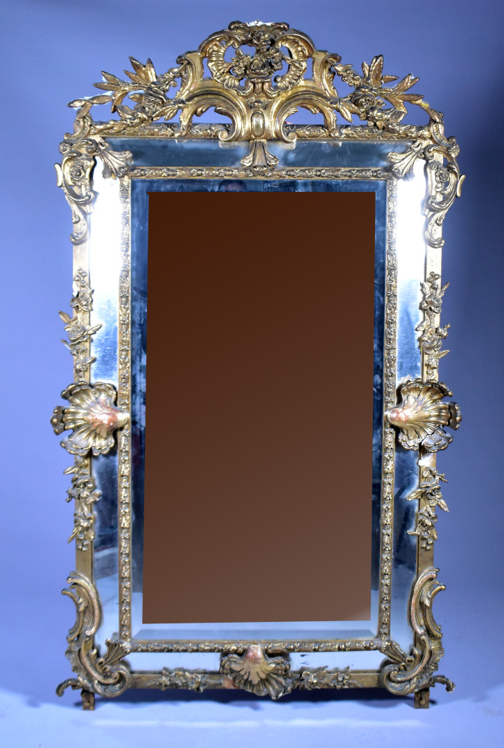 Grand miroir à parecloses en bois sculpté doré à décor de palmettes, acanthes (éclats et manques). Epoque Napoléon III. 178 x 104 cm.