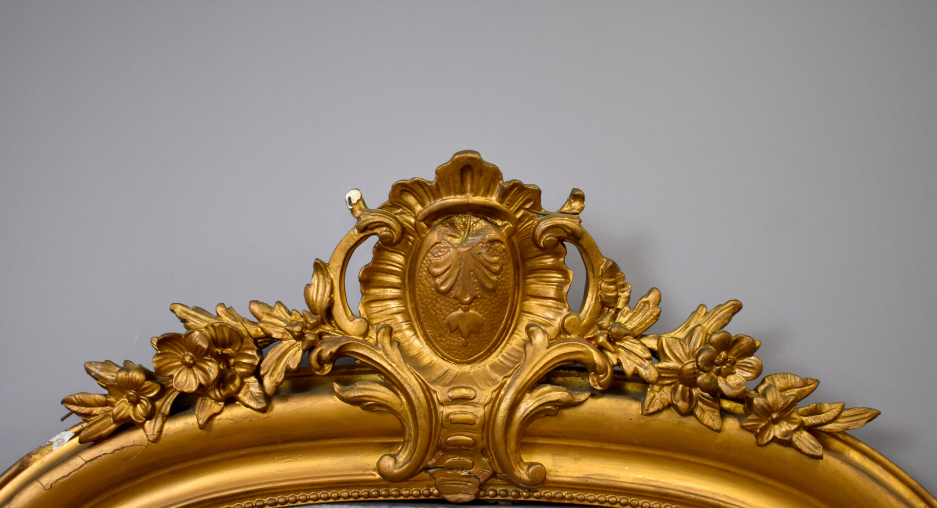 Grand miroir en bois et composition dorée, le fronton orné d’un médaillon dans un entourage rocaille (petits manques et repeint). Fin du XIXe siècle. 156 x 92 cm.