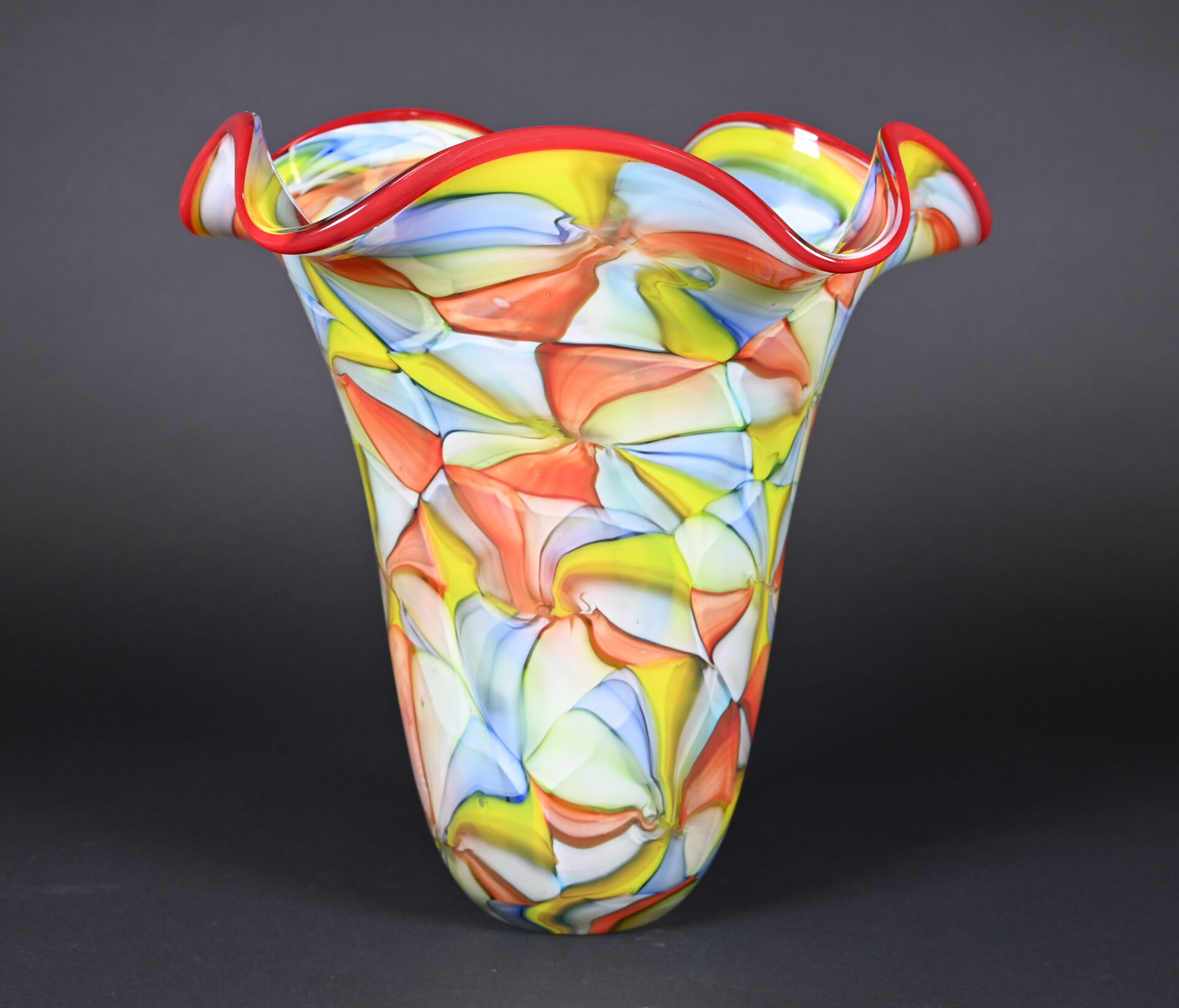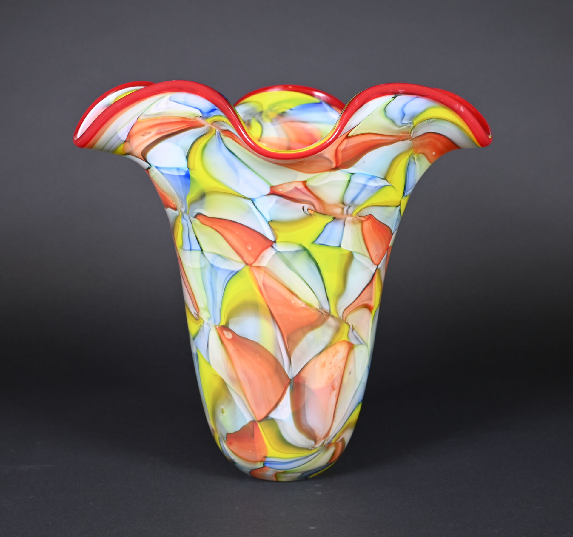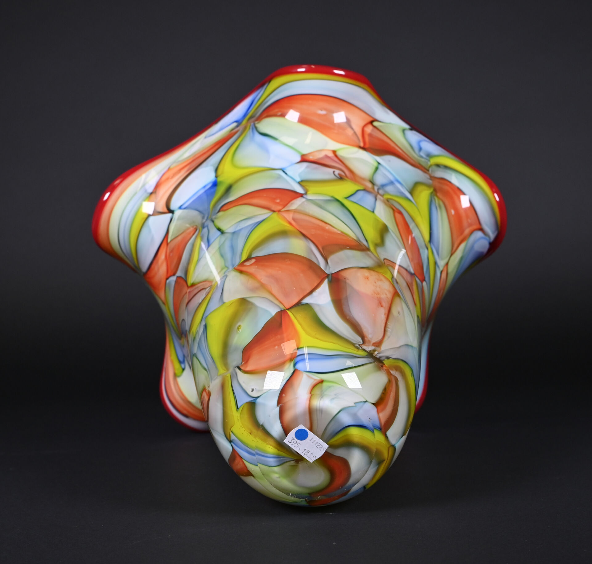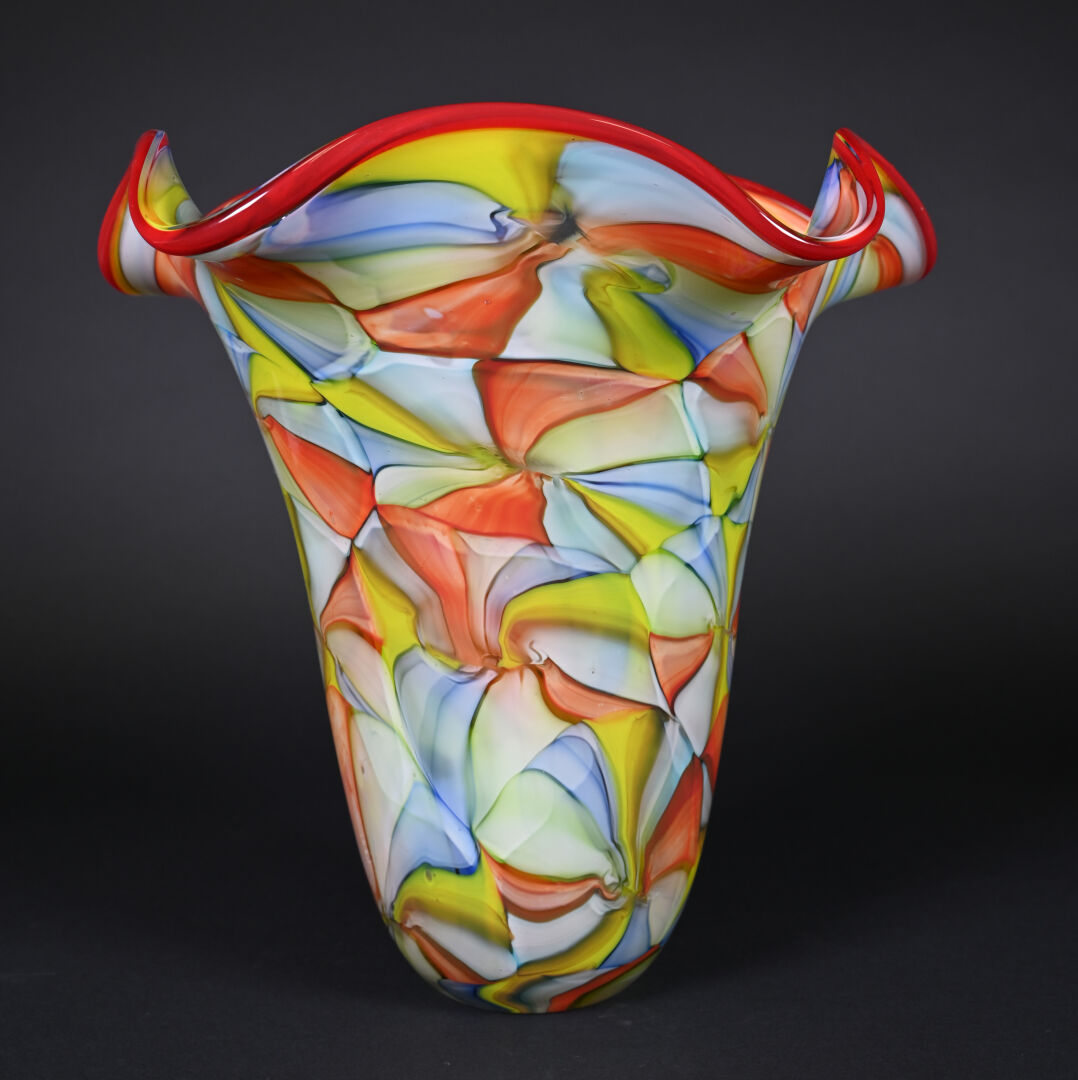 Grand vase à col à corole en verre à motif de très larges murines en rouge, vert, jaune et bleu. Probablement Murano, XXe siècle. Haut. : 35 cm.