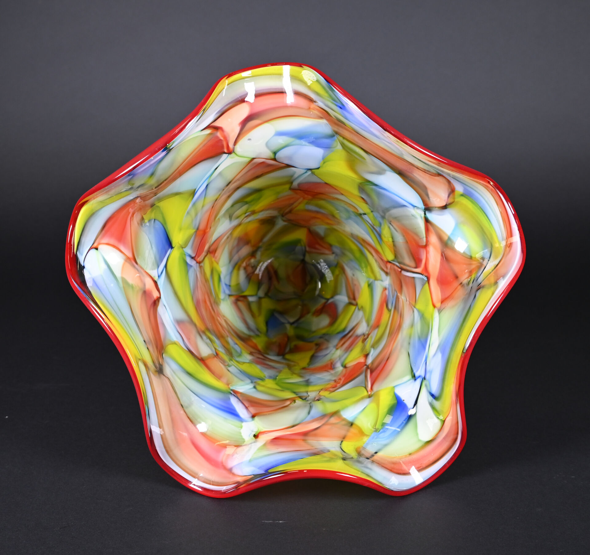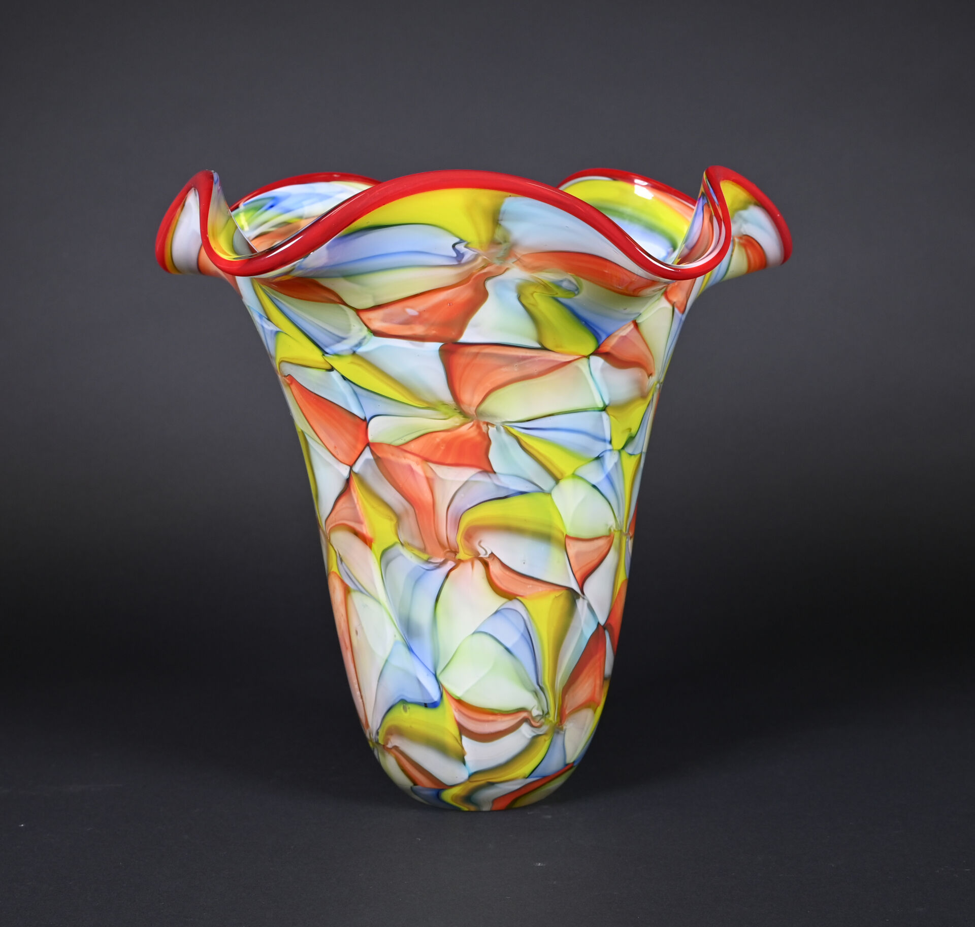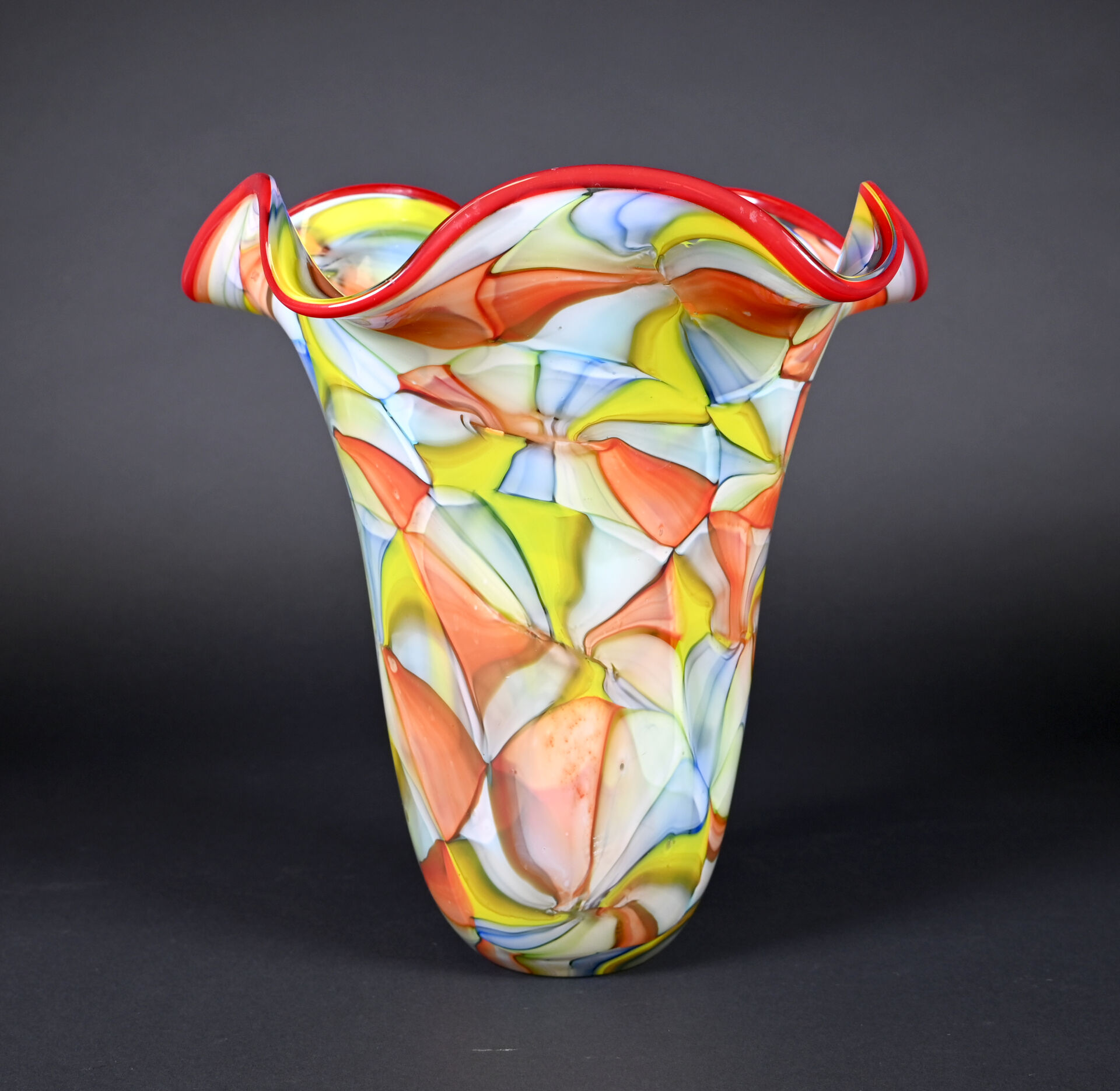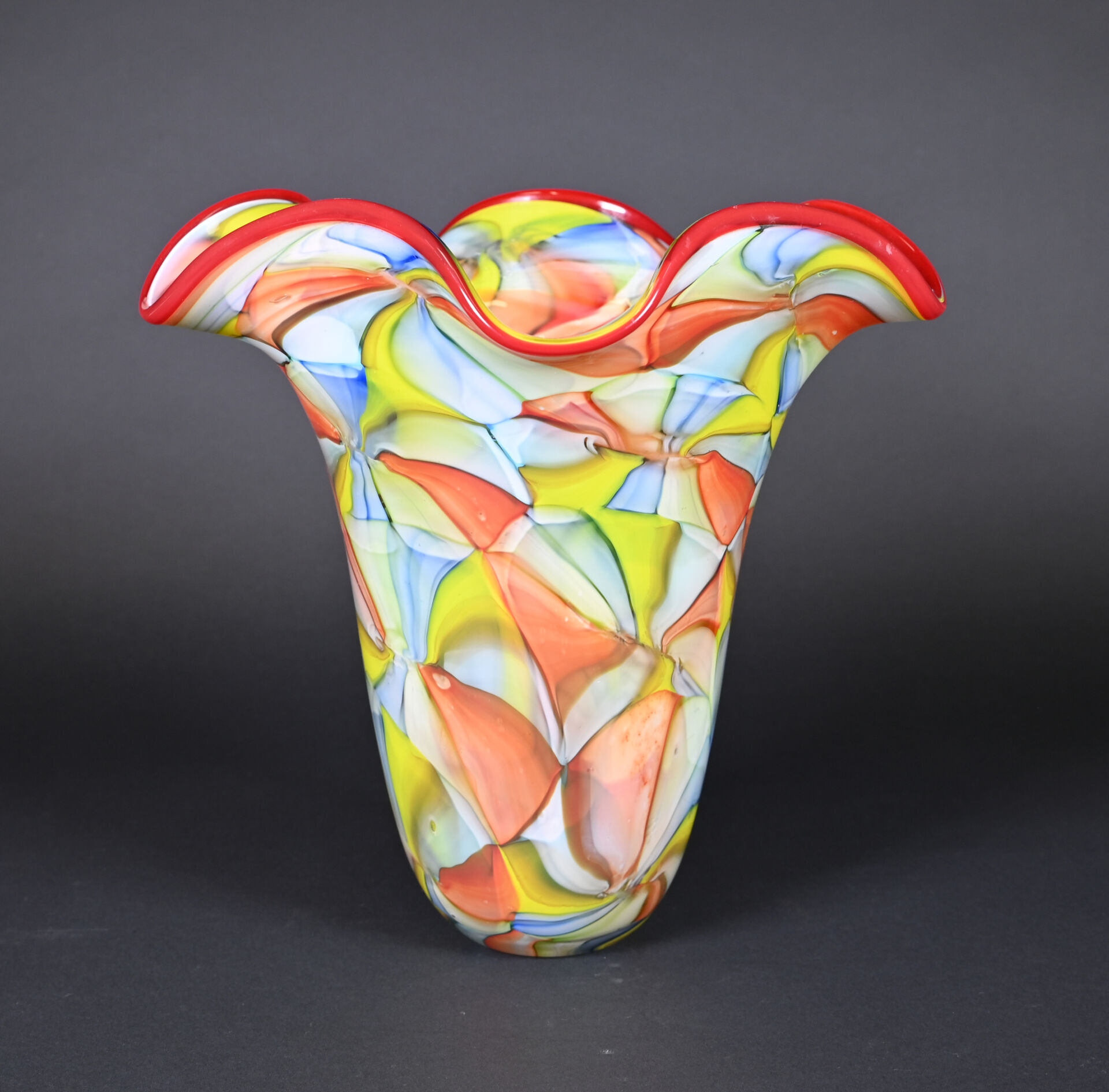 Grand vase à col à corole en verre à motif de très larges murines en rouge, vert, jaune et bleu. Probablement Murano, XXe siècle. Haut. : 35 cm.
