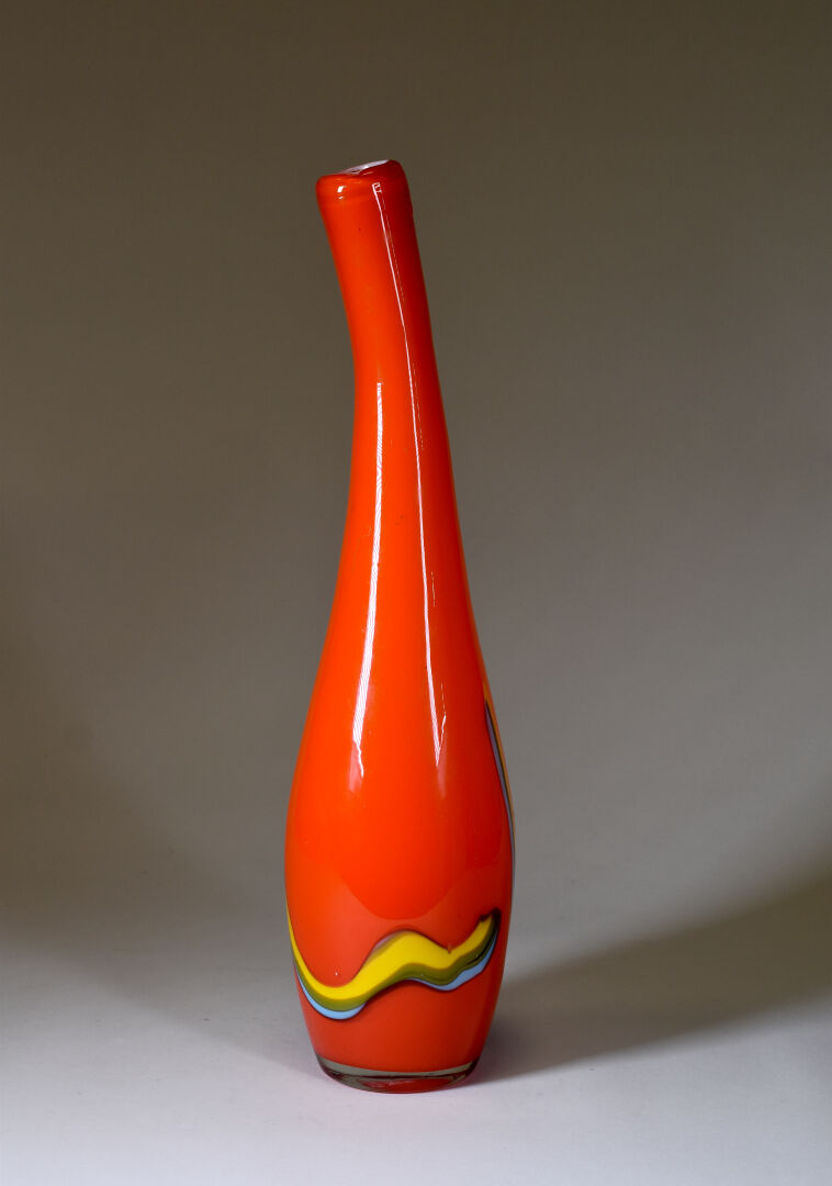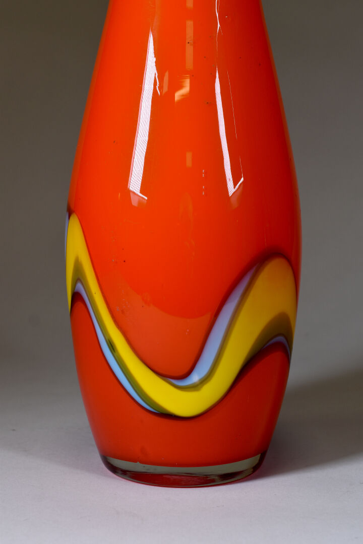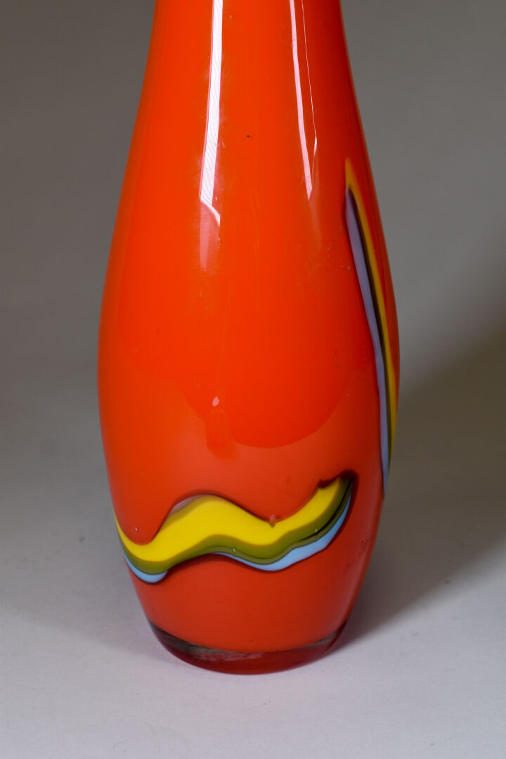 Grand vase à haut col en verre multicouche orange à décor de serpentins en jaune et bleu. Dans le goût des années 1960. Haut. : 55 cm.