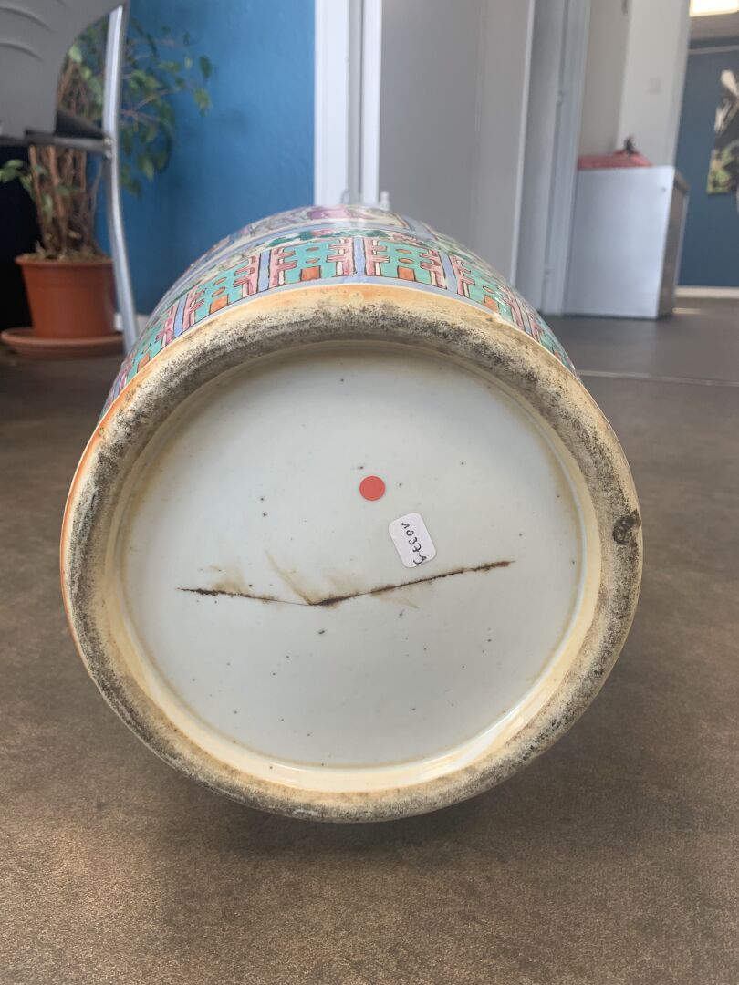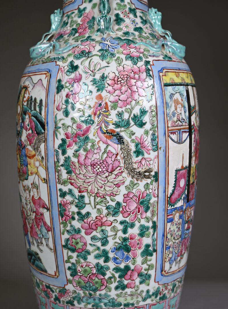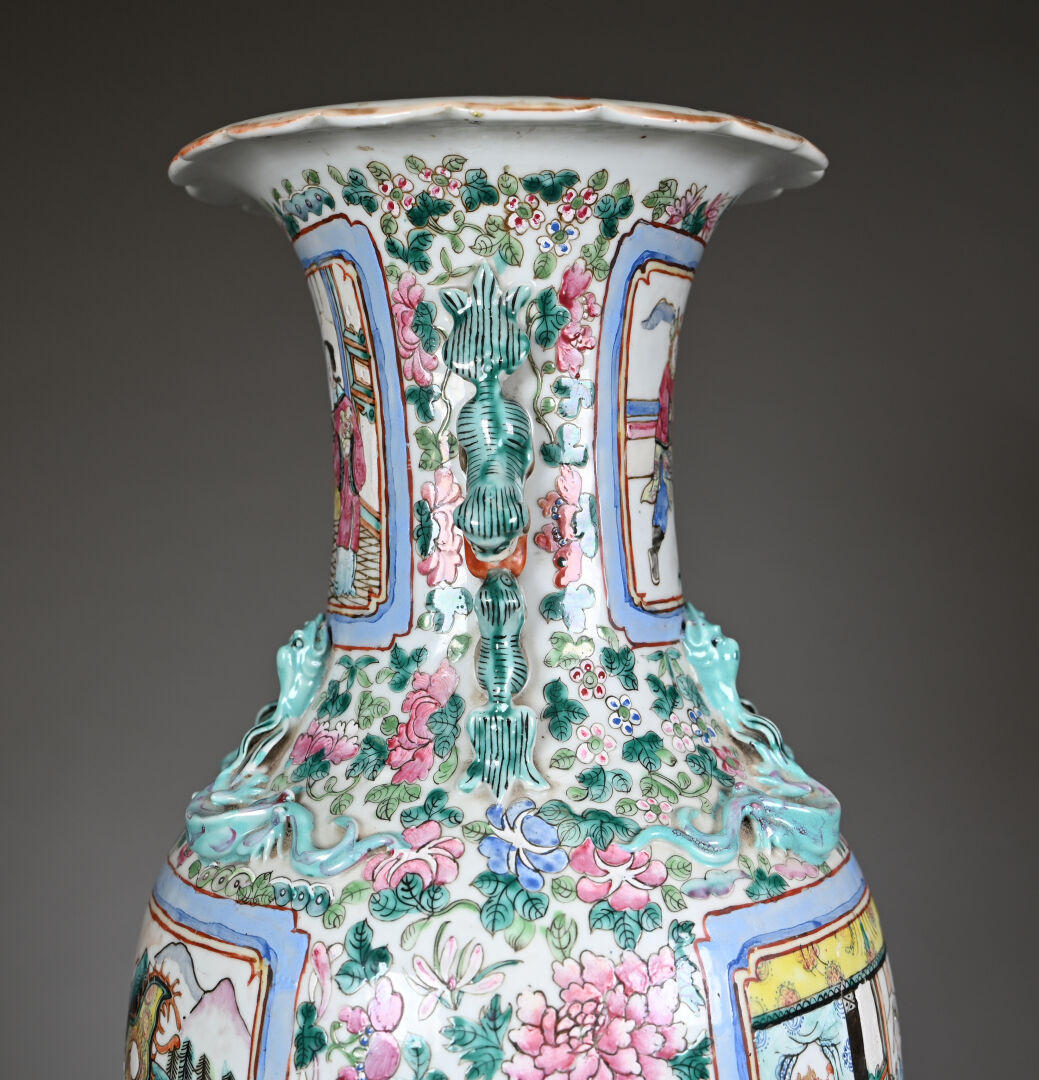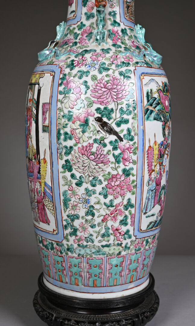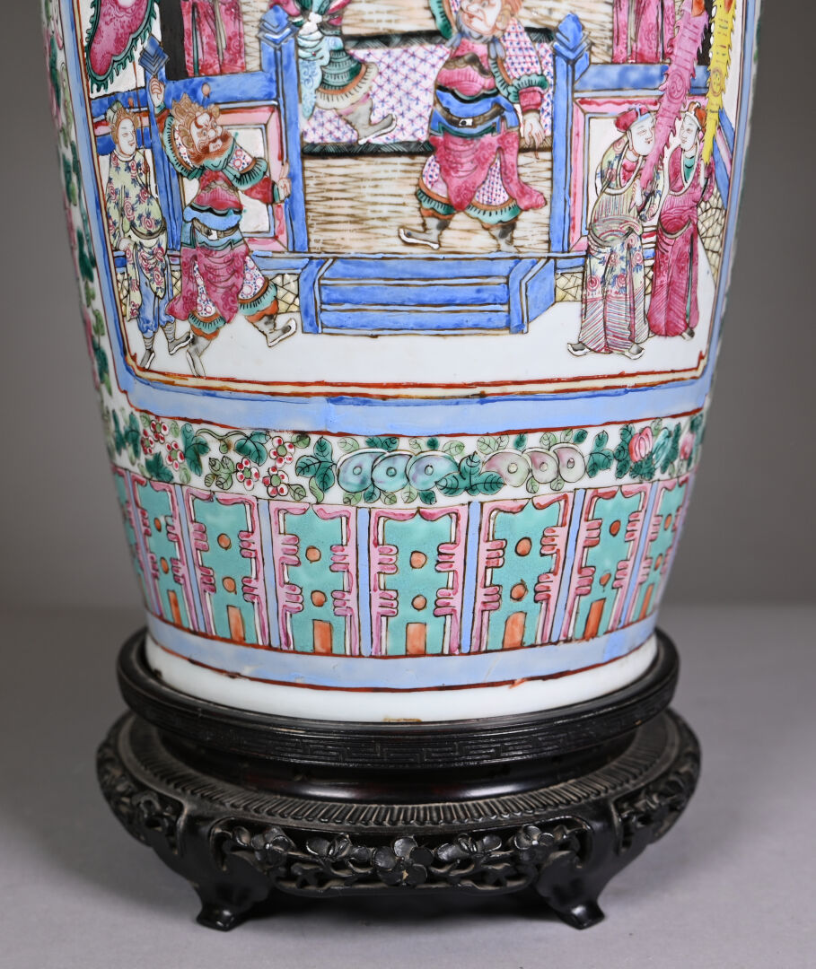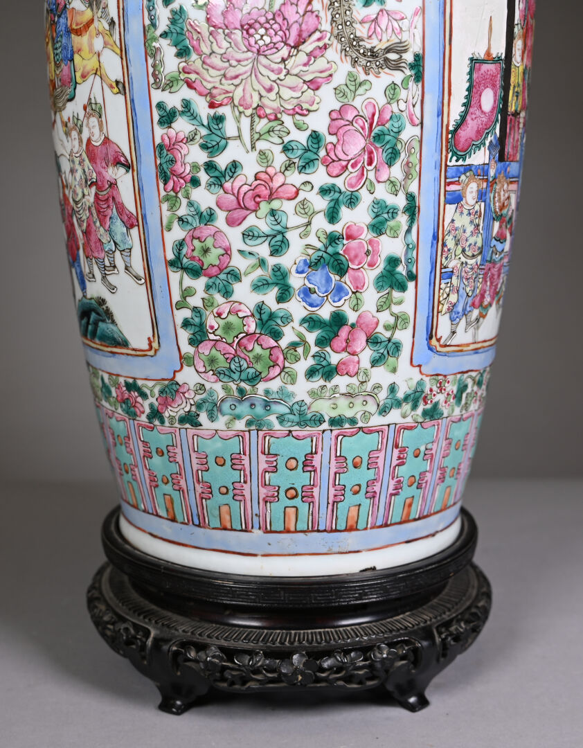 Grand vase balustre en porcelaine à décor émaillé de la famille rose de scènes de palais dans des réserves sur fond de fleurs et oiseaux. Chine, période Guangxu, circa 1880. (fêle sur la base, sauts d’émail). Haut.: 62 cm. Avec socle en bois sculpté.