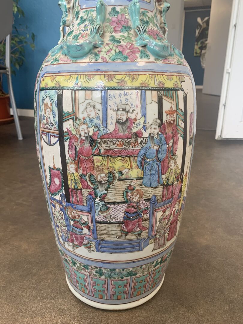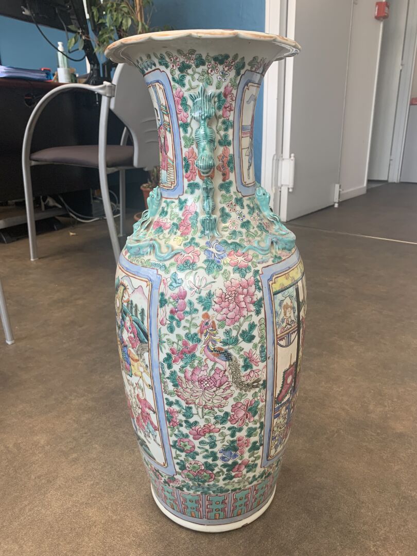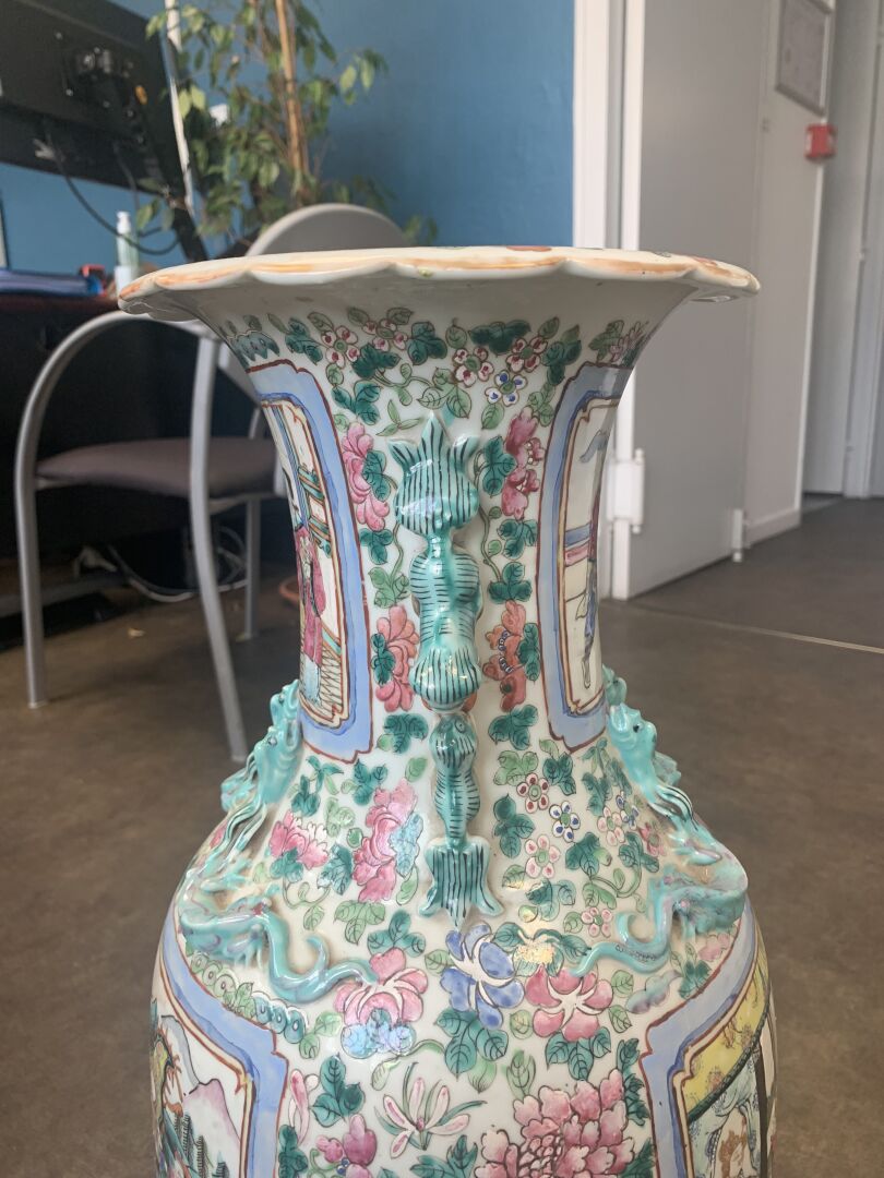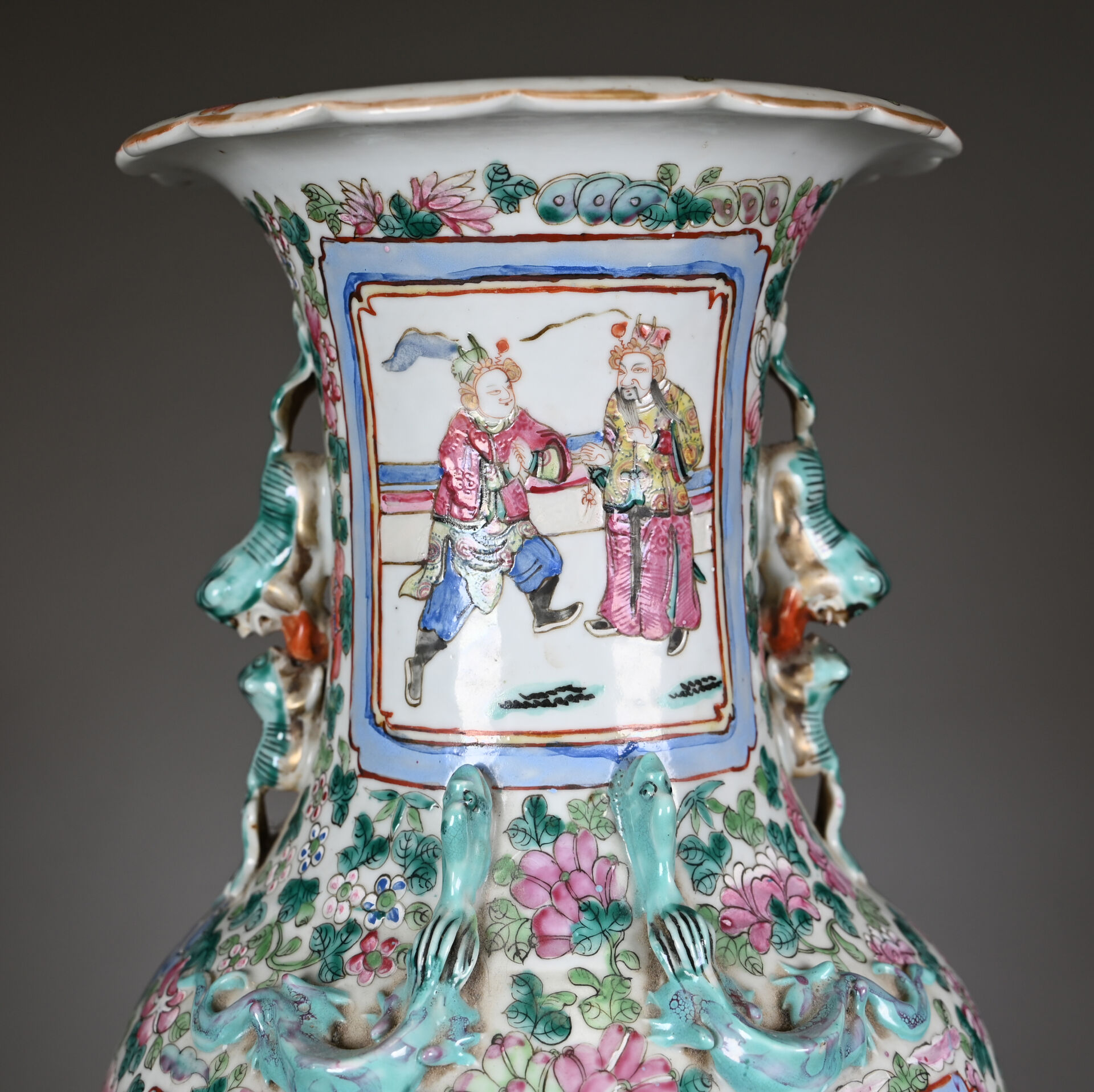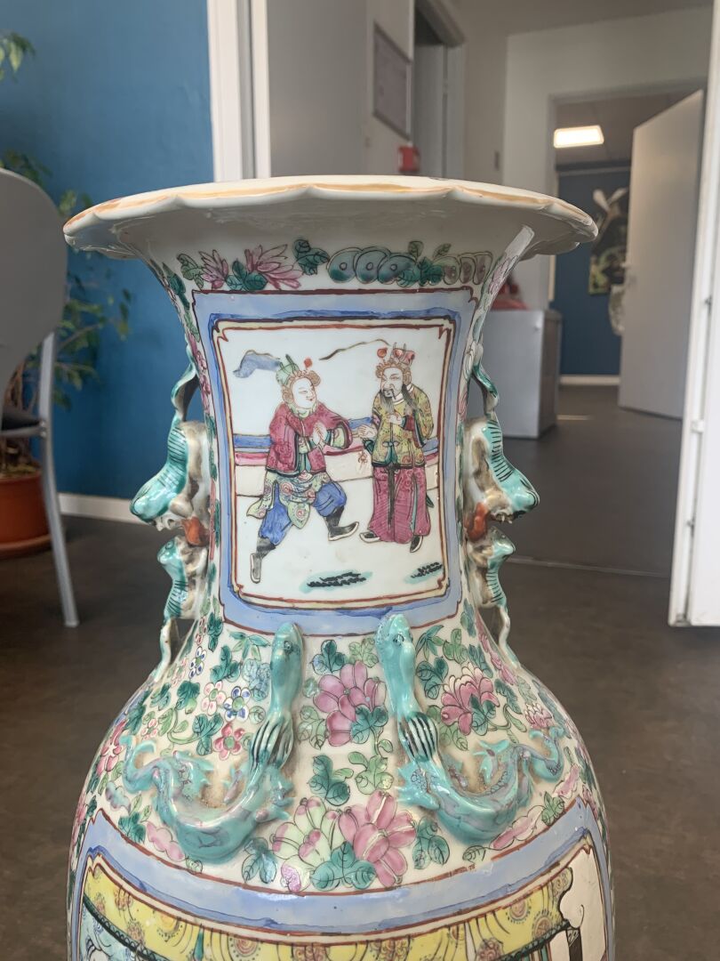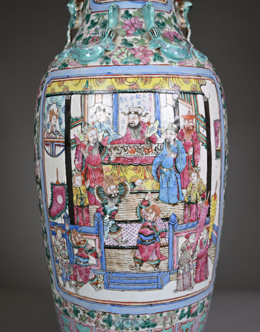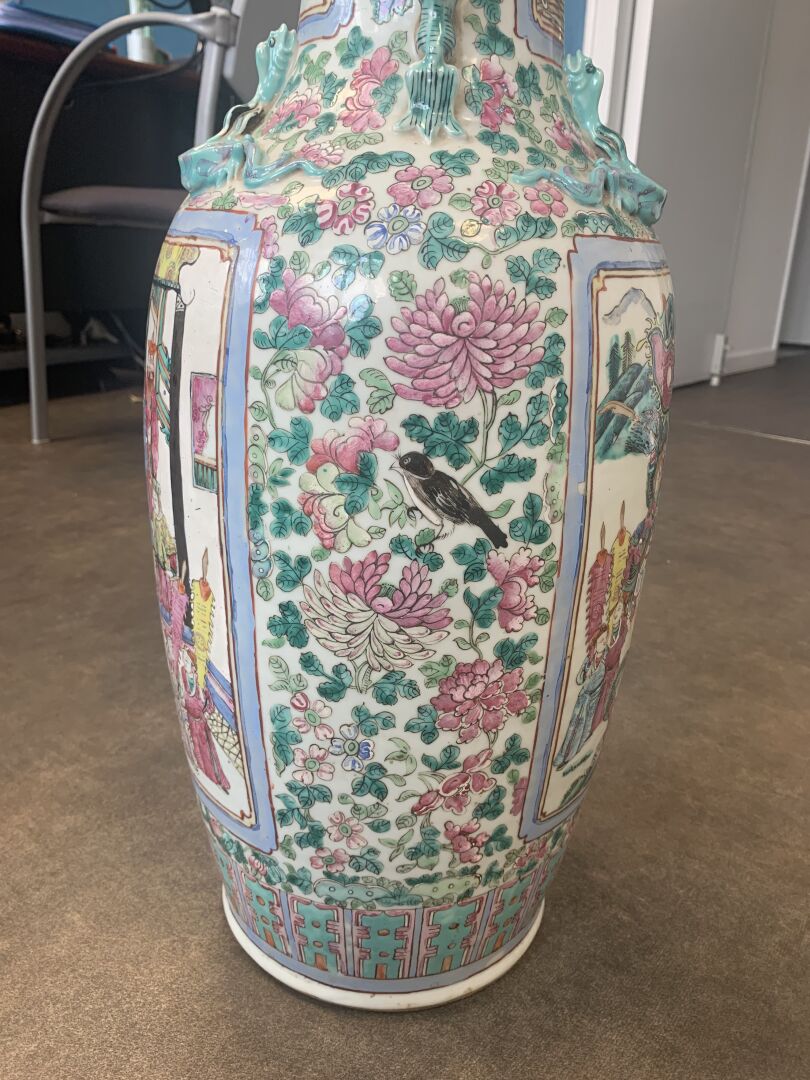 Grand vase balustre en porcelaine à décor émaillé de la famille rose de scènes de palais dans des réserves sur fond de fleurs et oiseaux. Chine, période Guangxu, circa 1880. (fêle sur la base, sauts d’émail). Haut.: 62 cm. Avec socle en bois sculpté.
