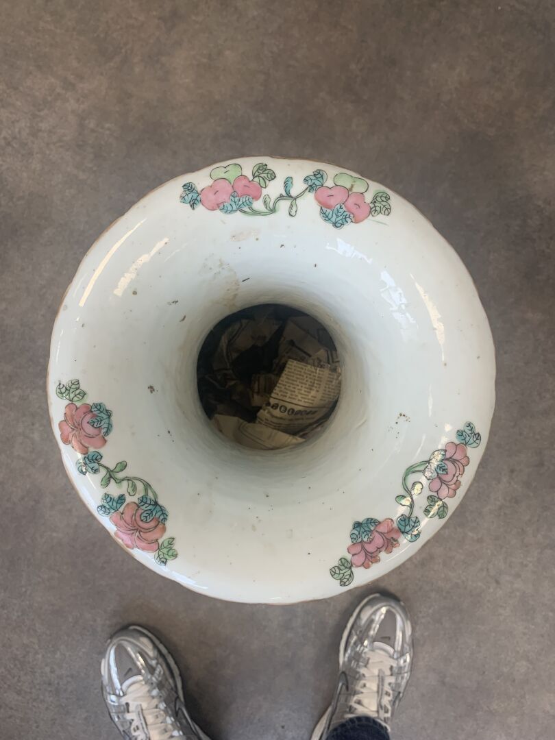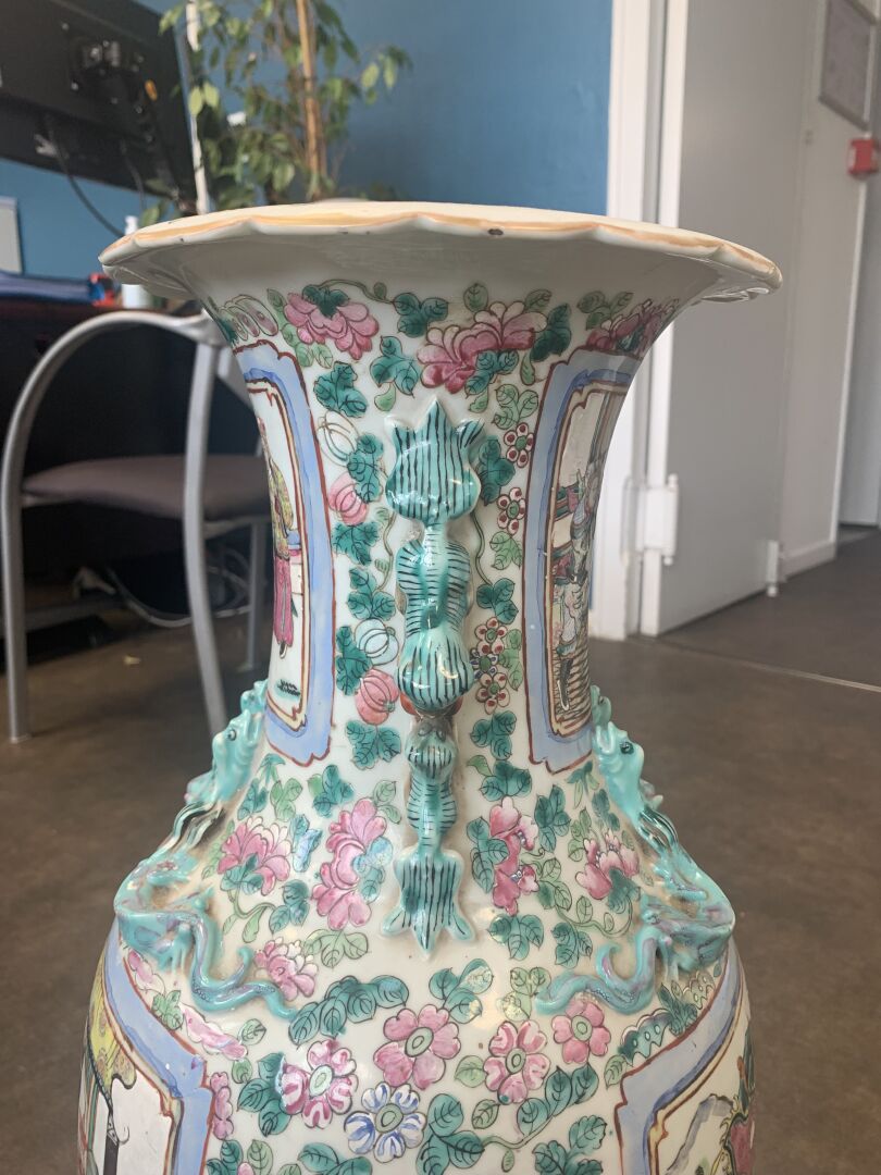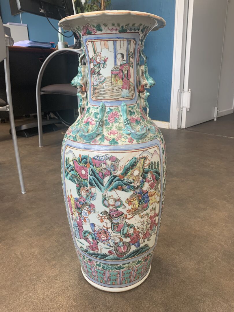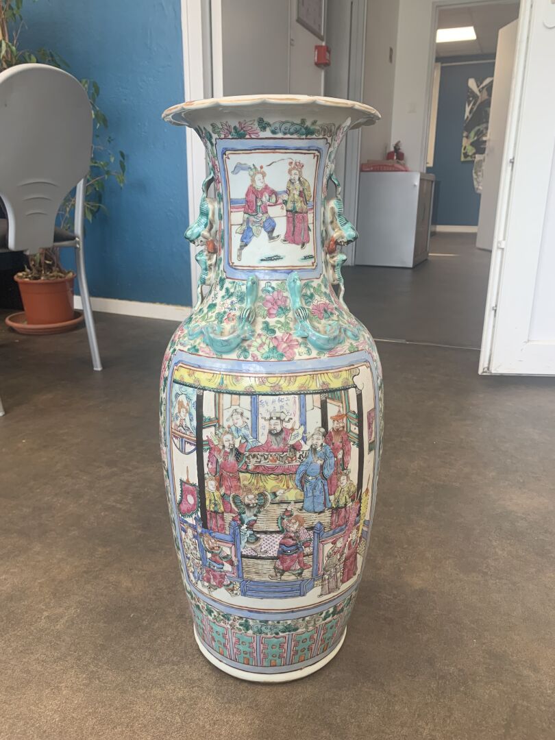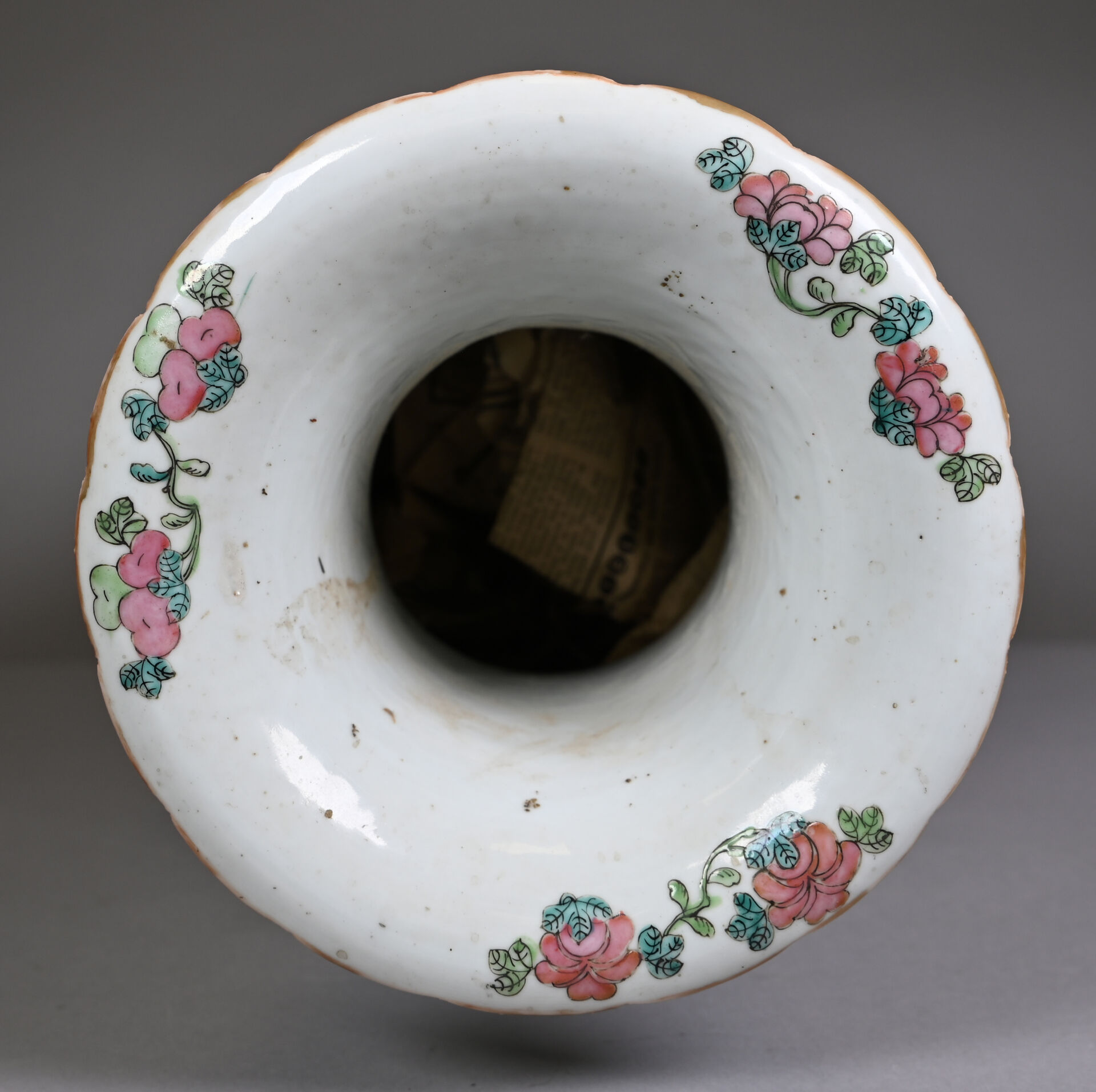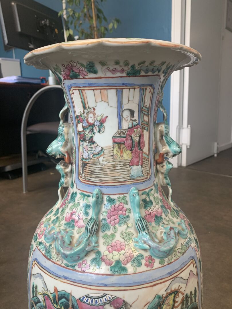 Grand vase balustre en porcelaine à décor émaillé de la famille rose de scènes de palais dans des réserves sur fond de fleurs et oiseaux. Chine, période Guangxu, circa 1880. (fêle sur la base, sauts d’émail). Haut.: 62 cm. Avec socle en bois sculpté.