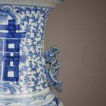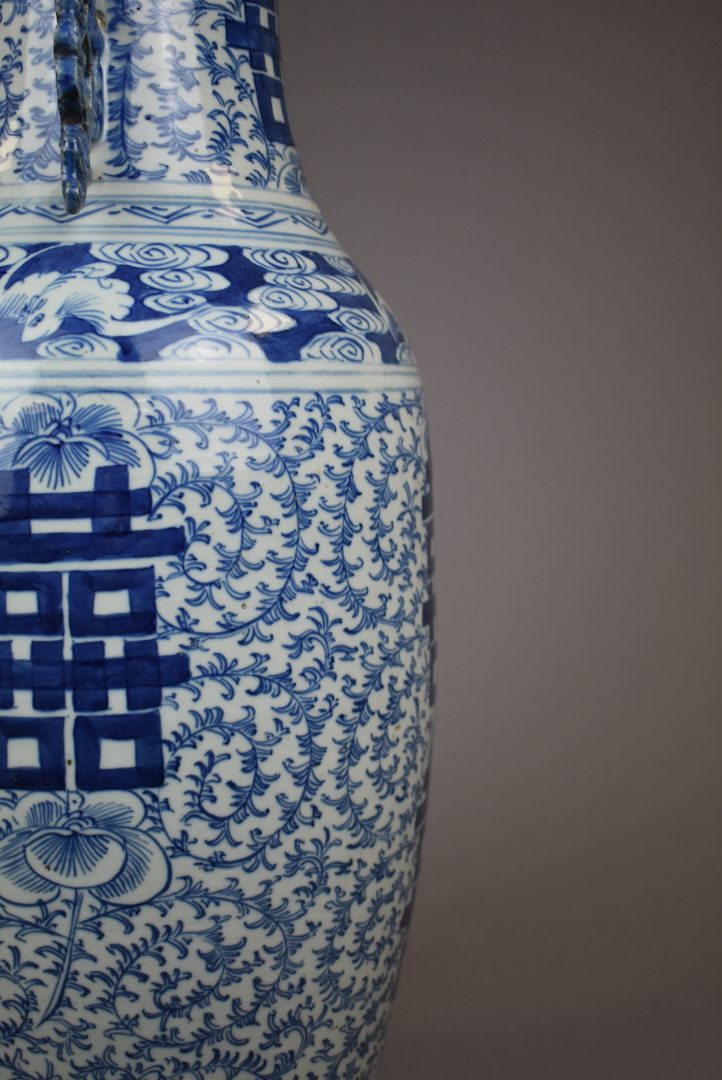 Grand vase en porcelaine à décor émaillé en bleu des symboles du bonheur (petites égrenures, 2 petits éclats au col, un accident restauré au niveau de l’anse). Les anses en formes de dragons stylisés. Chine, vers 1900. Haut. : 60,5 cm.