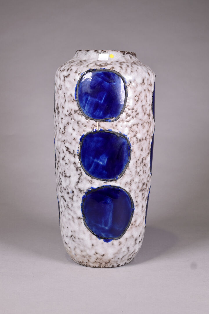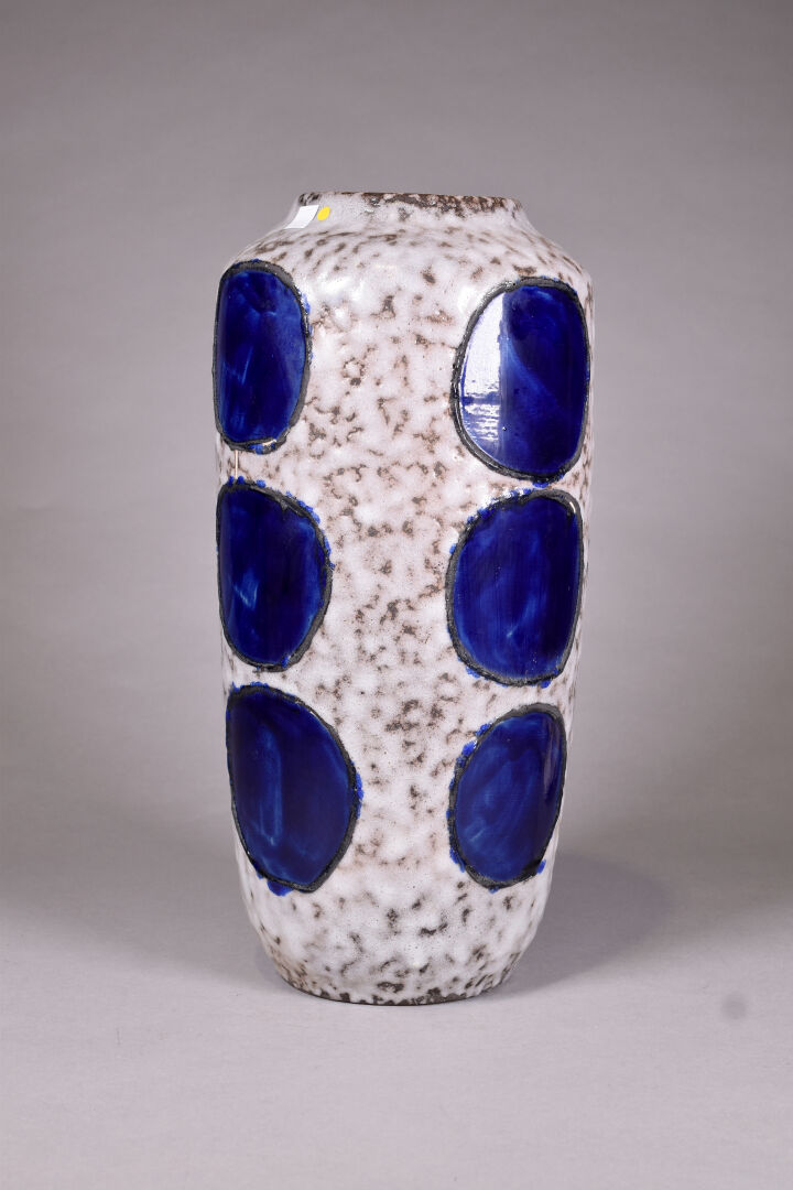 Grand vase oblong en céramique émaillée à décor de pastilles en bleu sur fond crème (un fèle sur 4 cm au col). Milieu du XXe siècle. Haut. : 45 cm.
