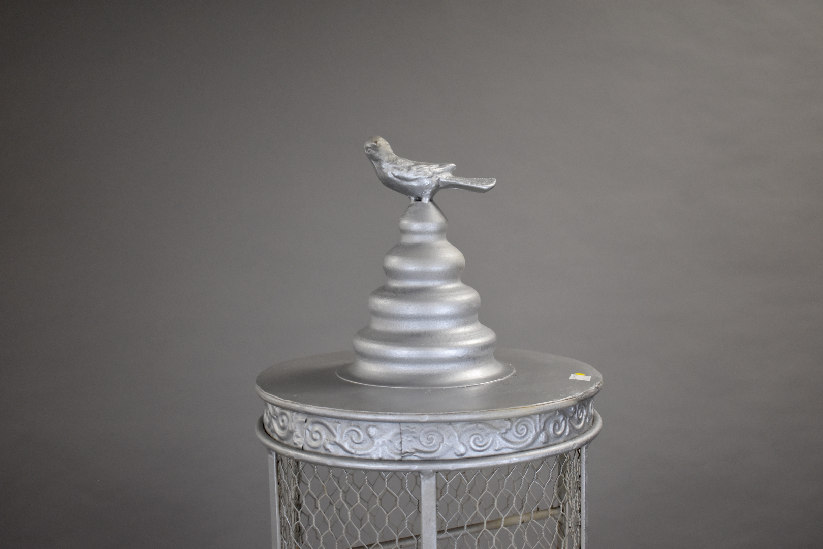 Grande cage en tole grillagée (repeinte argenté). XXe siècle. Haut. : 163 cm.