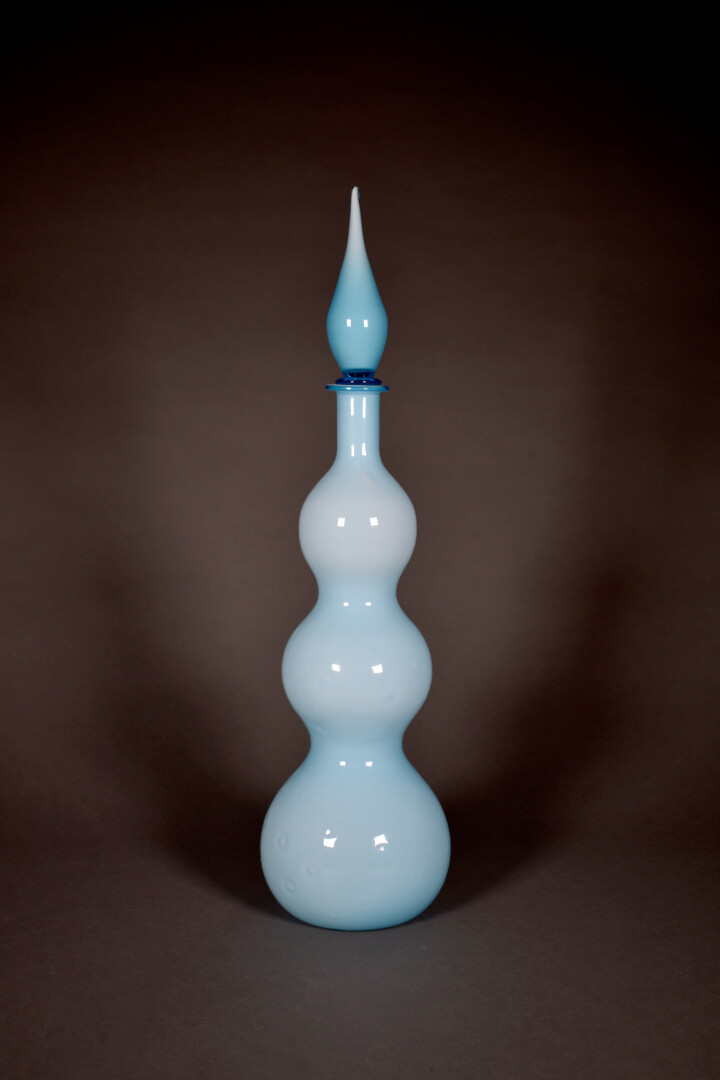 Grande carafe à trois bulbes et son bouchon en verre bleu double couche (un éclat à l’intérieur du bouchon). Murano ? Milieu du XXe siècle. Haut. : 69 cm.
