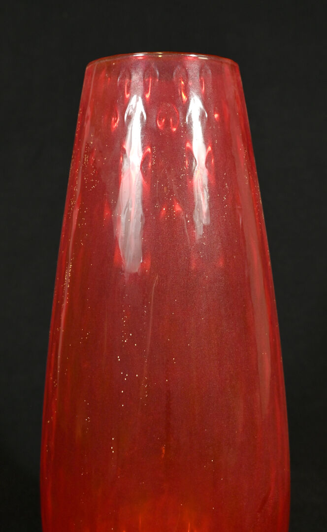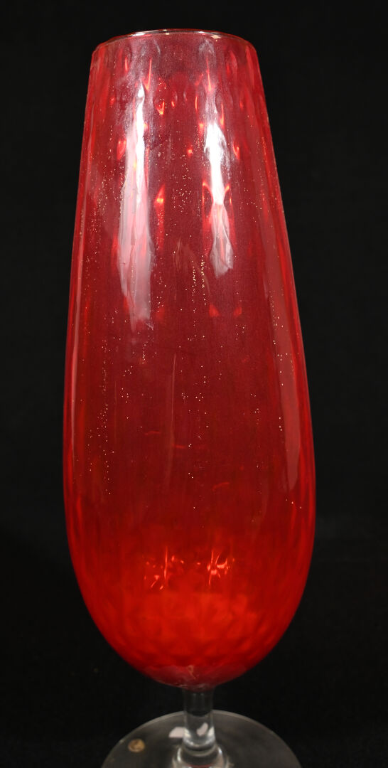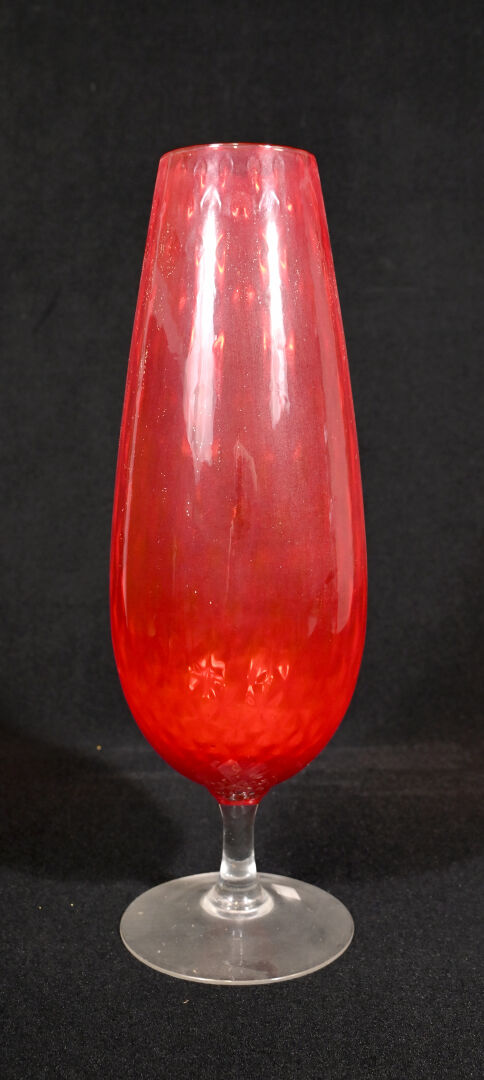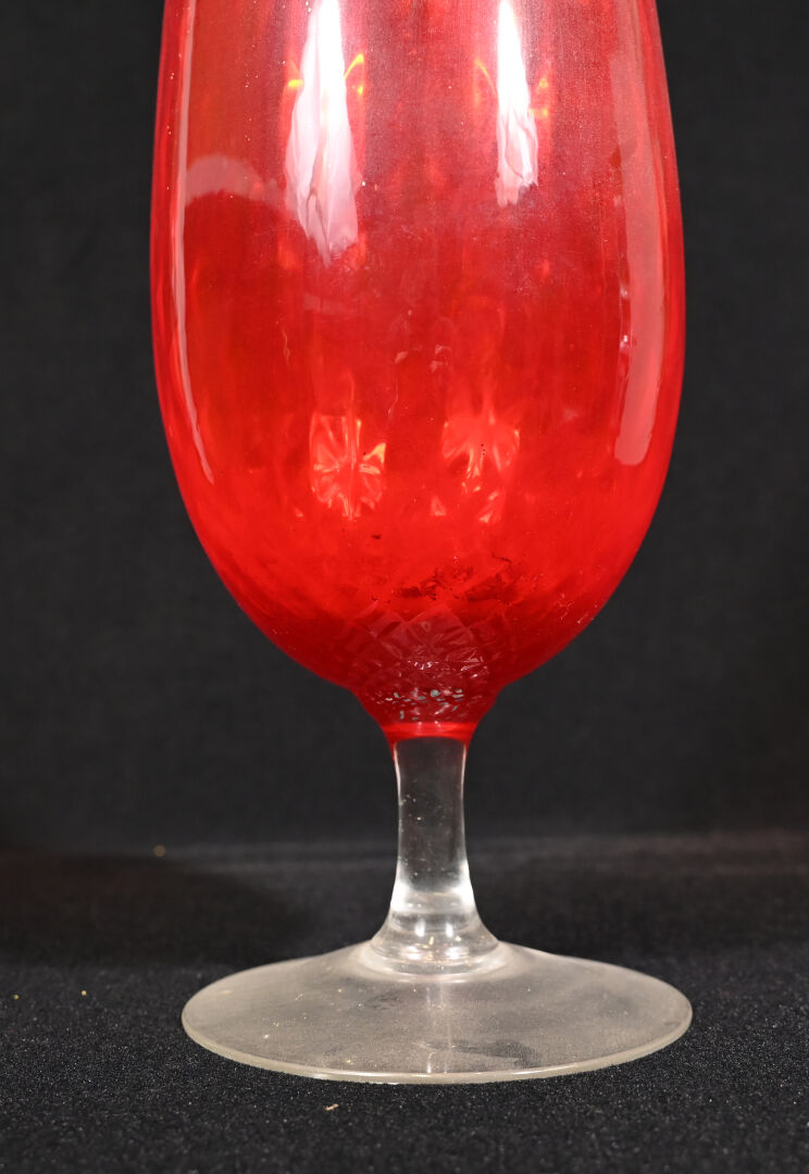 Grande coupe sur pied en verre rouge et clair. Probablement Murano, Milieu du XXe siècle. Haut. : 50 cm.