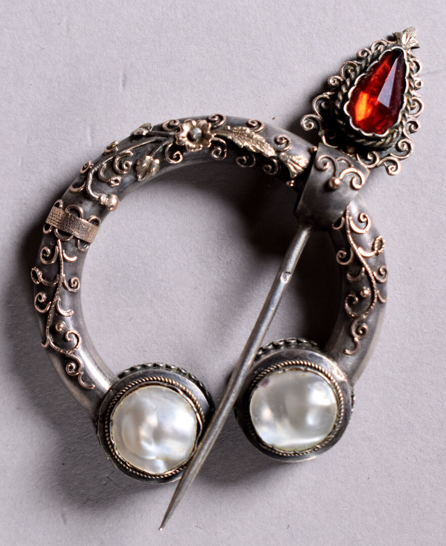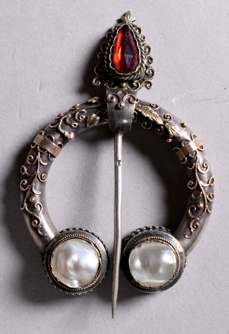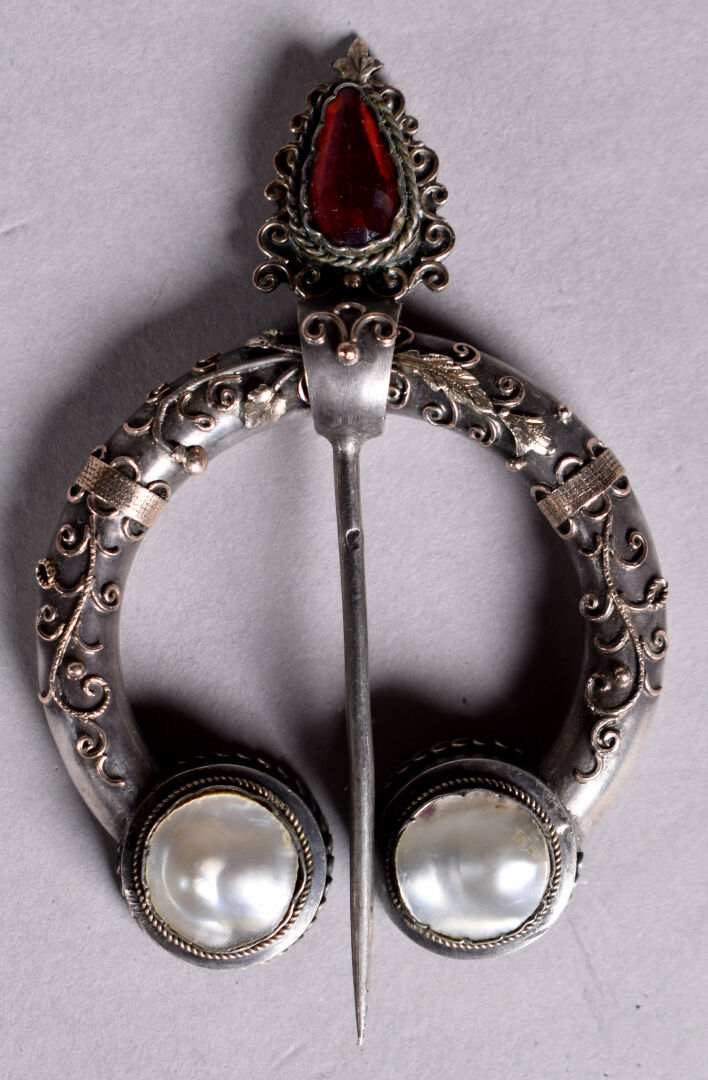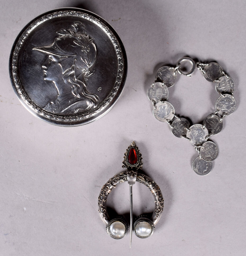 Grande fibule en argent et vermeil ornée de deux pastilles de nacre et verroterie rouge . Provence probablement XIXe siècle. On joint un bracelet en argent composé de pièces e argent montées. Poids brut total : 38 g. On joint une petite boite en métal argenté à décor d’une minerve.