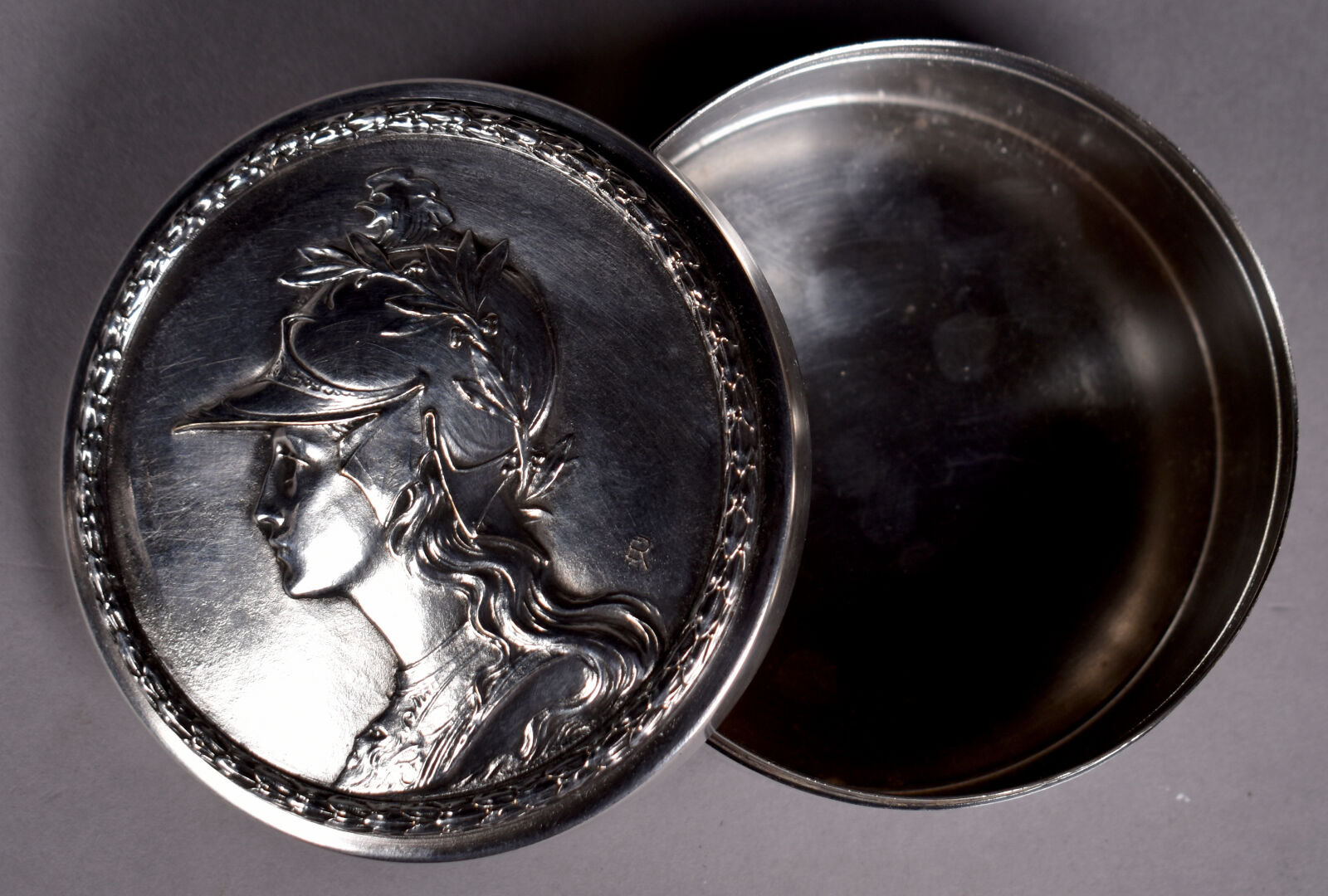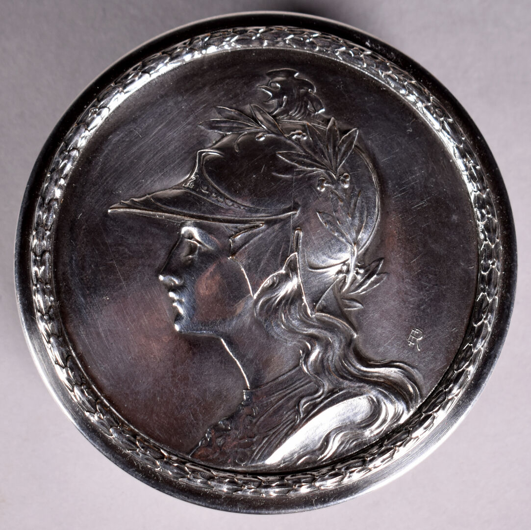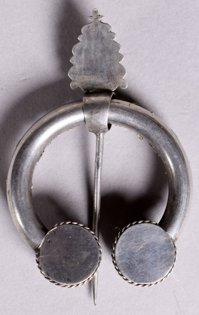 Grande fibule en argent et vermeil ornée de deux pastilles de nacre et verroterie rouge . Provence probablement XIXe siècle. On joint un bracelet en argent composé de pièces e argent montées. Poids brut total : 38 g. On joint une petite boite en métal argenté à décor d’une minerve.