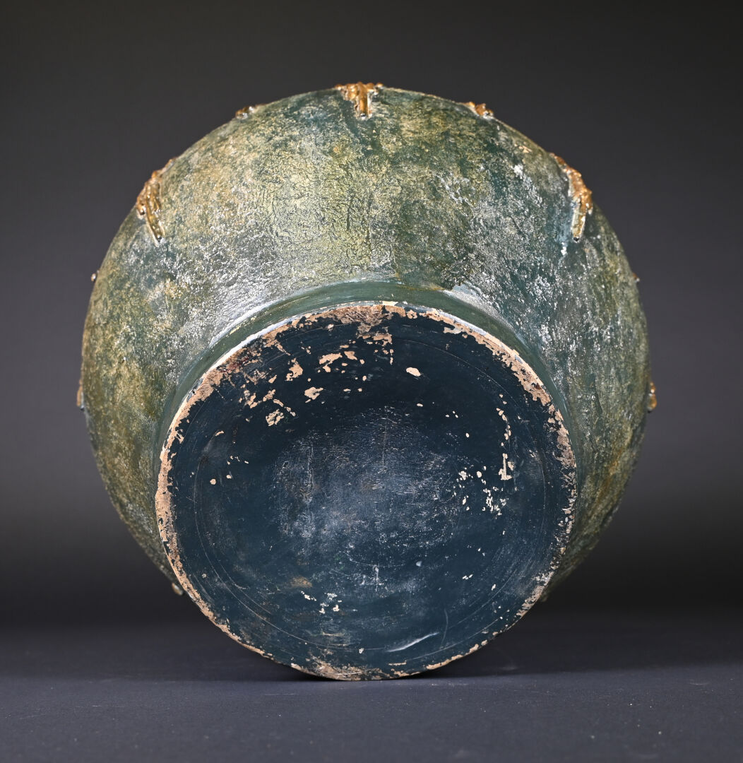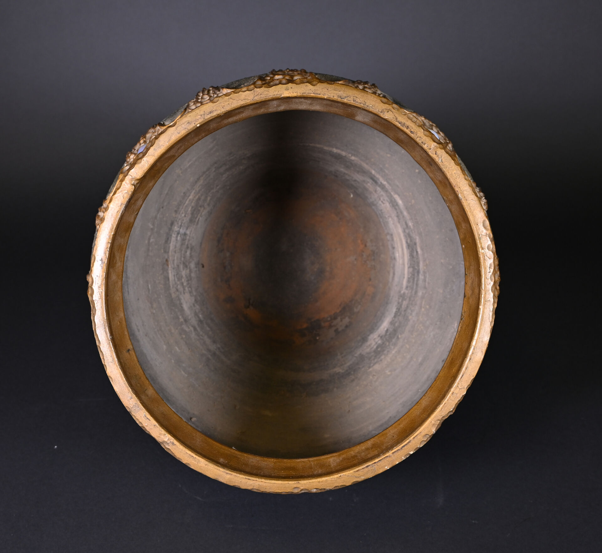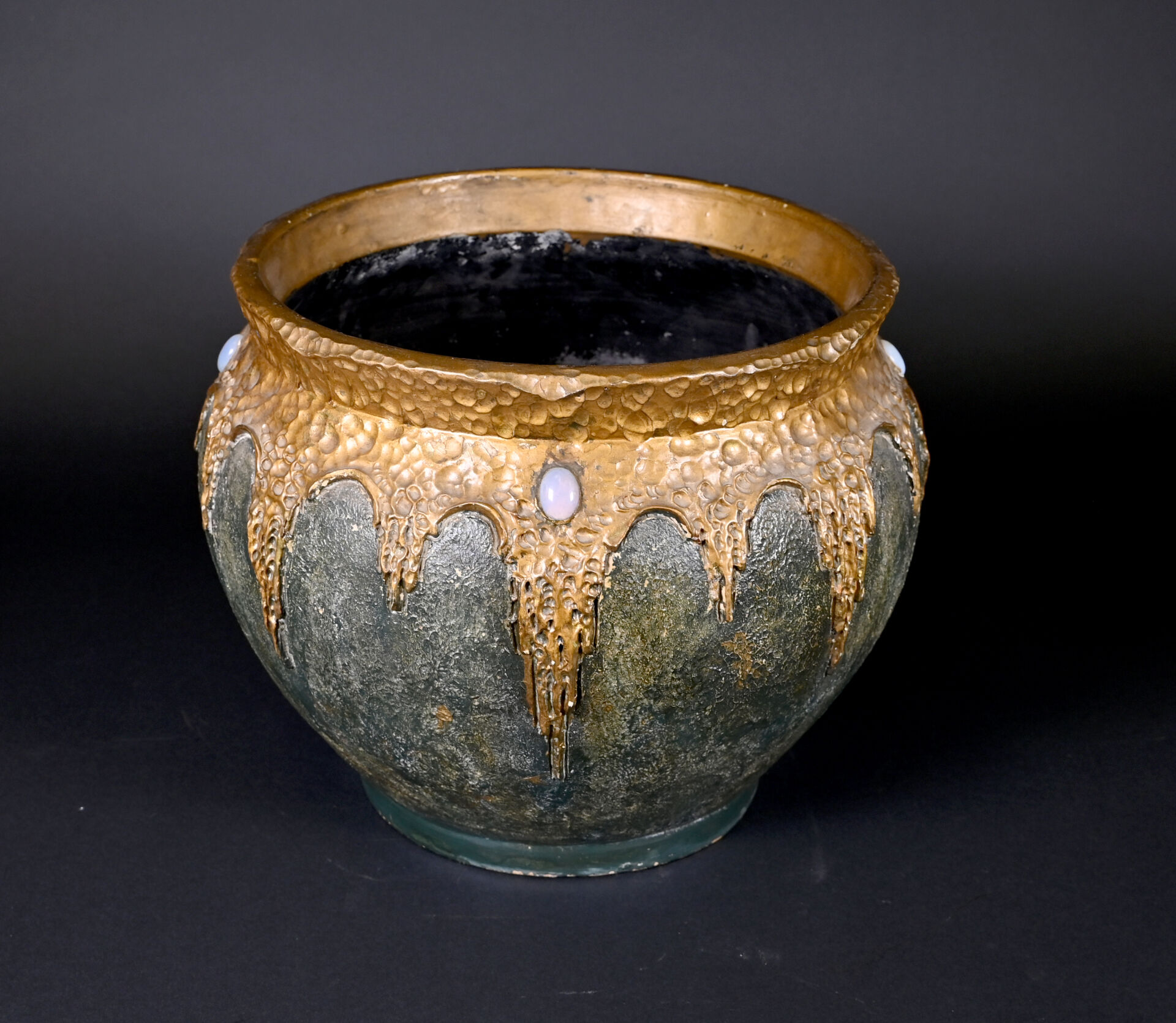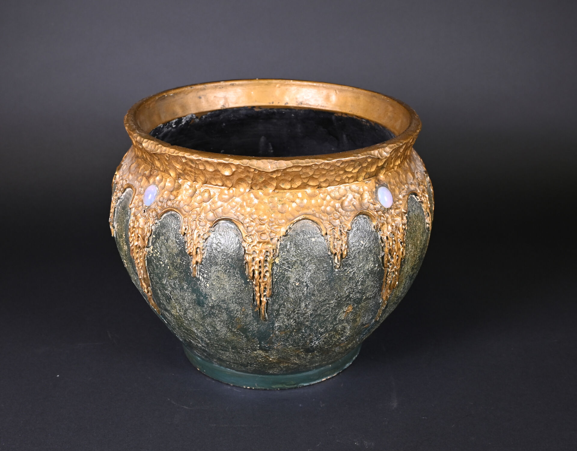 Grande jarre en céramique émaillée de coulures à cabochons de verre à l’imitation de l’opale (petits éclats). Epoque Art Nouveau. Haut. : 28,5 cm – Diam. : 35 cm.