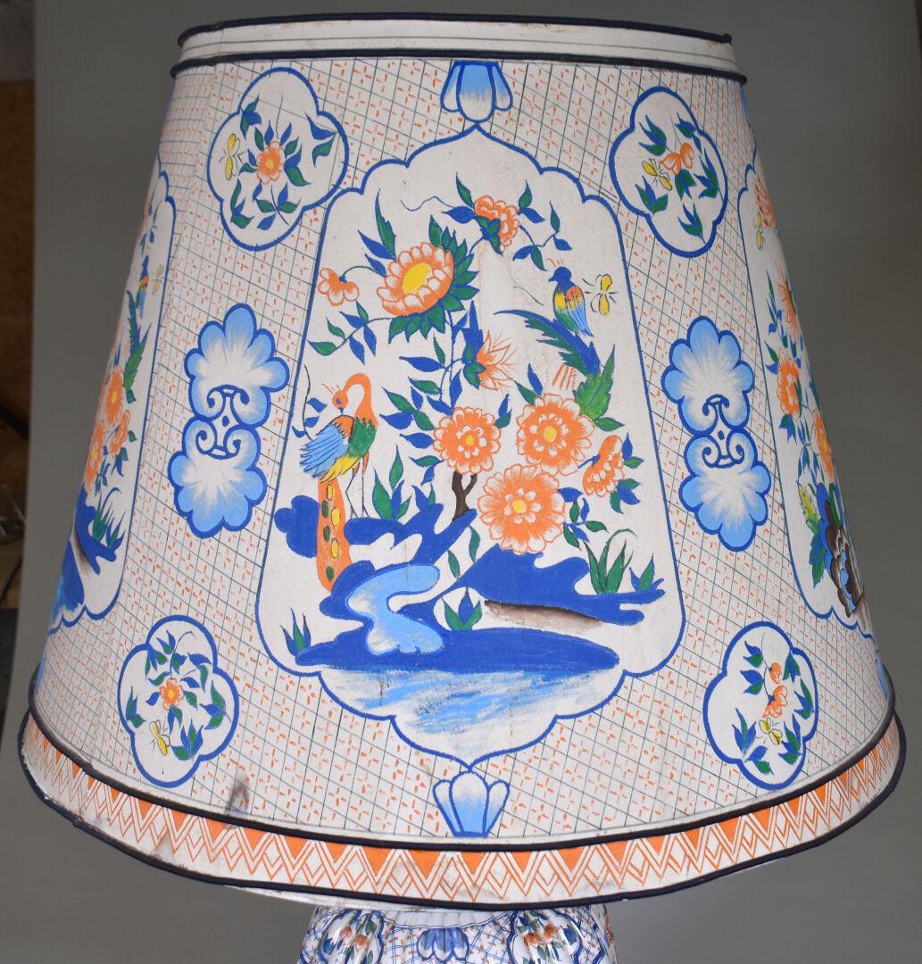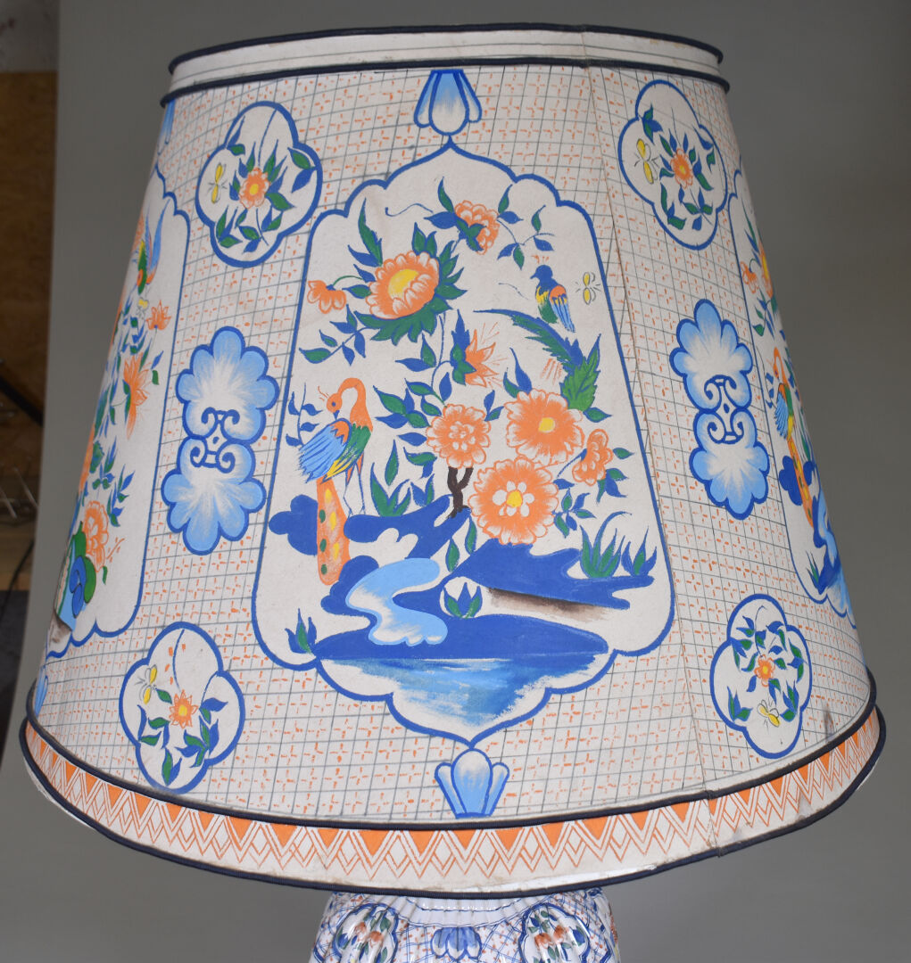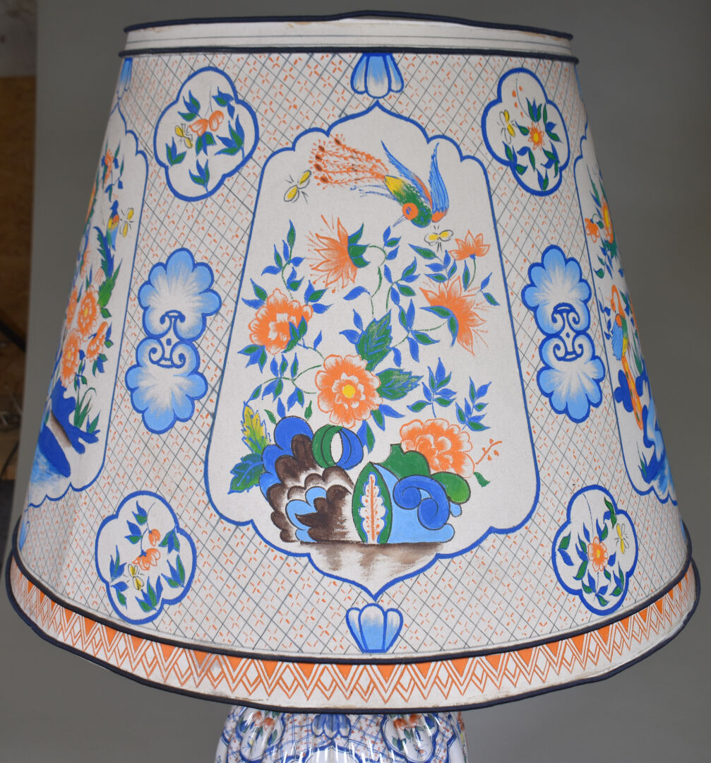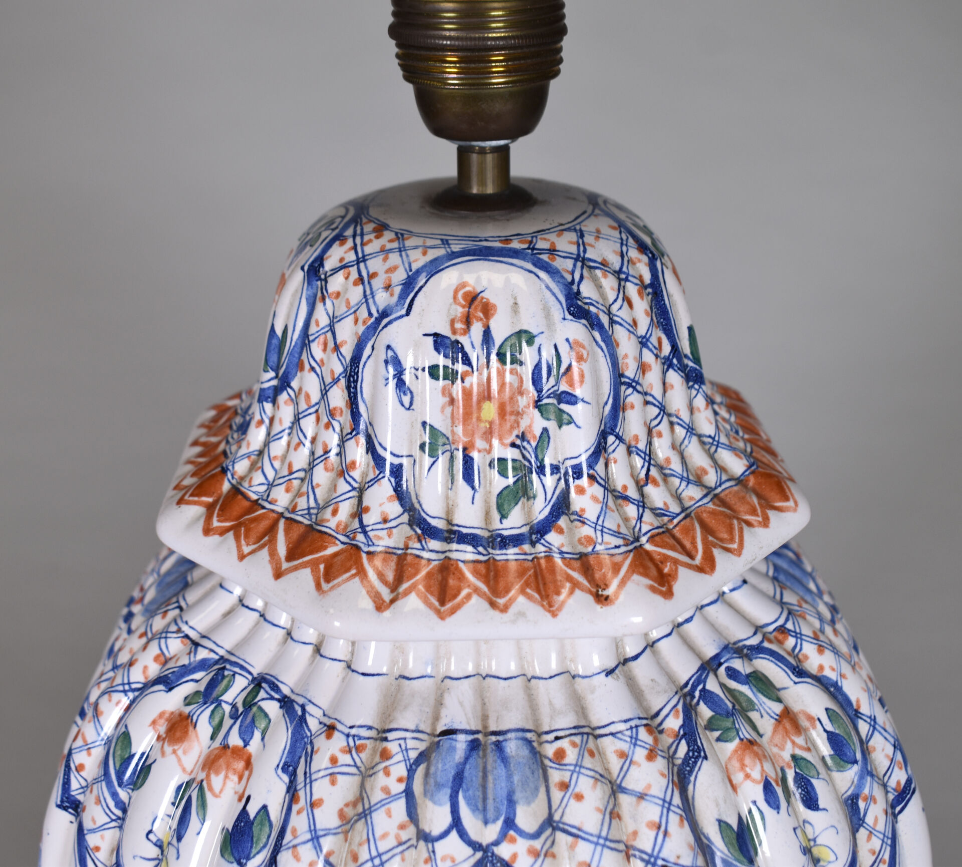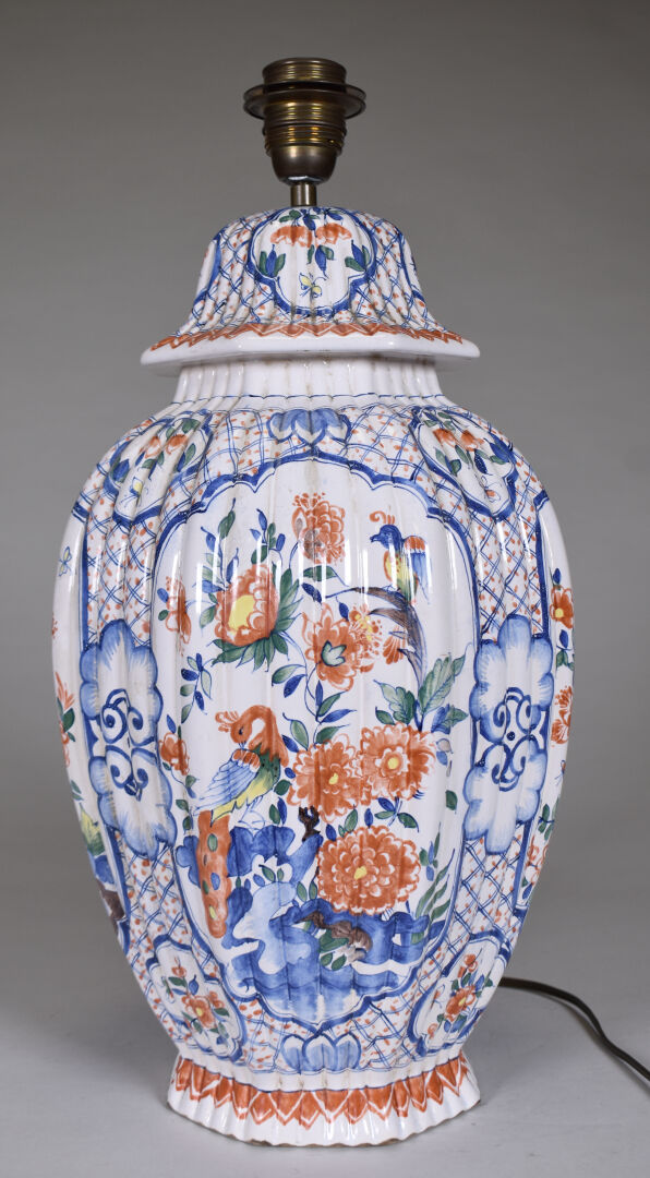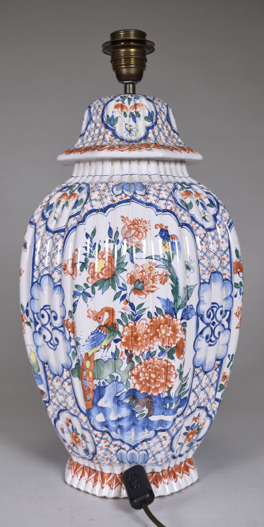 Grande lampe à poser en faïence à l’imitation d’une potiche couverte à godrons à décor de grand feu de fleurs et oiseaux dans des réserves sur fond de croisillons. Dans le goût de Delft. Haut. : 52 cm (avec douille). Abat-jour au modèle.