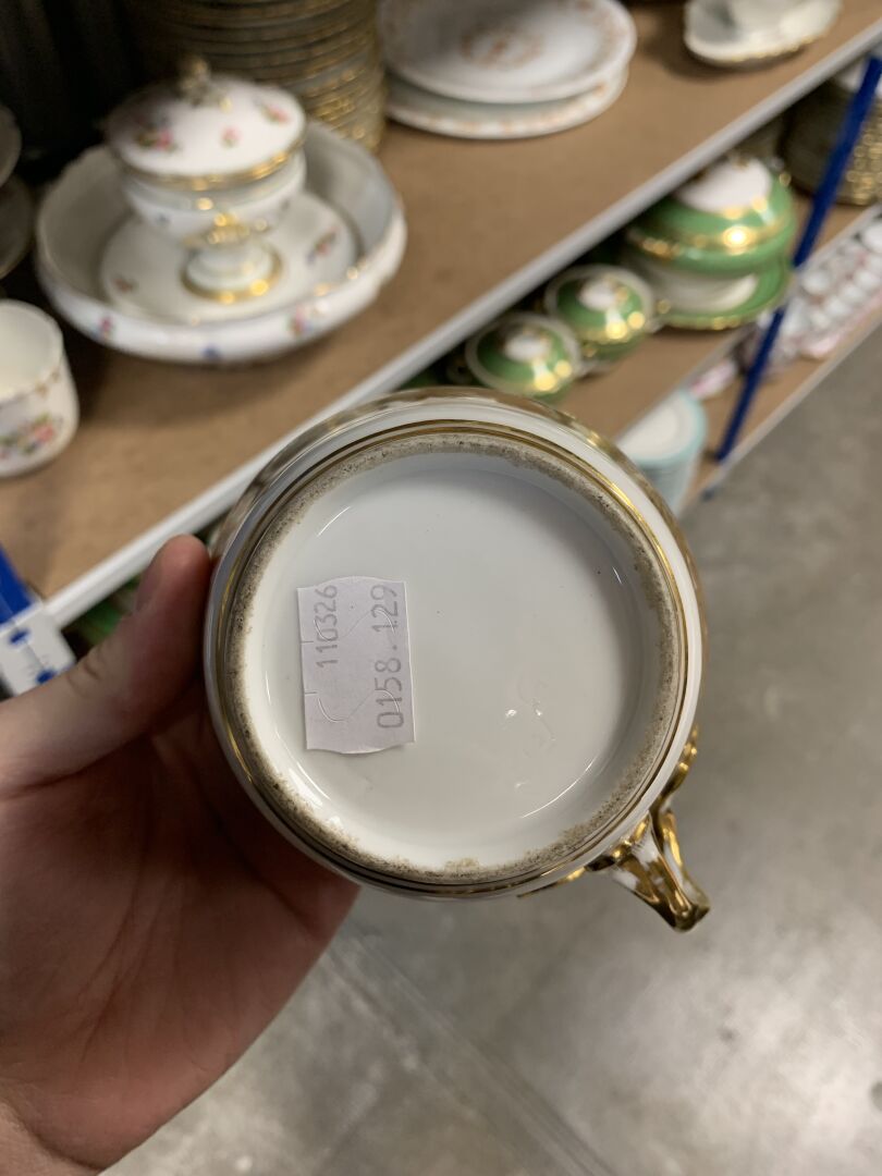Grande tasse à chocolat couverte en porcelaine dans le goût de Meissen production fin XVIIIe siècle. Pas de marque sous la pièce. Décor floral polychrome et dorure nuancée en frise d’acanthes et rinceaux feuillagés. Couvercle chiffré. Petit éclat sur la prise du couvercle. H : 14,5 cm.