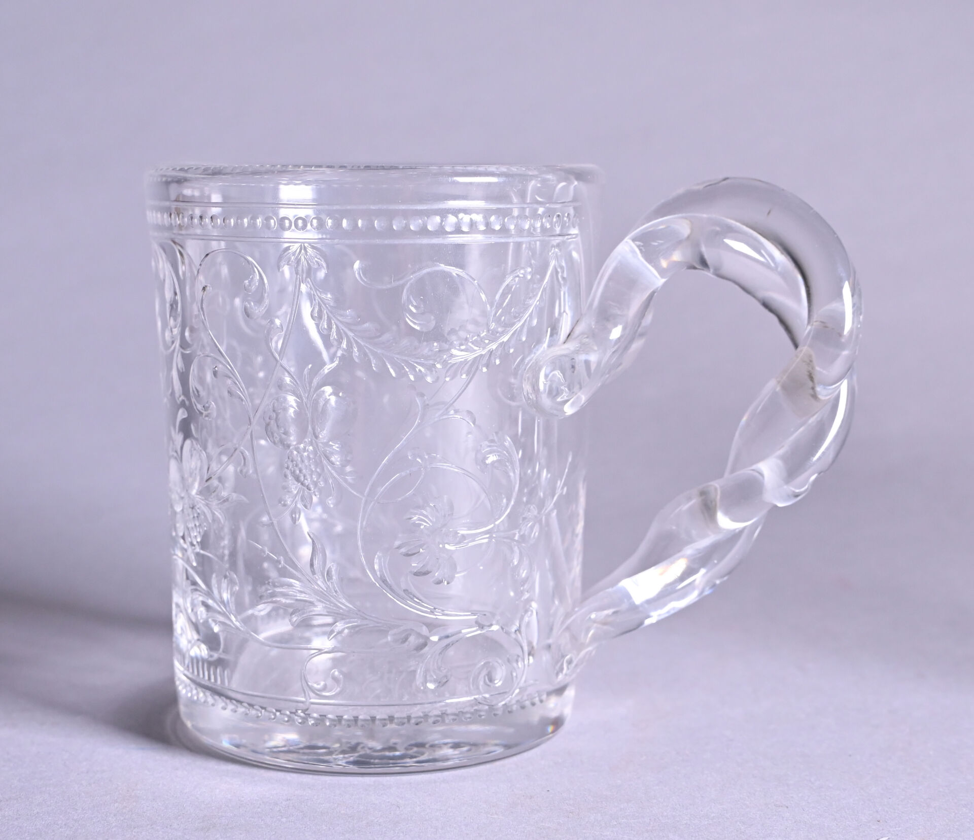 Grande tasse et sa sous-tasse en cristal à décor gravé de guirlandes, consoles feuillagées, fruits, frises de perles (un éclat). L’anse en double torsade. Monogrammée MM. Fin du XIXe ou début du XXe siècle. Haut. : 12 cm – Diam. : 20 cm.