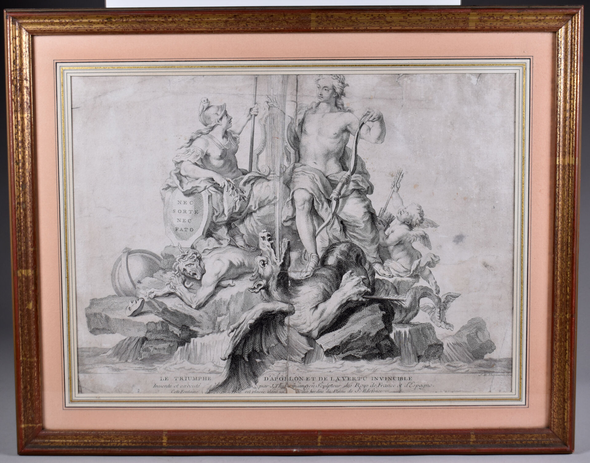 Gravé par THOMASSIN. Fontaine « Le Triumphe d’Apollon et de la vertu invincible ». Gravure en noir (pliures, salissures et petite déchirure). 31,5 x 43,5 cm.