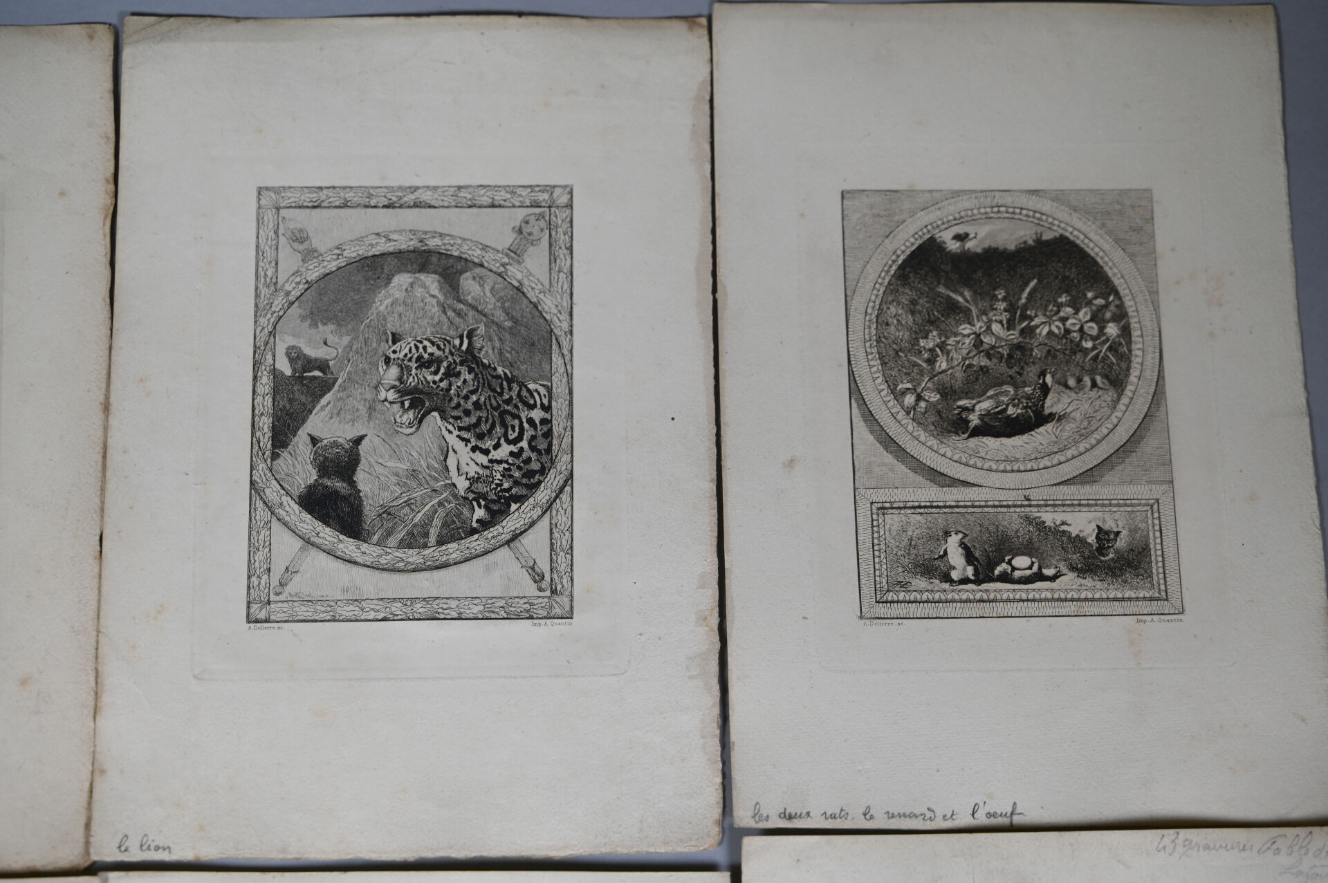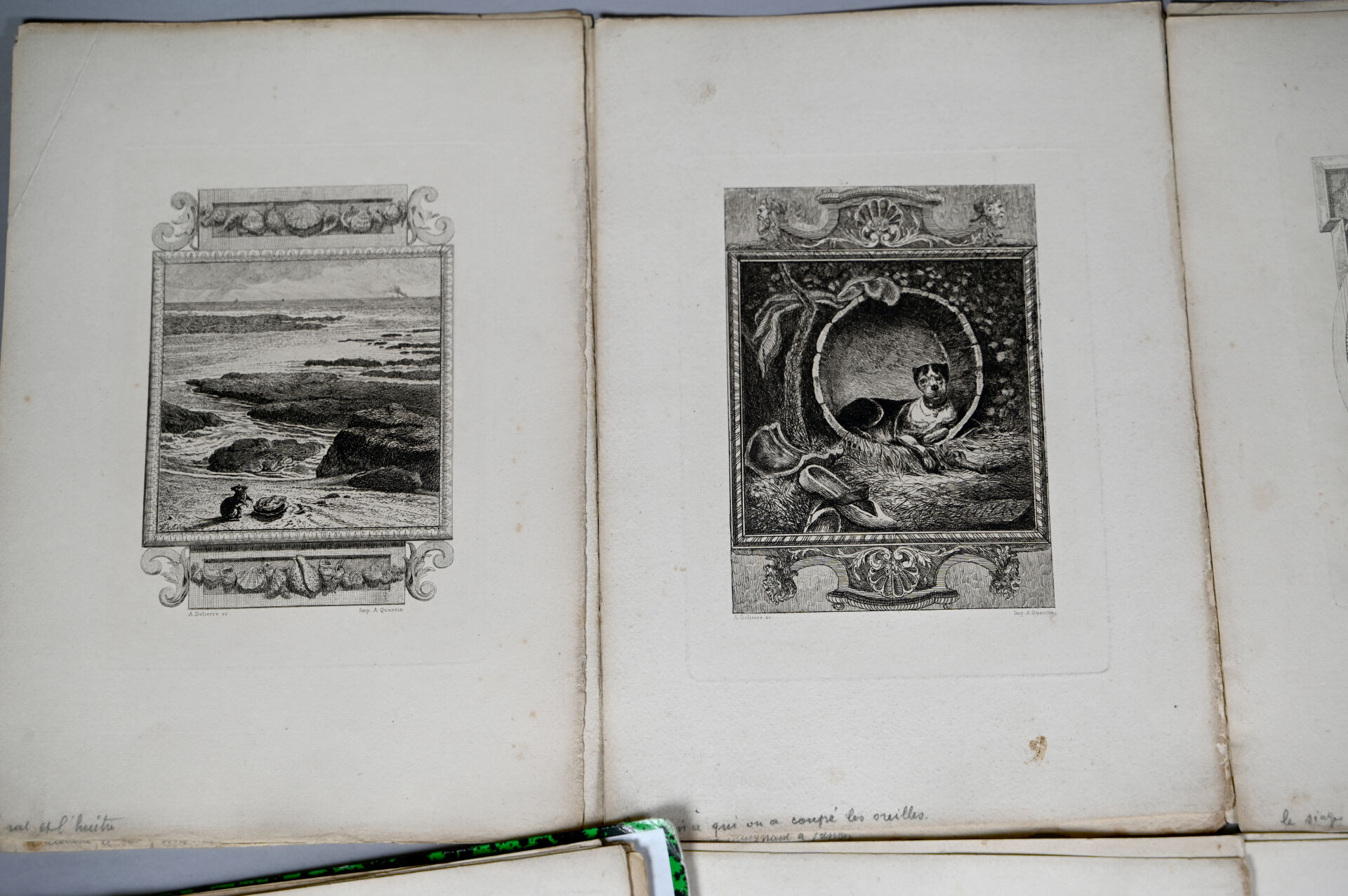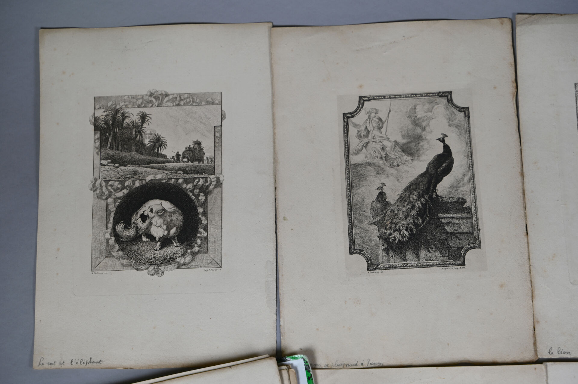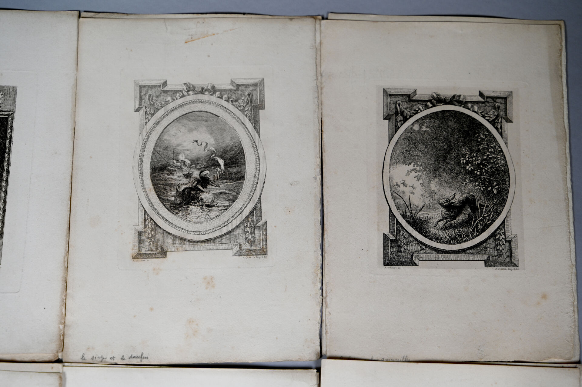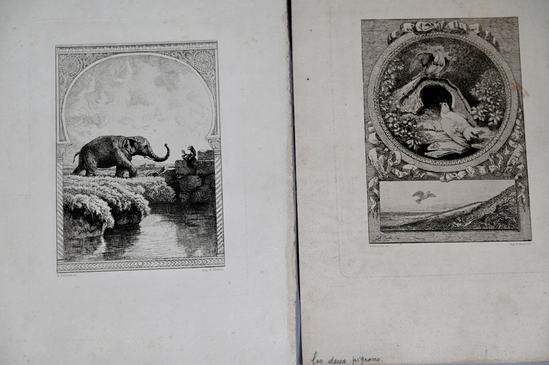 Gravées par Auguste DELIERRE. Ensemble de 29 gravures représentant les fables de La Fontaine, non encadrées (rousseurs). Format d’un feuillet 33 x22,5 cm.