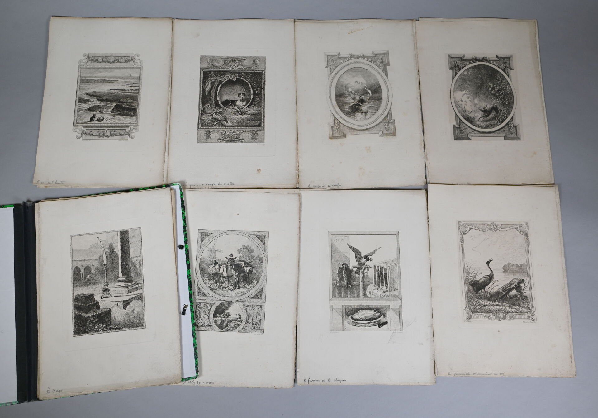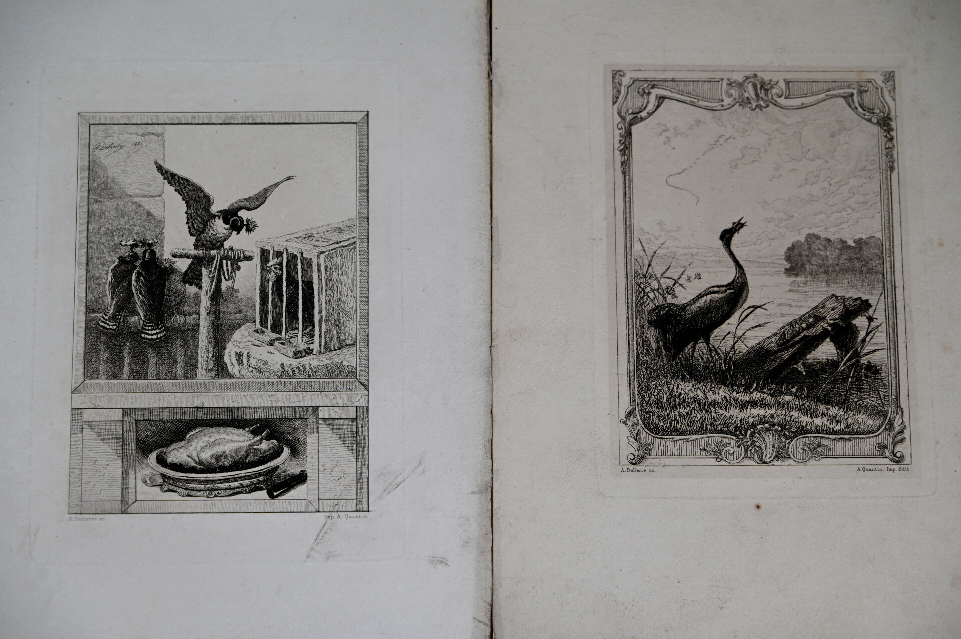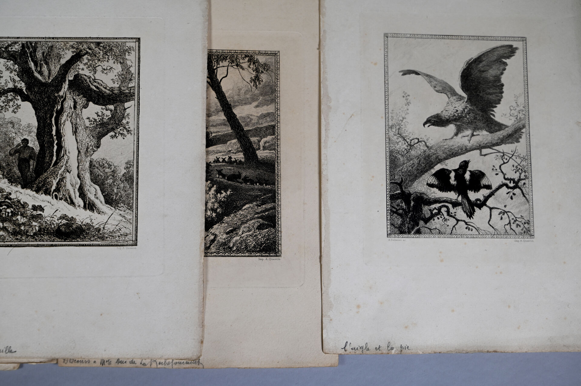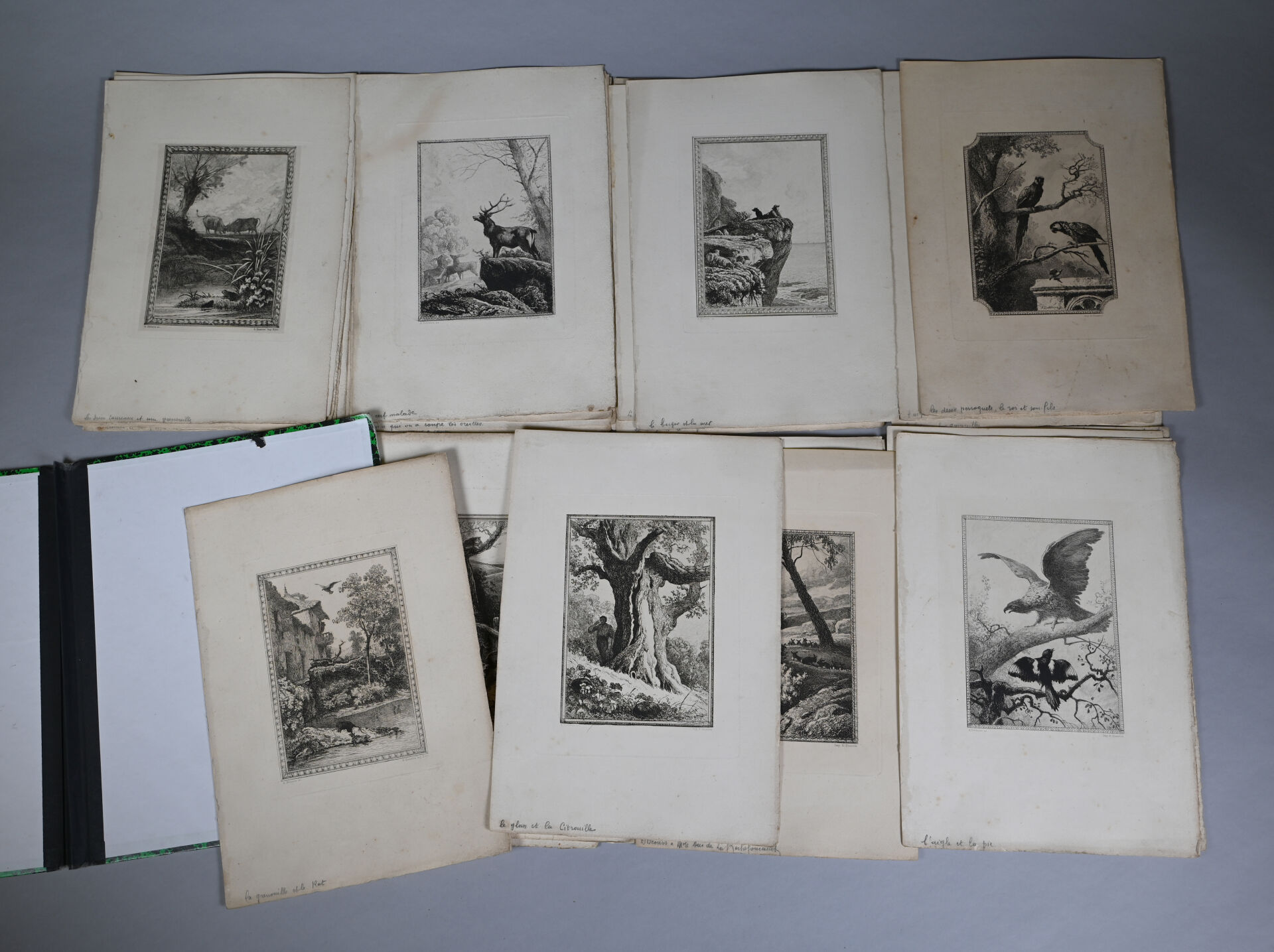 Gravées par Auguste DELIERRE. Ensemble de 29 gravures représentant les fables de La Fontaine, non encadrées (rousseurs). Format d’un feuillet 33 x22,5 cm.