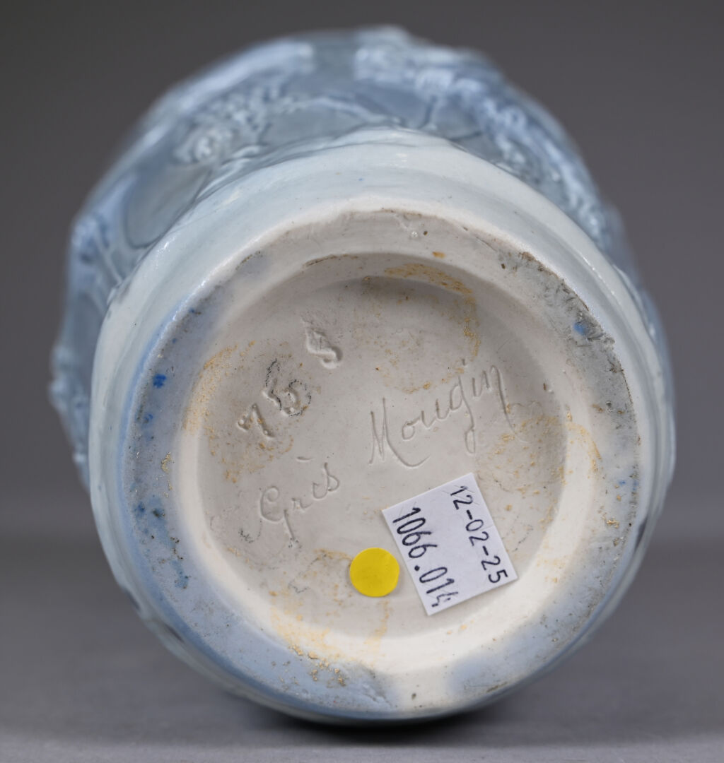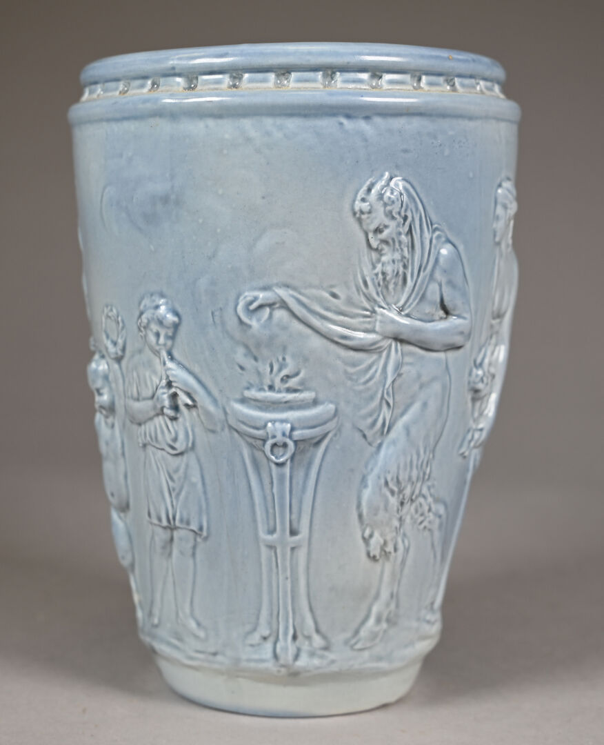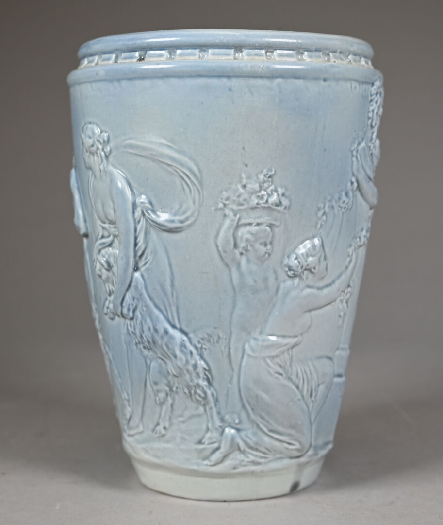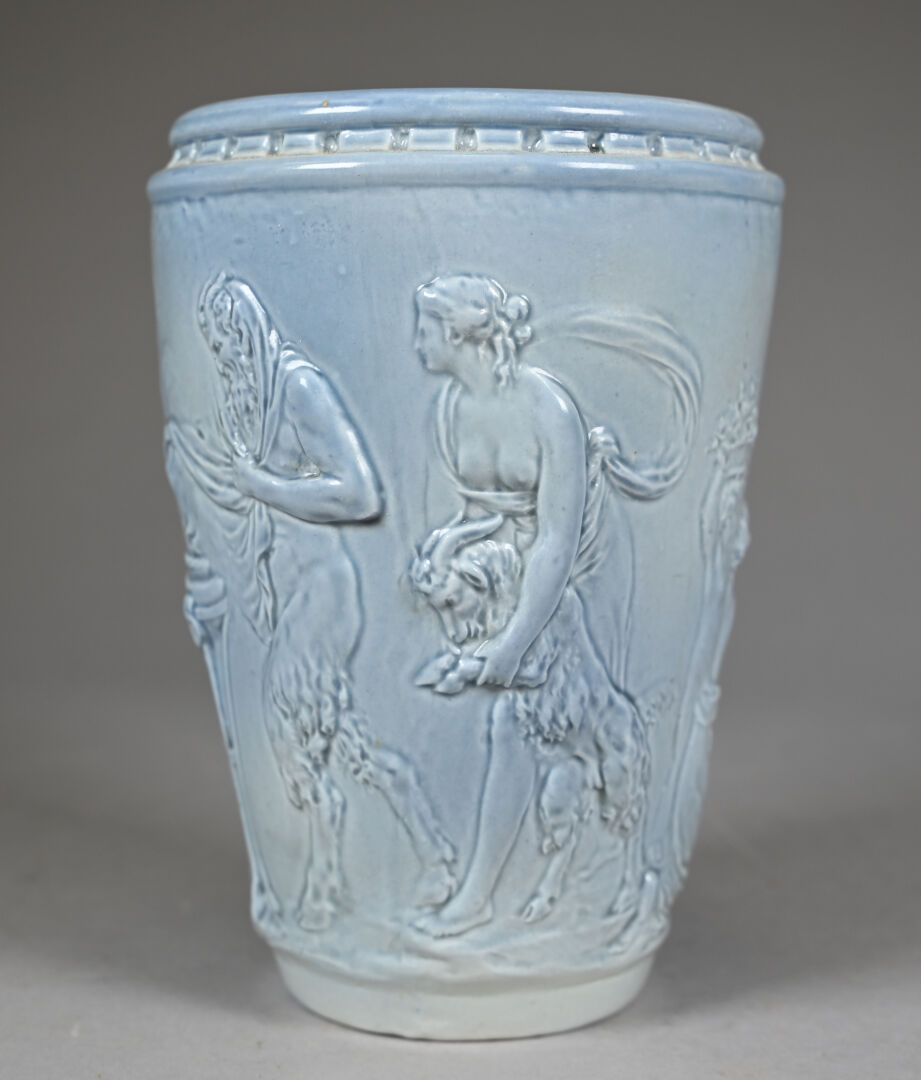 GRES MOUGIN. Vase légèrement cornet en grès émaillé bleu ciel à décor en relief d’une bacchanale. Haut. : 21 cm.