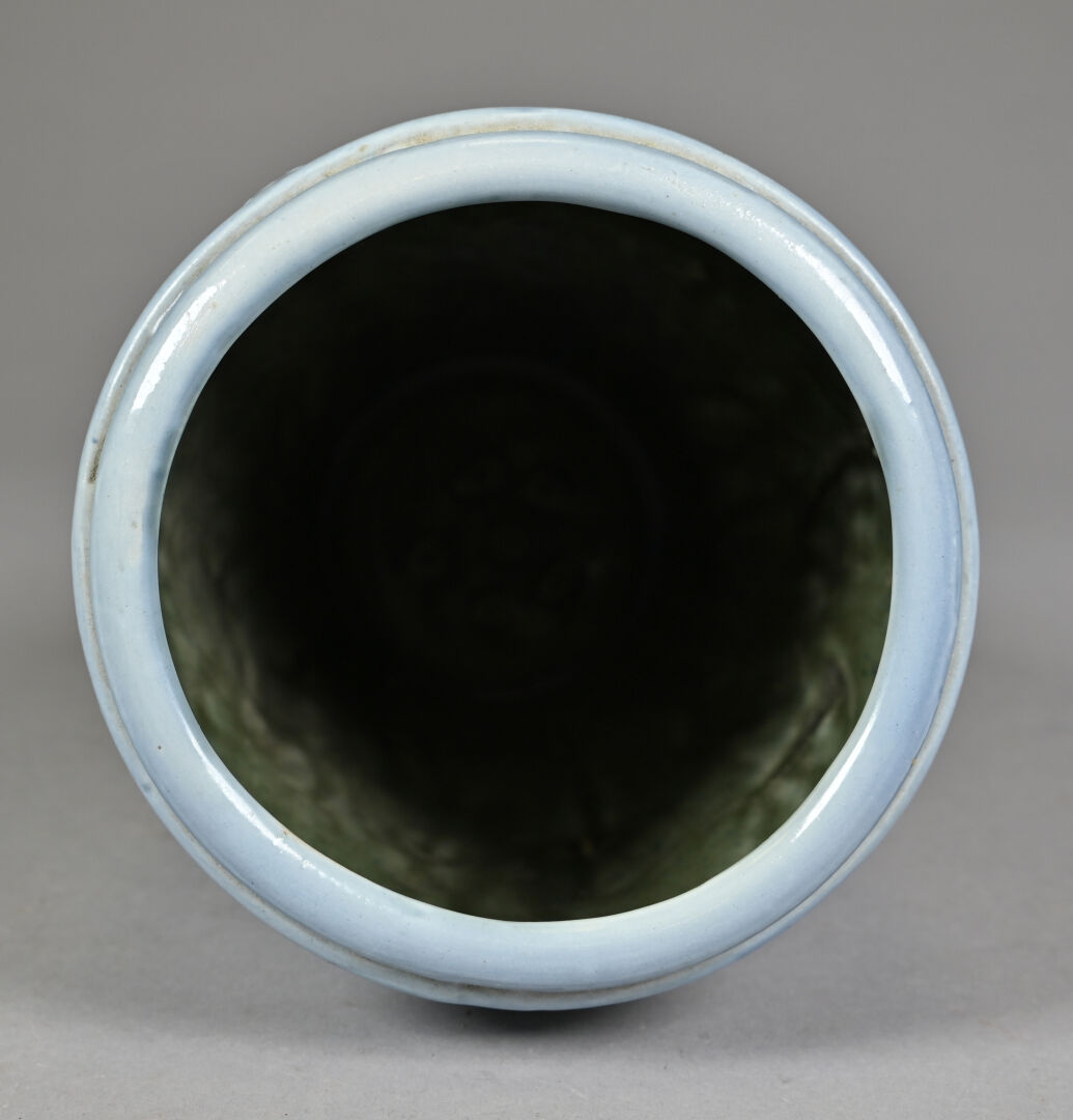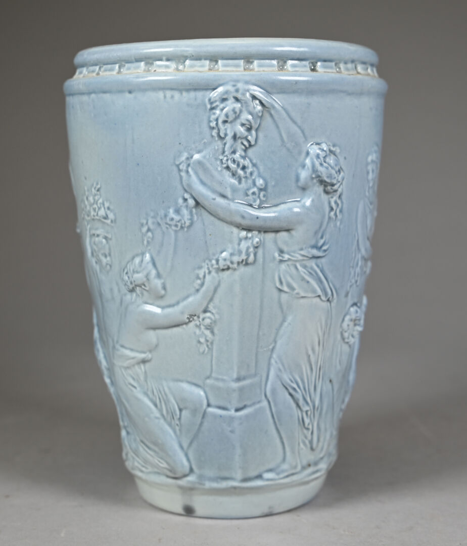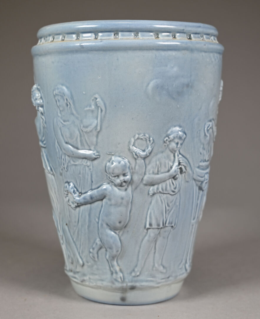 GRES MOUGIN. Vase légèrement cornet en grès émaillé bleu ciel à décor en relief d’une bacchanale. Haut. : 21 cm.