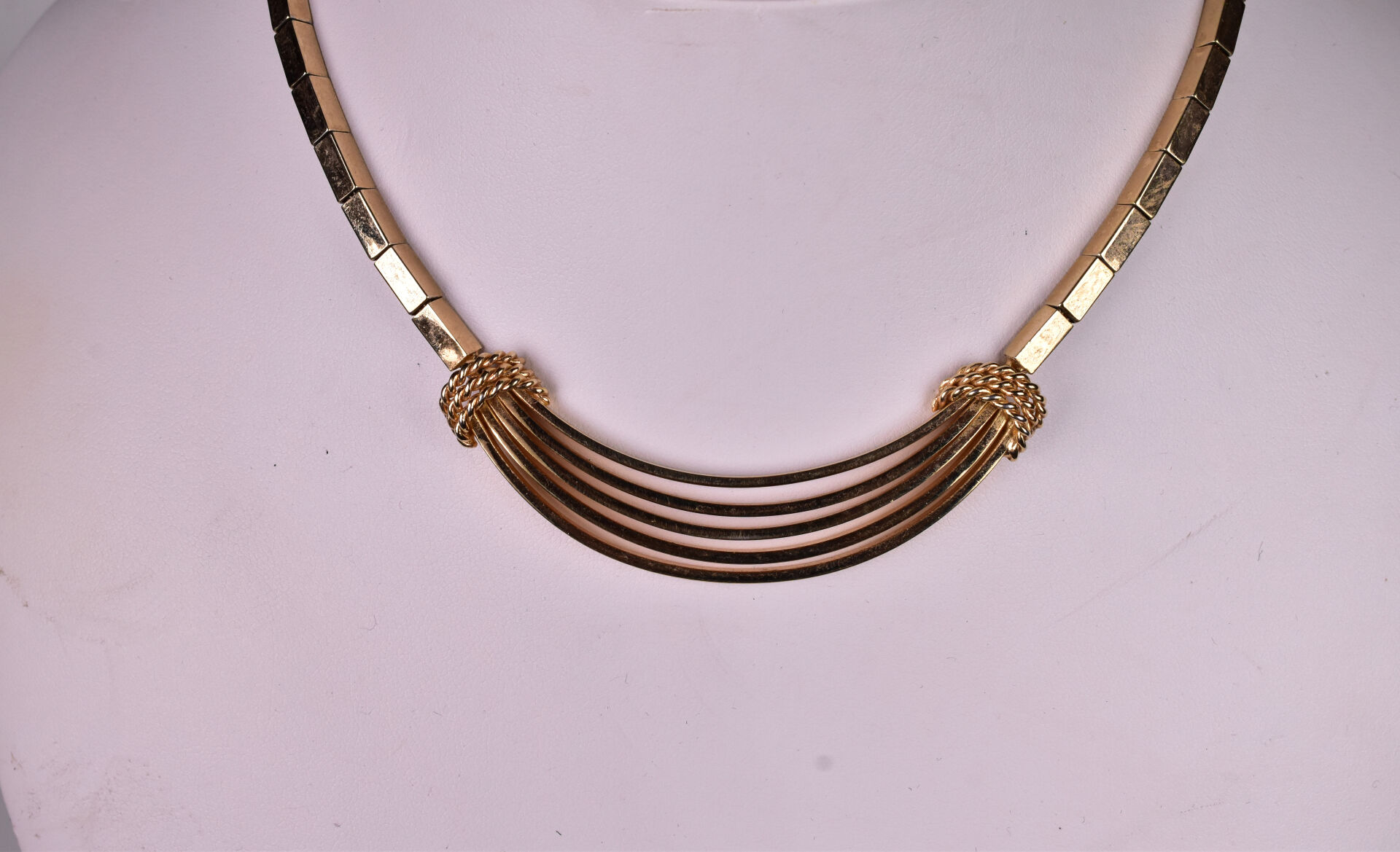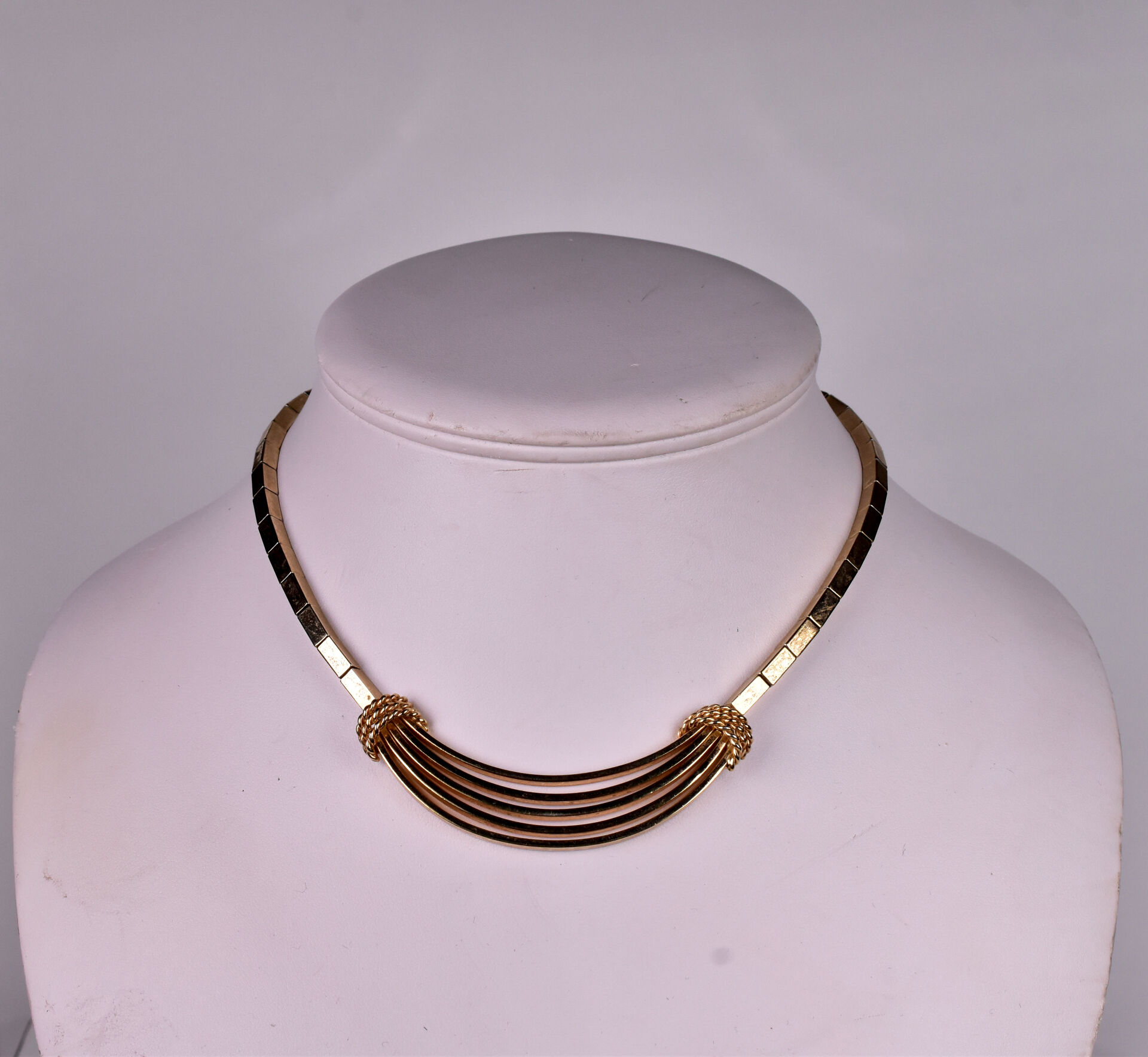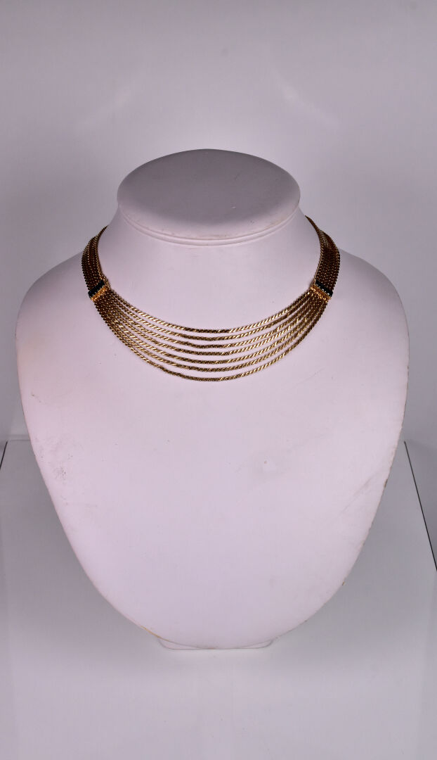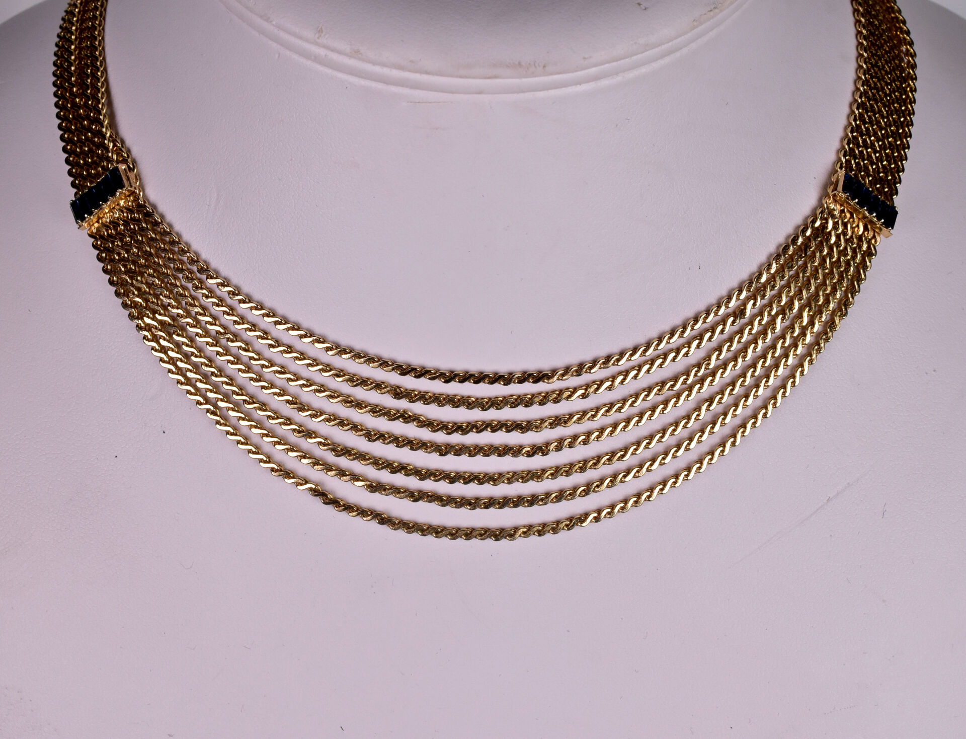 GROSSE. Deux colliers en métal doré et pierres bleues. Vers 1960.