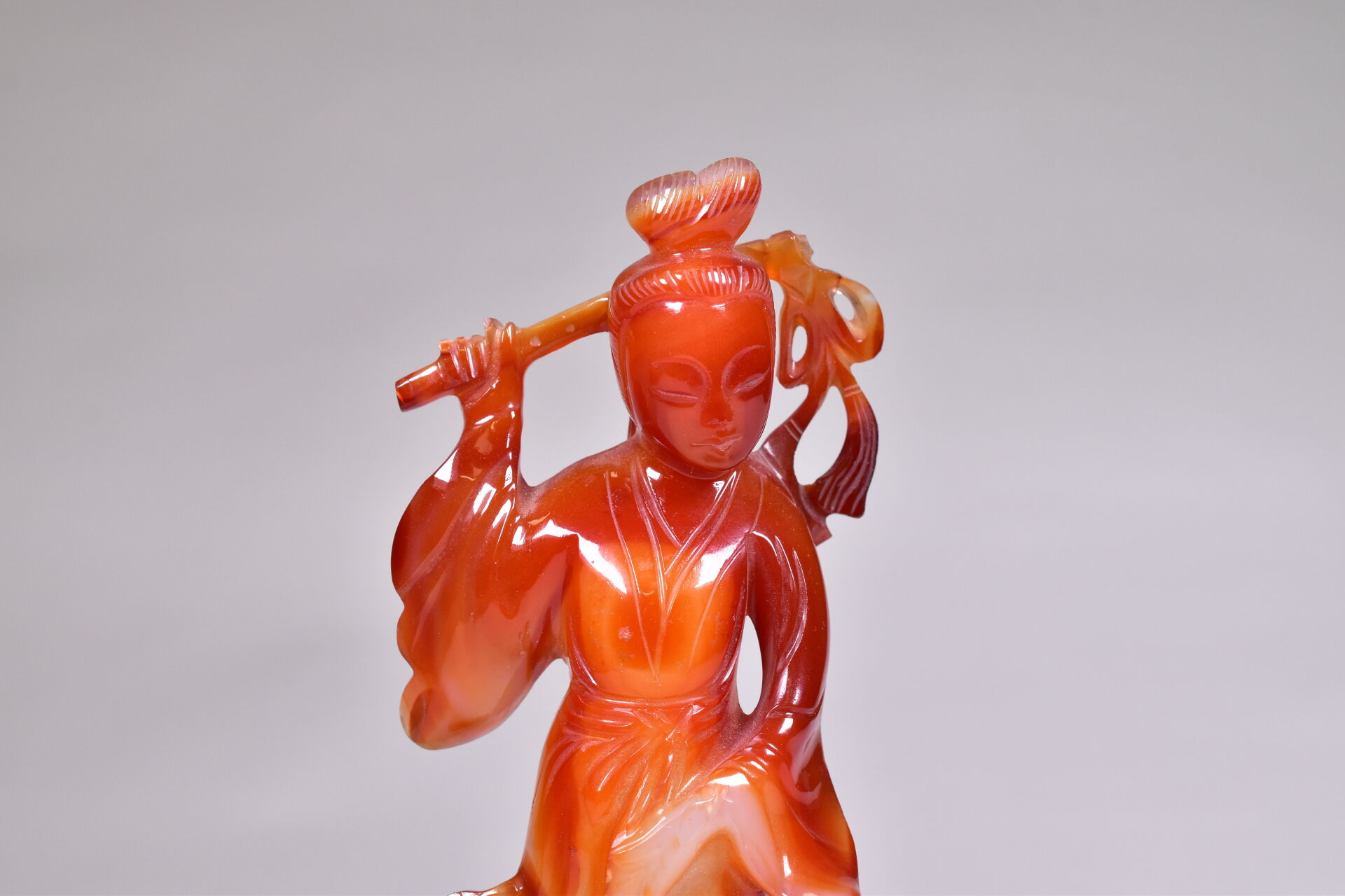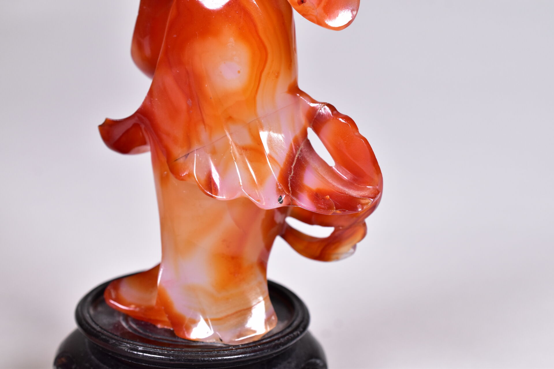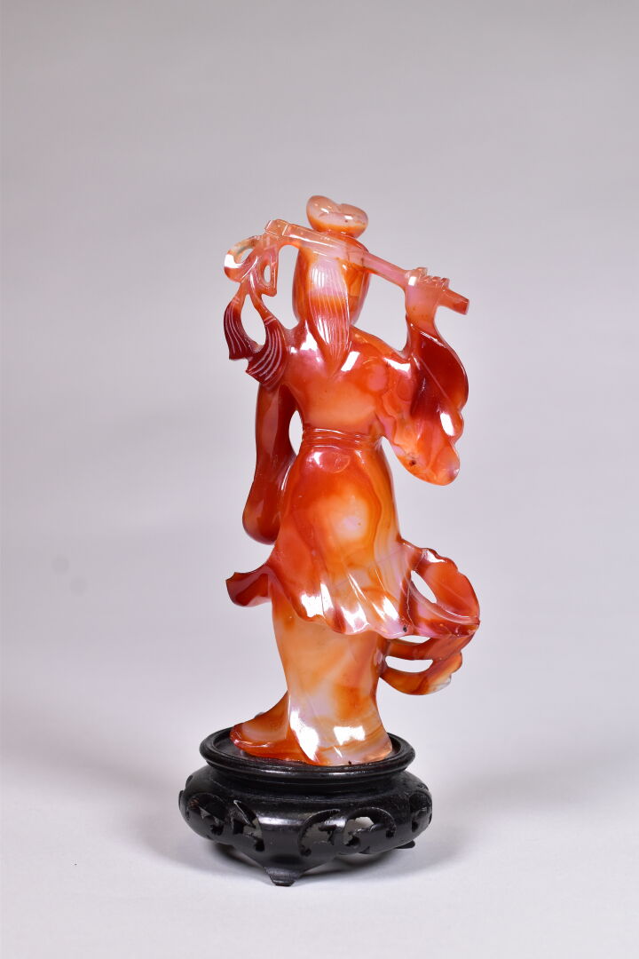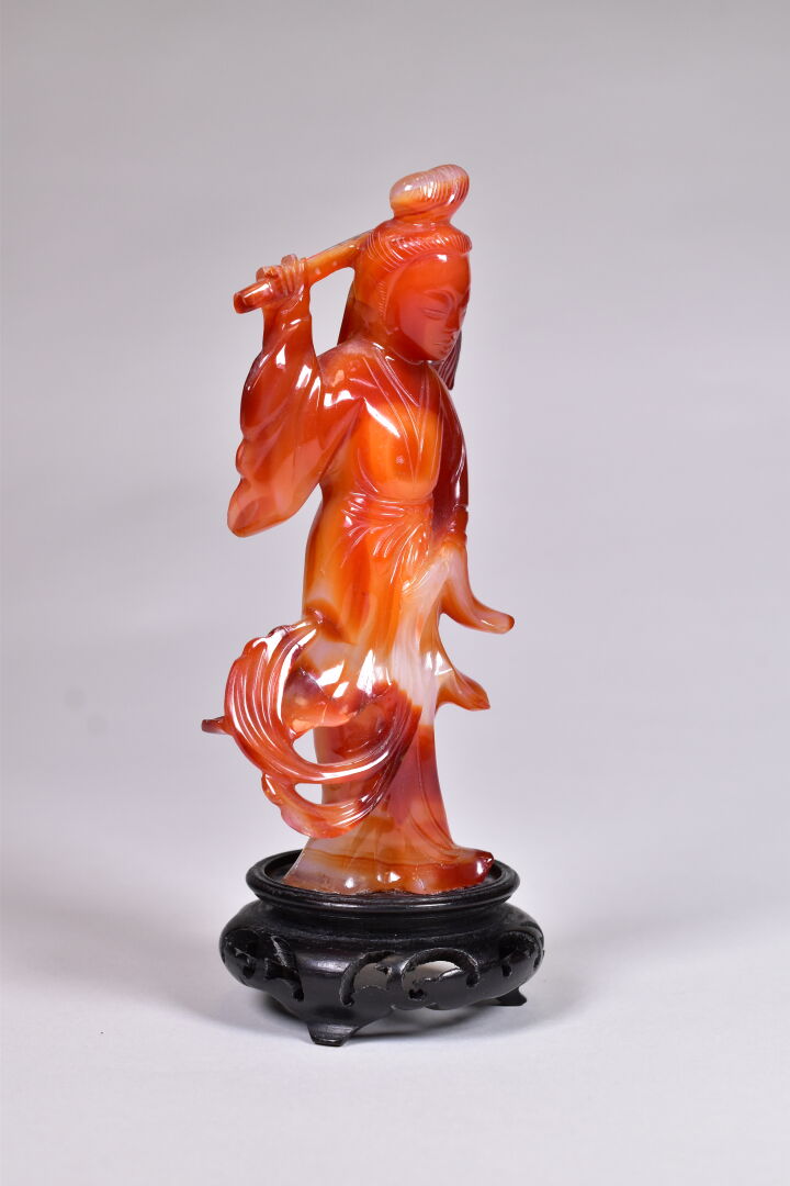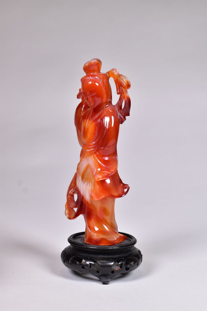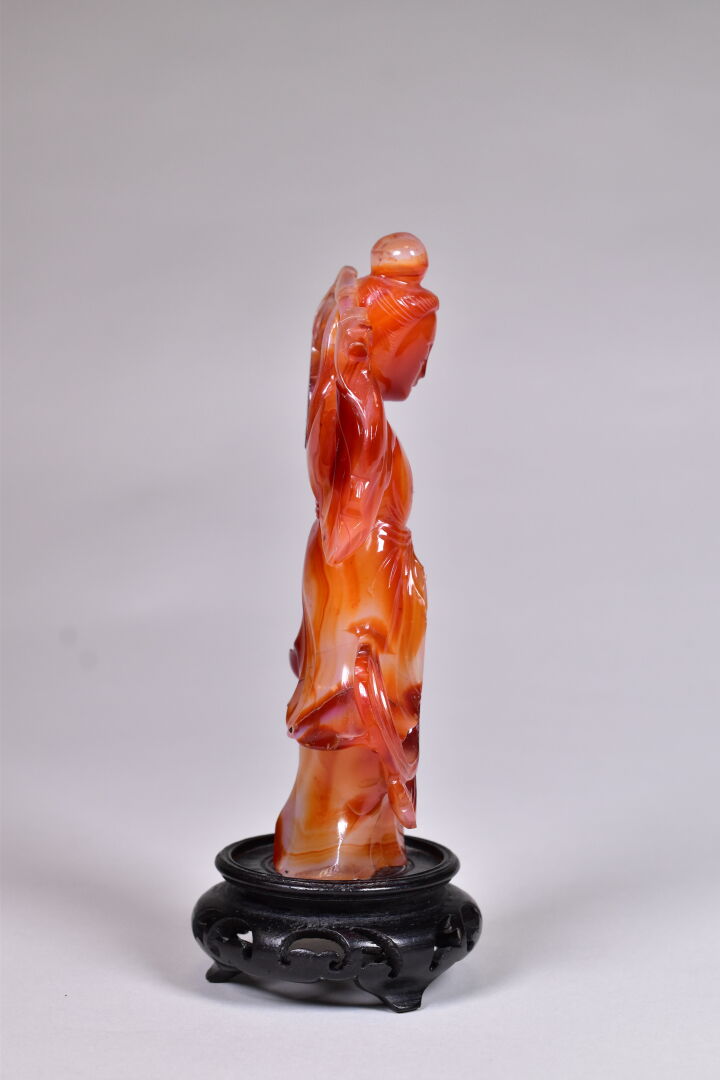 Guanyn en cornaline sculptée (un manque – restauration). Socle de bois noirci. Chine, moderne. Haut. : 19 cm.