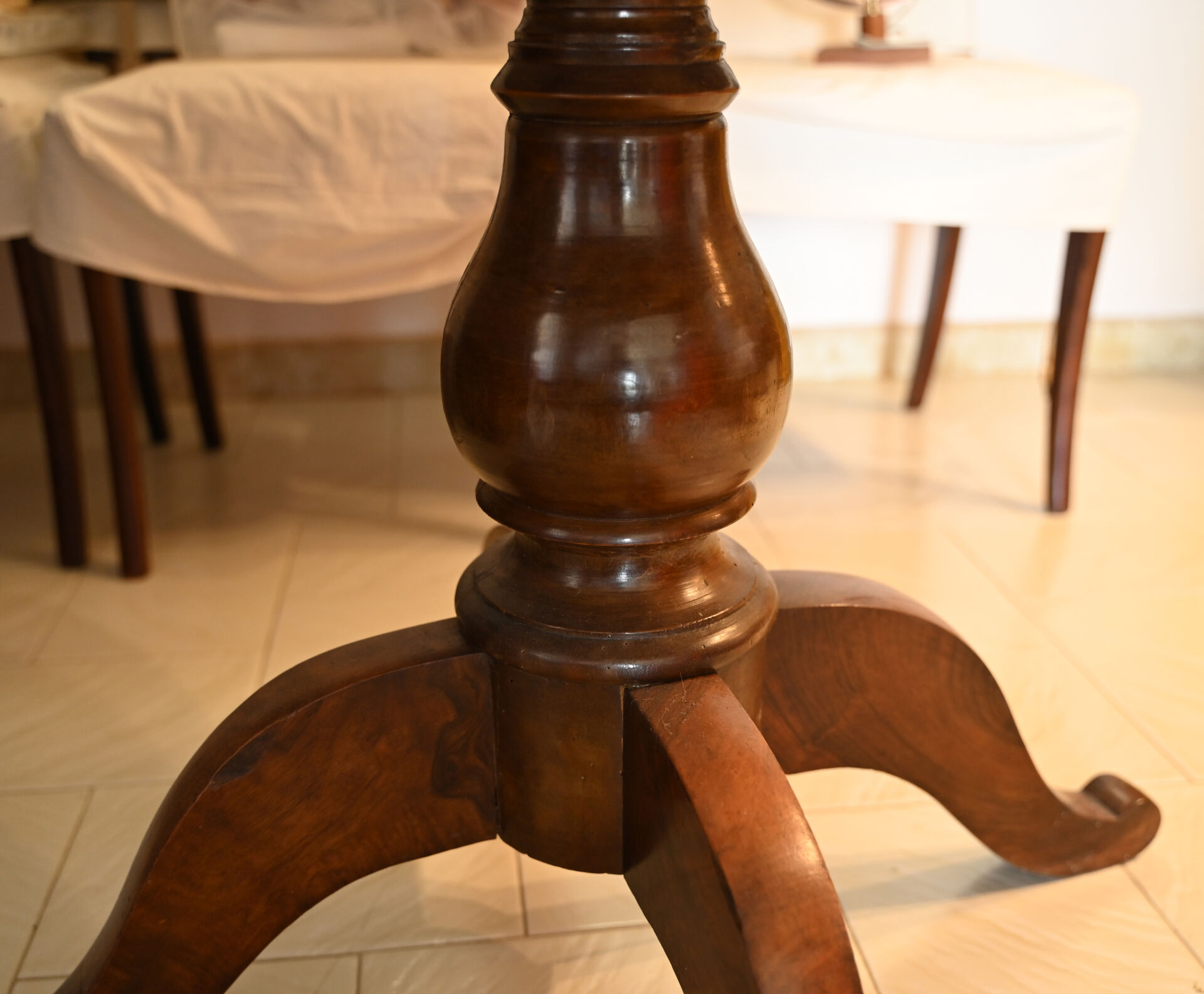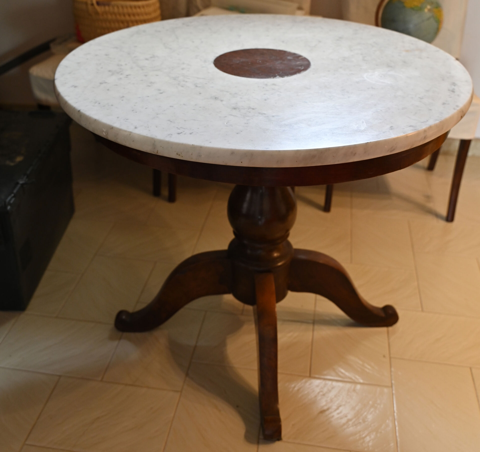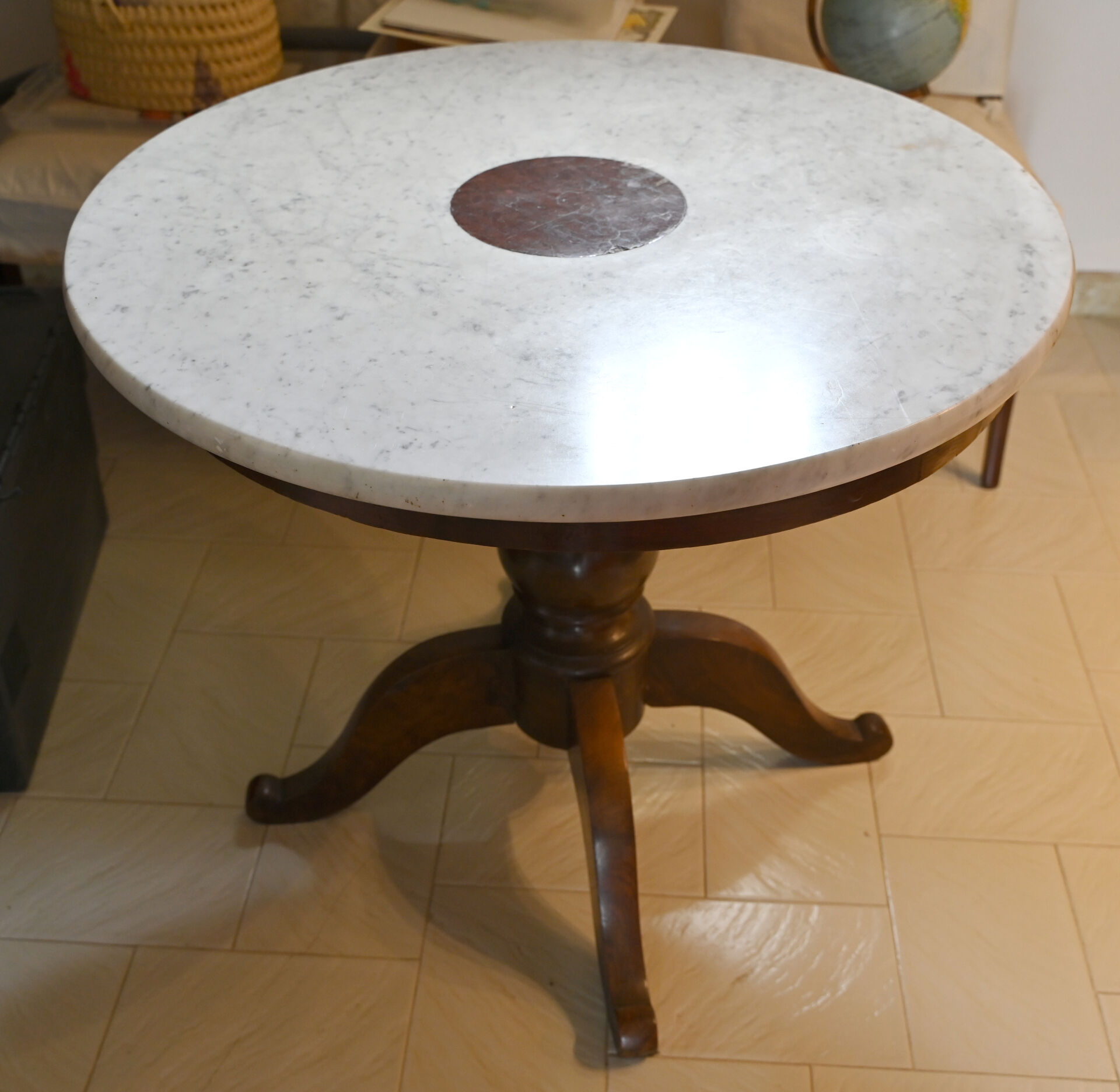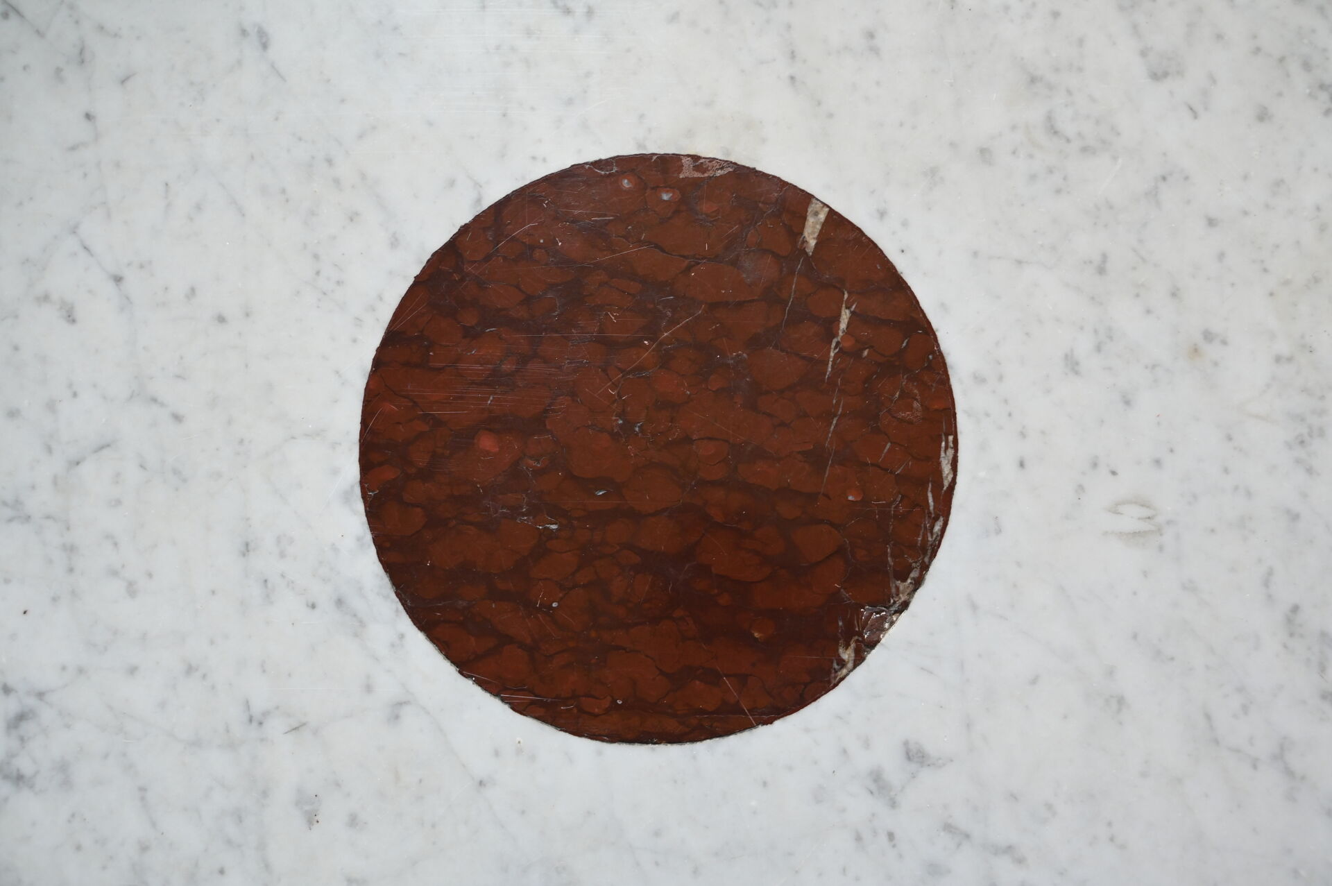 Guéridon à plateau de marbre blanc et rouge griotte. Style Empire. Usures d’usage. Haut. : 72 cm. Diam. : 84 cm.