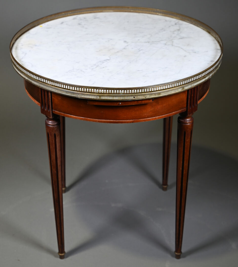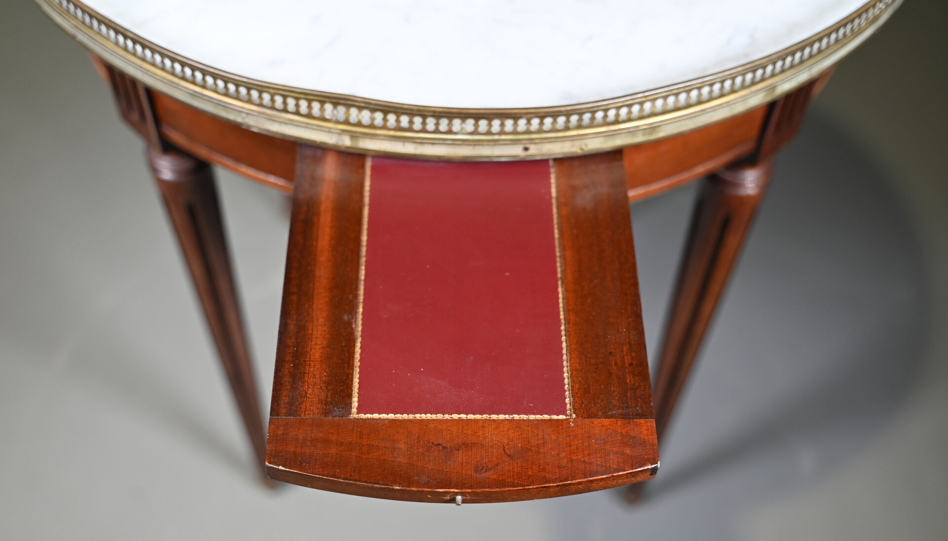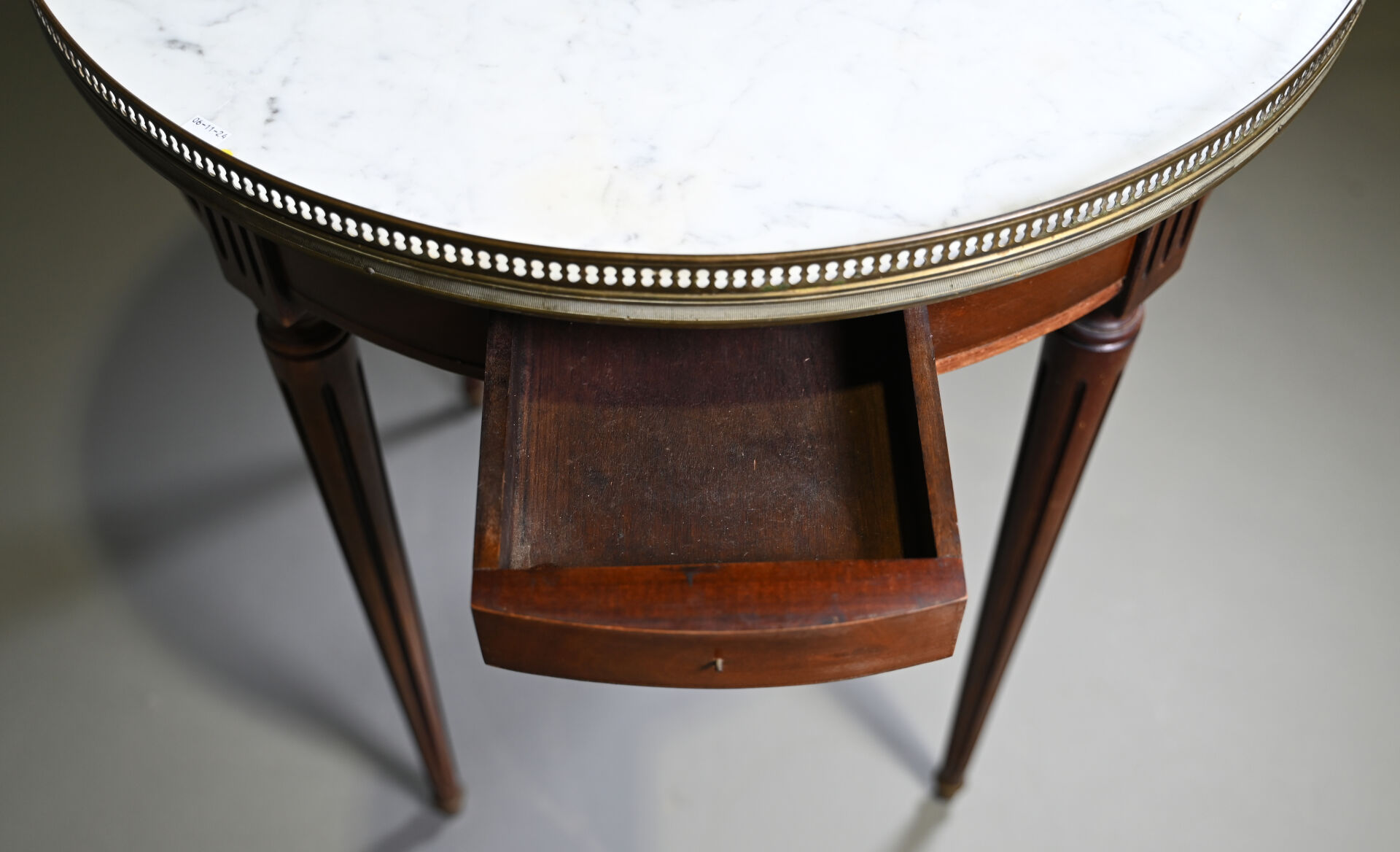 Guéridon de bouillote en acajou et placage d’acajou ouvrant à deux tiroirs en ceinture et deux tirettes gainées de skai rouge. Pieds fuselés cannelés terminés par des sabots. Plateau de marbre blanc ceint d’une galerie de laiton ajourée. Manquent les boutons de tirage, galerie déformée. Style Louis XVI. Haut. : 70 cm – Diam. : 65 cm.