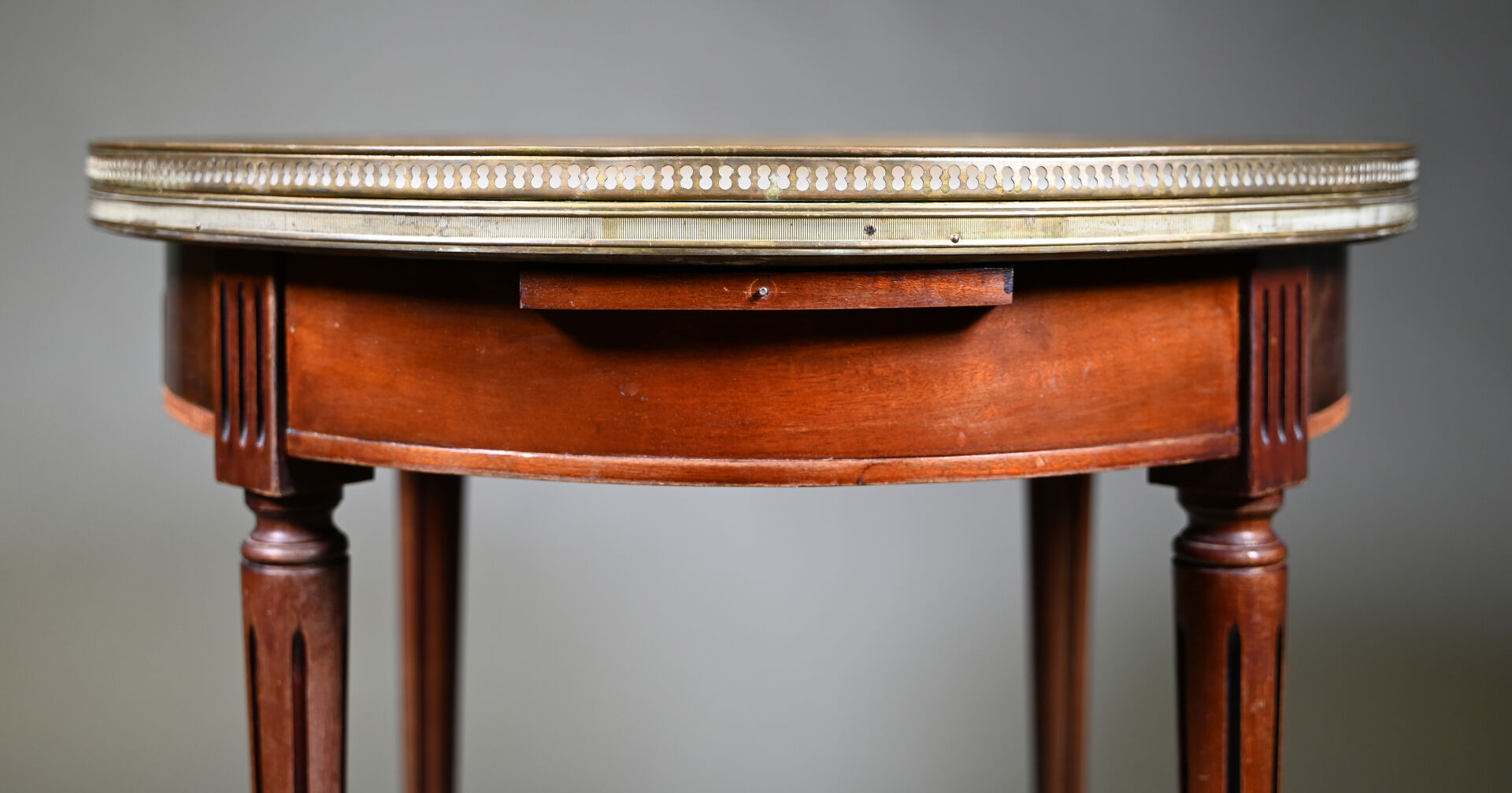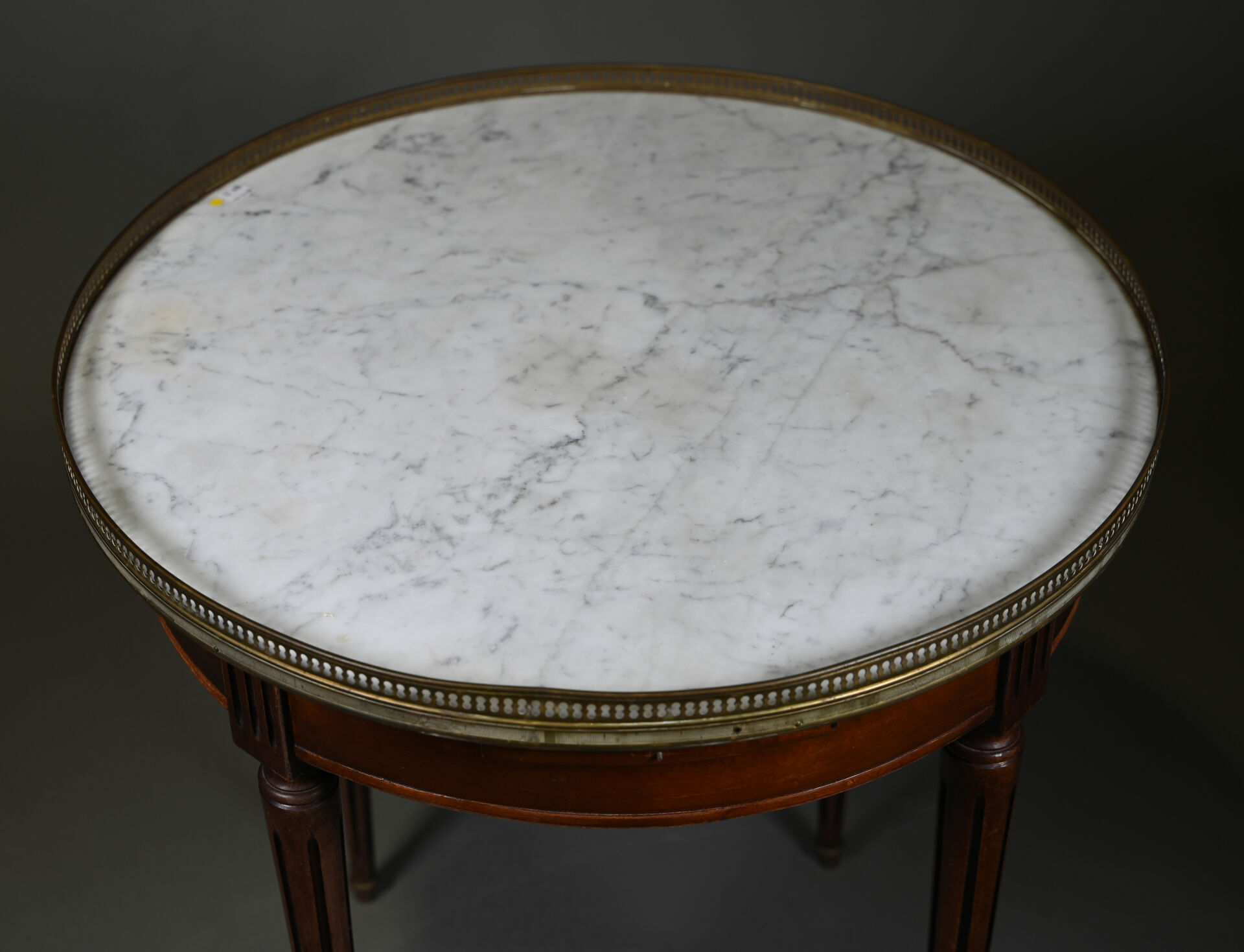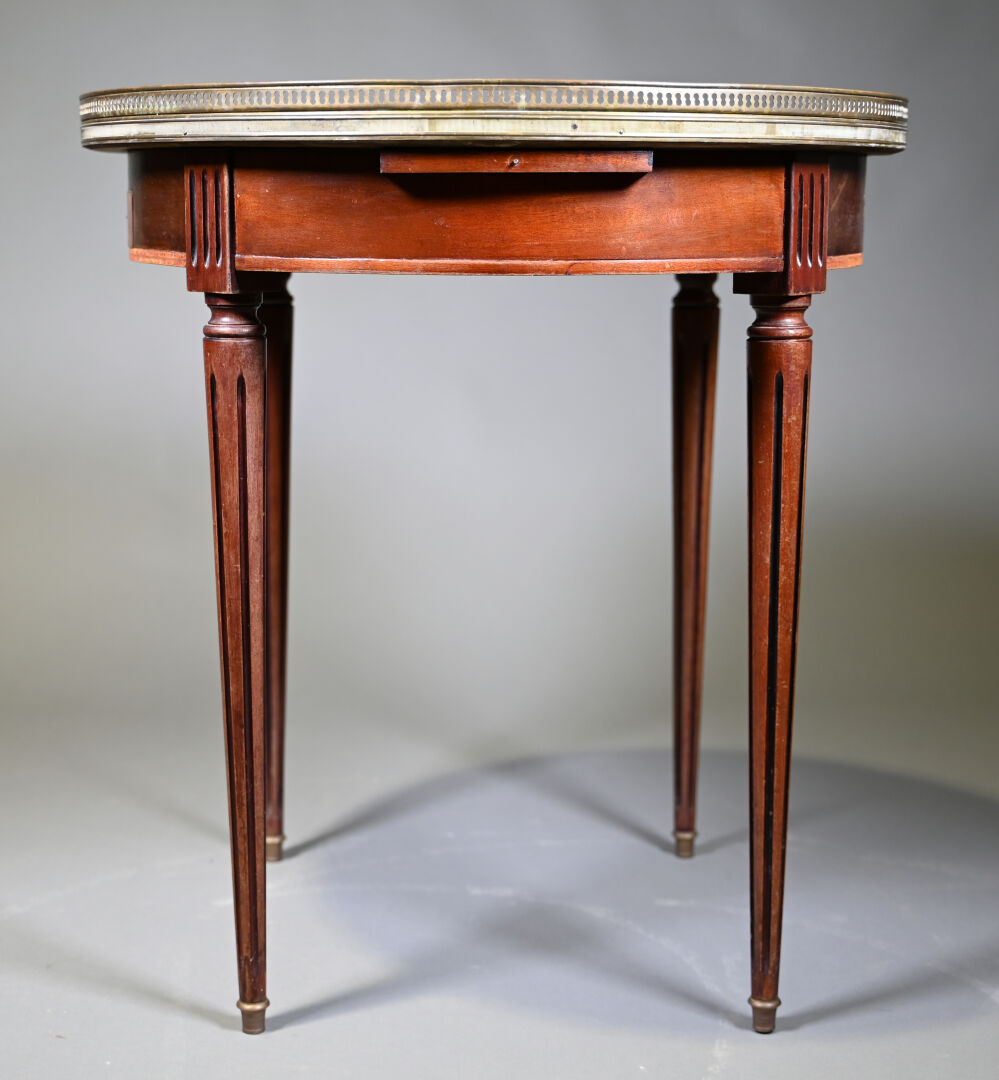 Guéridon de bouillote en acajou et placage d’acajou ouvrant à deux tiroirs en ceinture et deux tirettes gainées de skai rouge. Pieds fuselés cannelés terminés par des sabots. Plateau de marbre blanc ceint d’une galerie de laiton ajourée. Manquent les boutons de tirage, galerie déformée. Style Louis XVI. Haut. : 70 cm – Diam. : 65 cm.