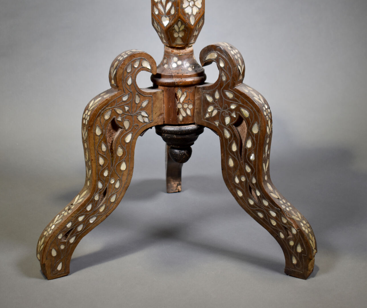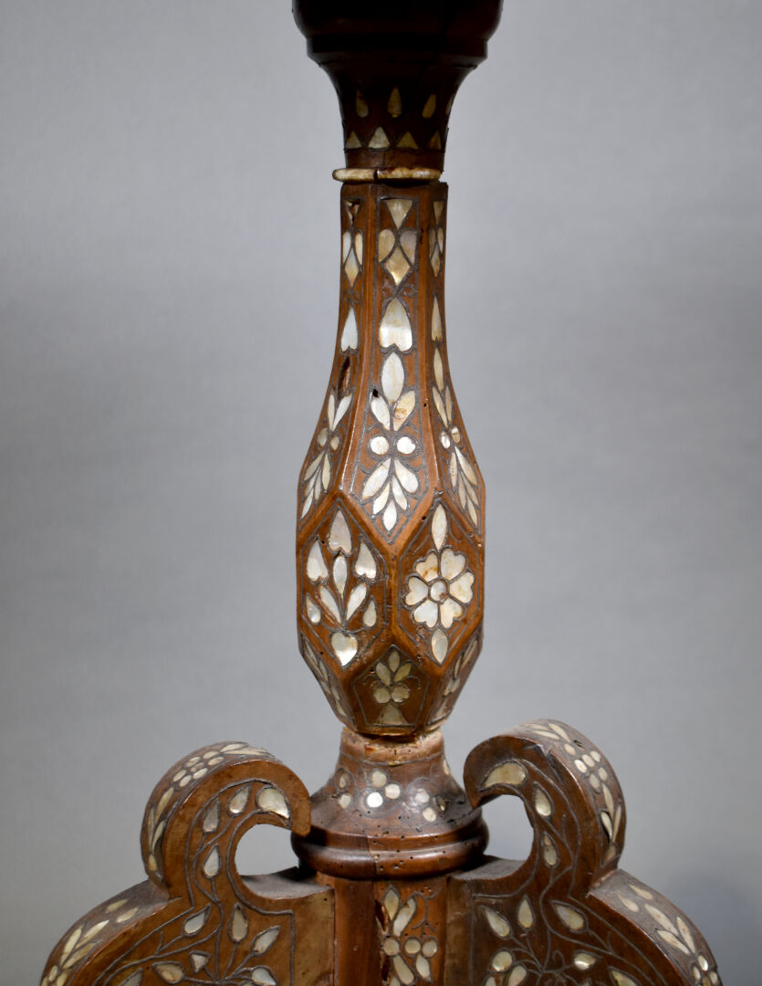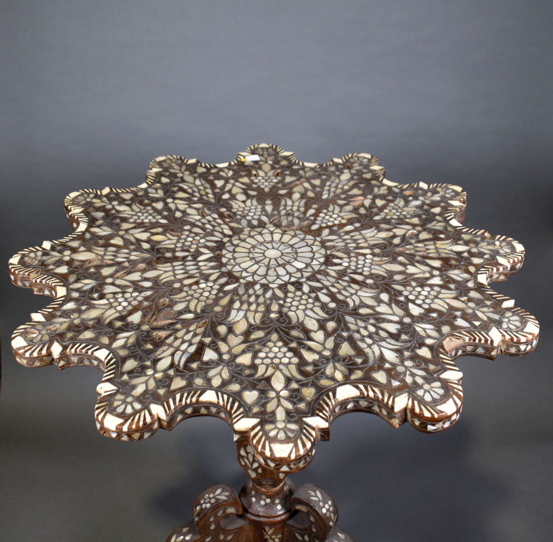 Guéridon en bois à décor incrusté de nacre en étoile (manques, traces d’insectes, fèle, restaurations). Plateau de forme libre. Piétement tripode. Travail Syrien, XXe siècle. Haut. : 78 cm.