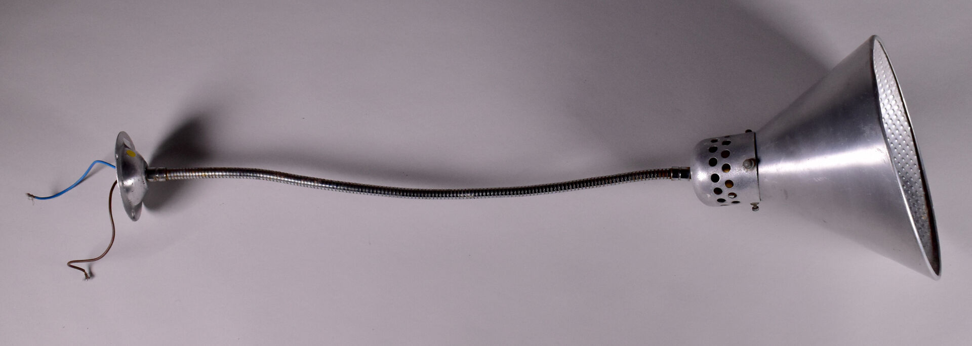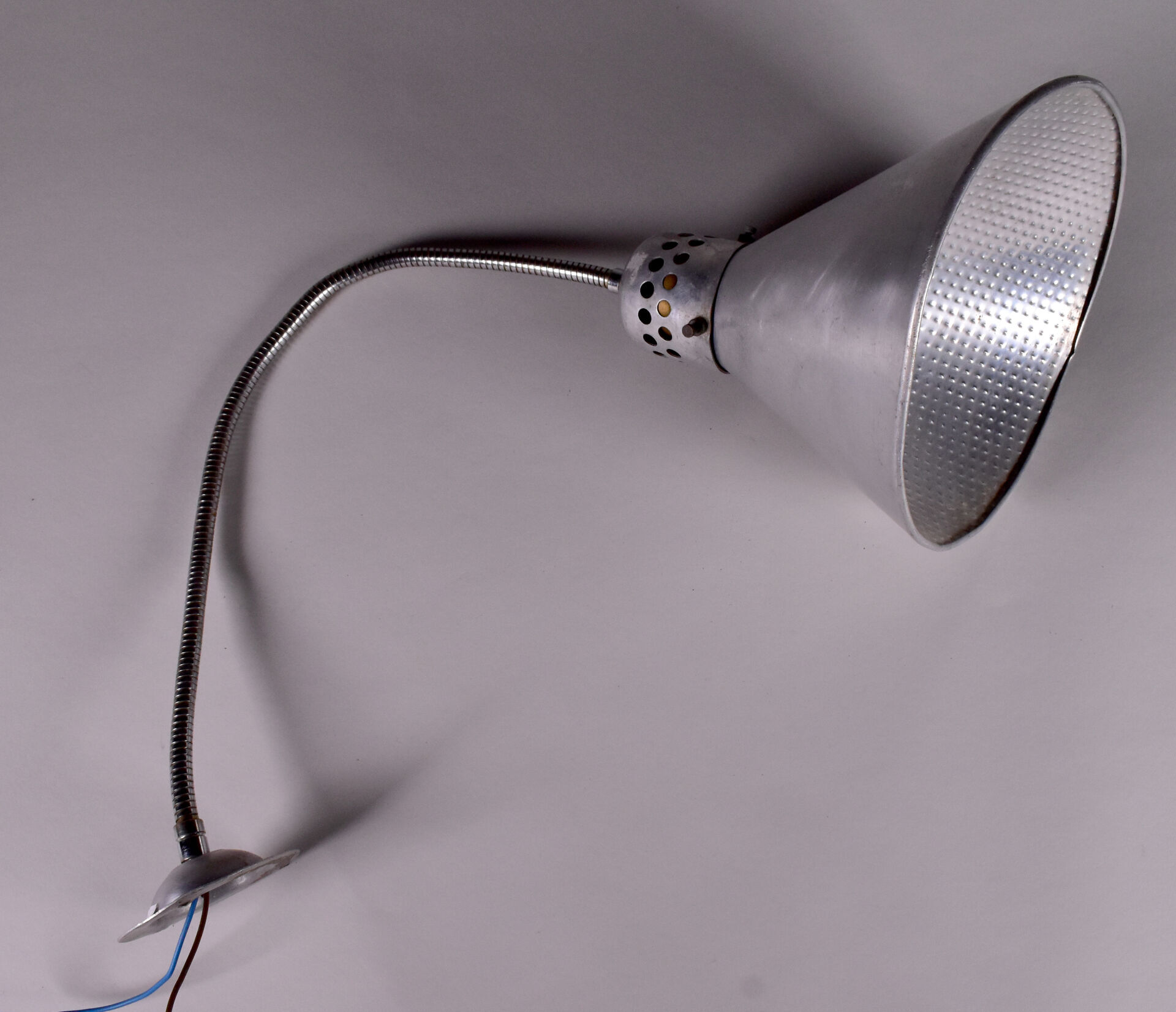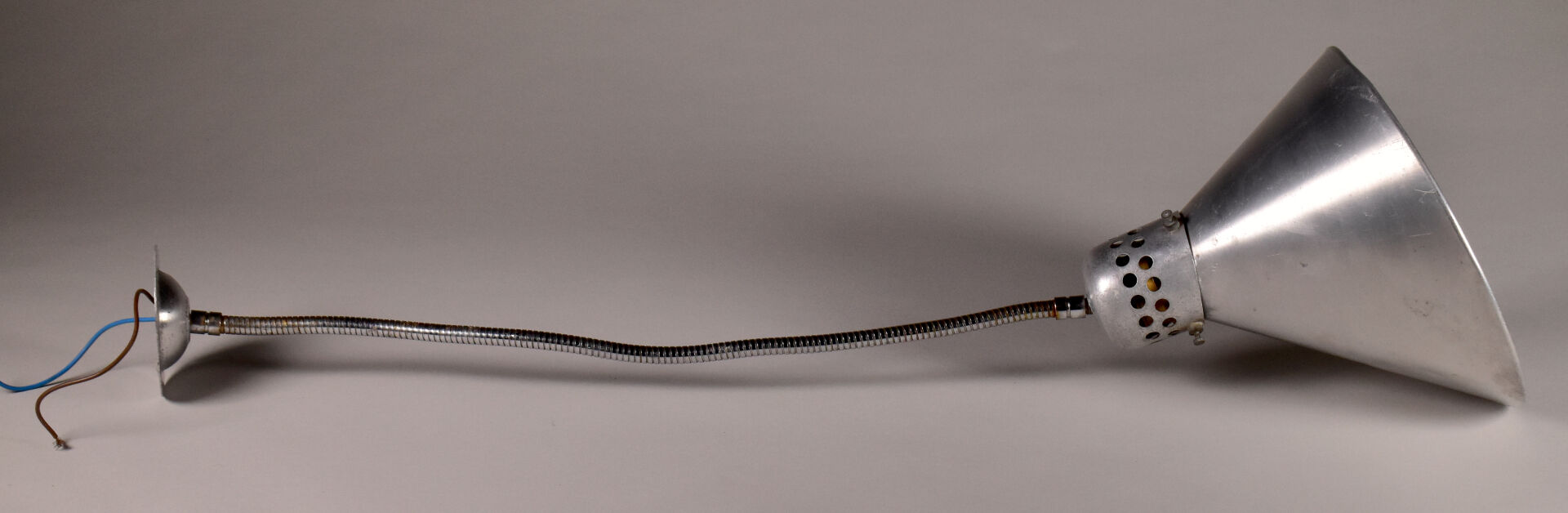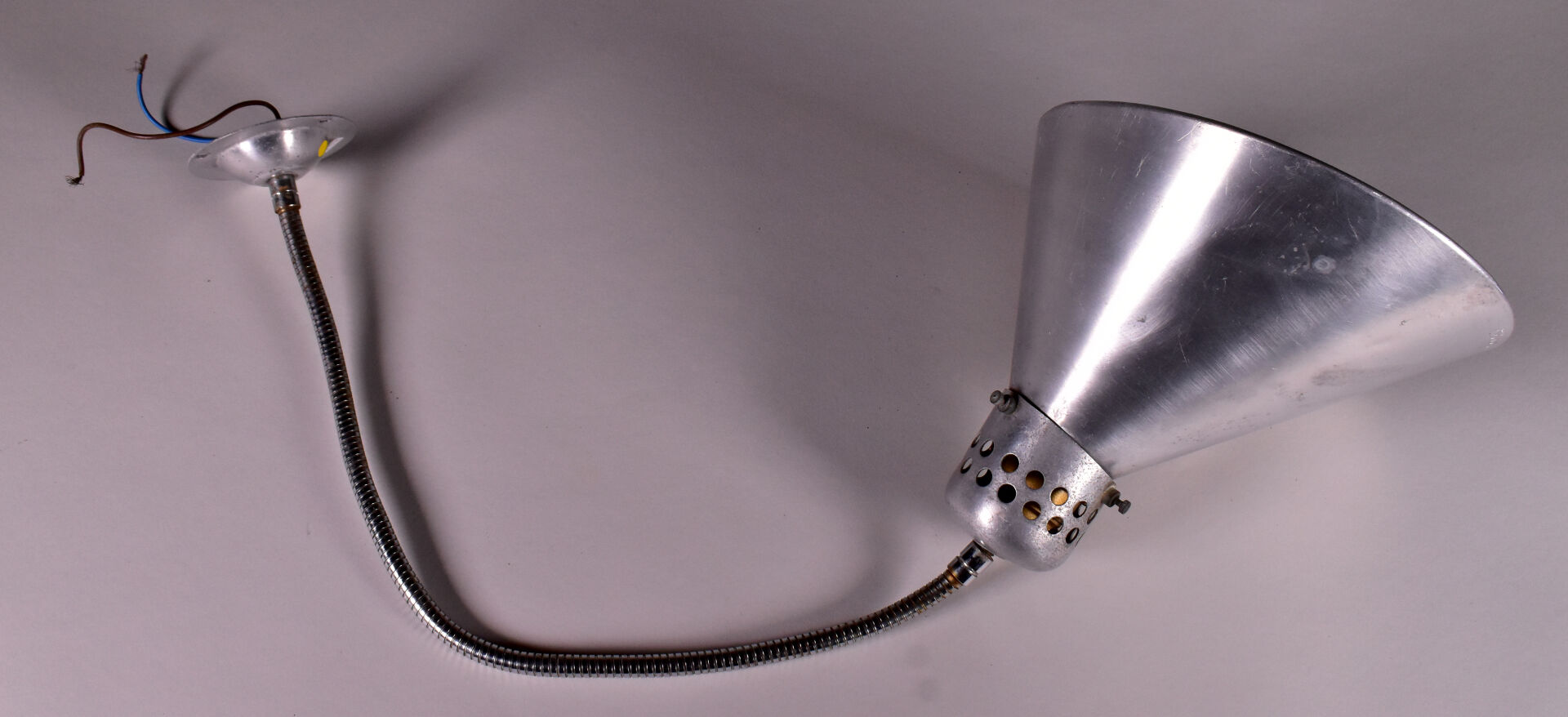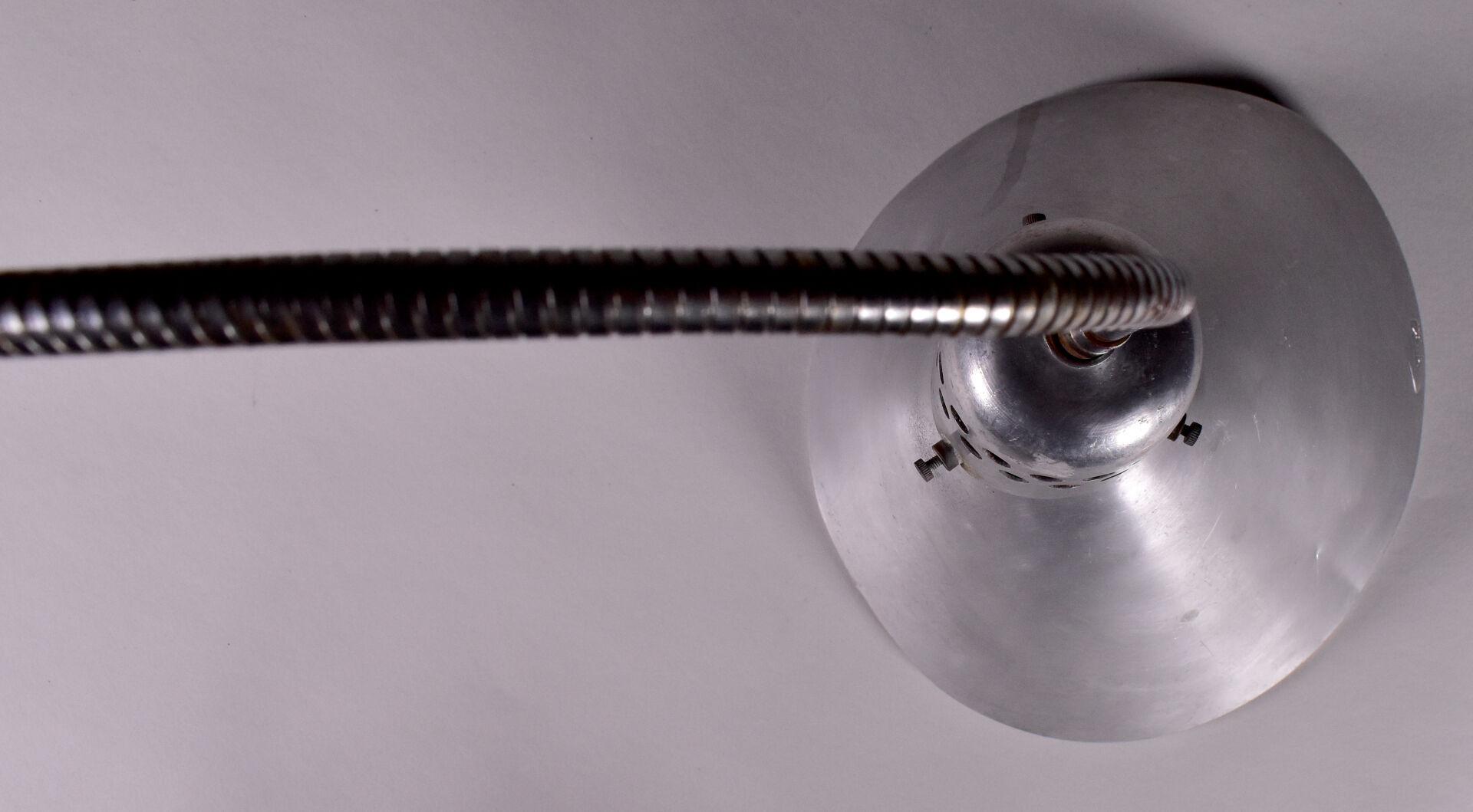 GUILUX. Trois lampes d’atelier en inox à fut en ressort, l’abat-jour conique (petits enfoncements et usures d’usage). Vers 1960. Haut. : 72 cm.