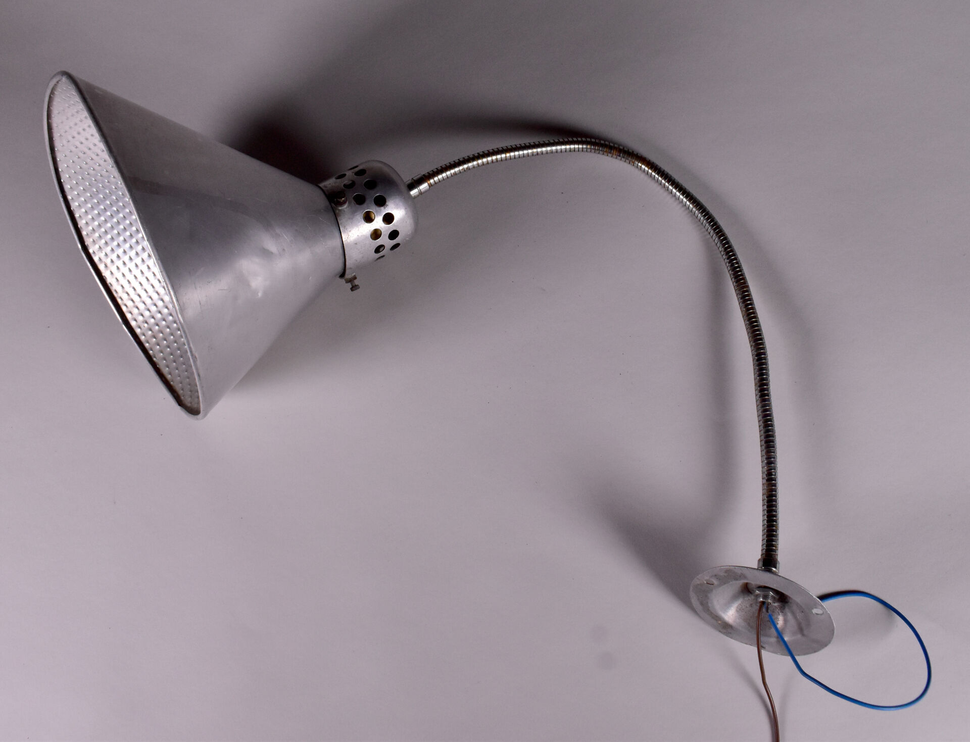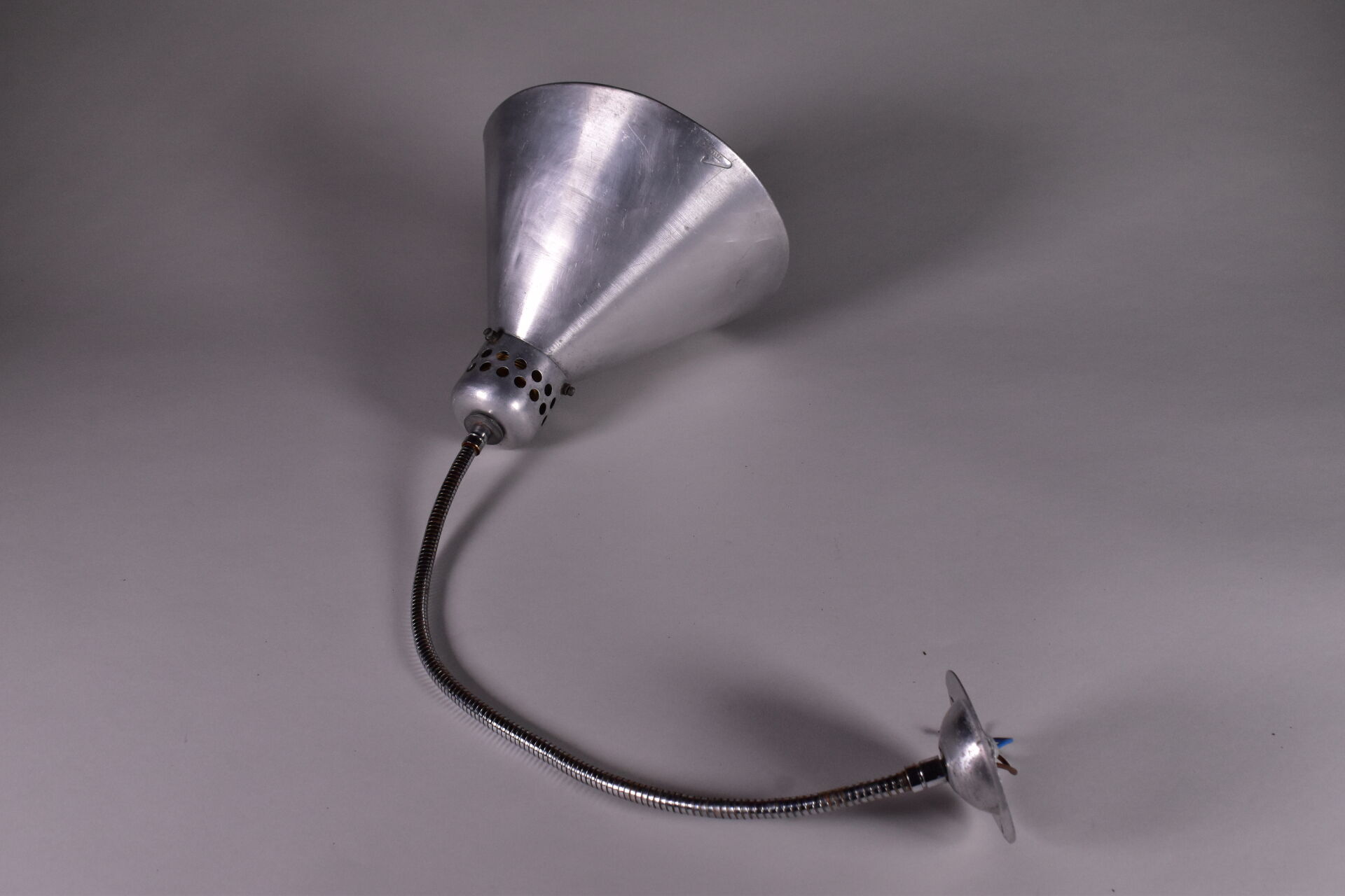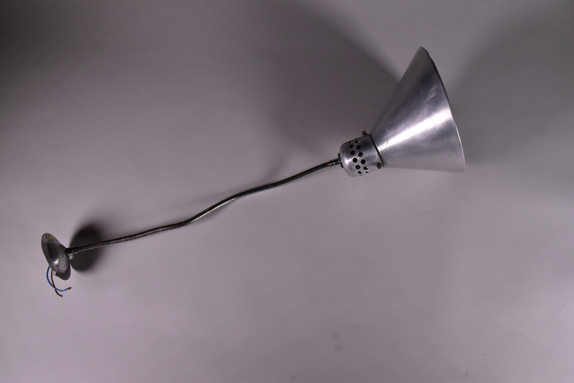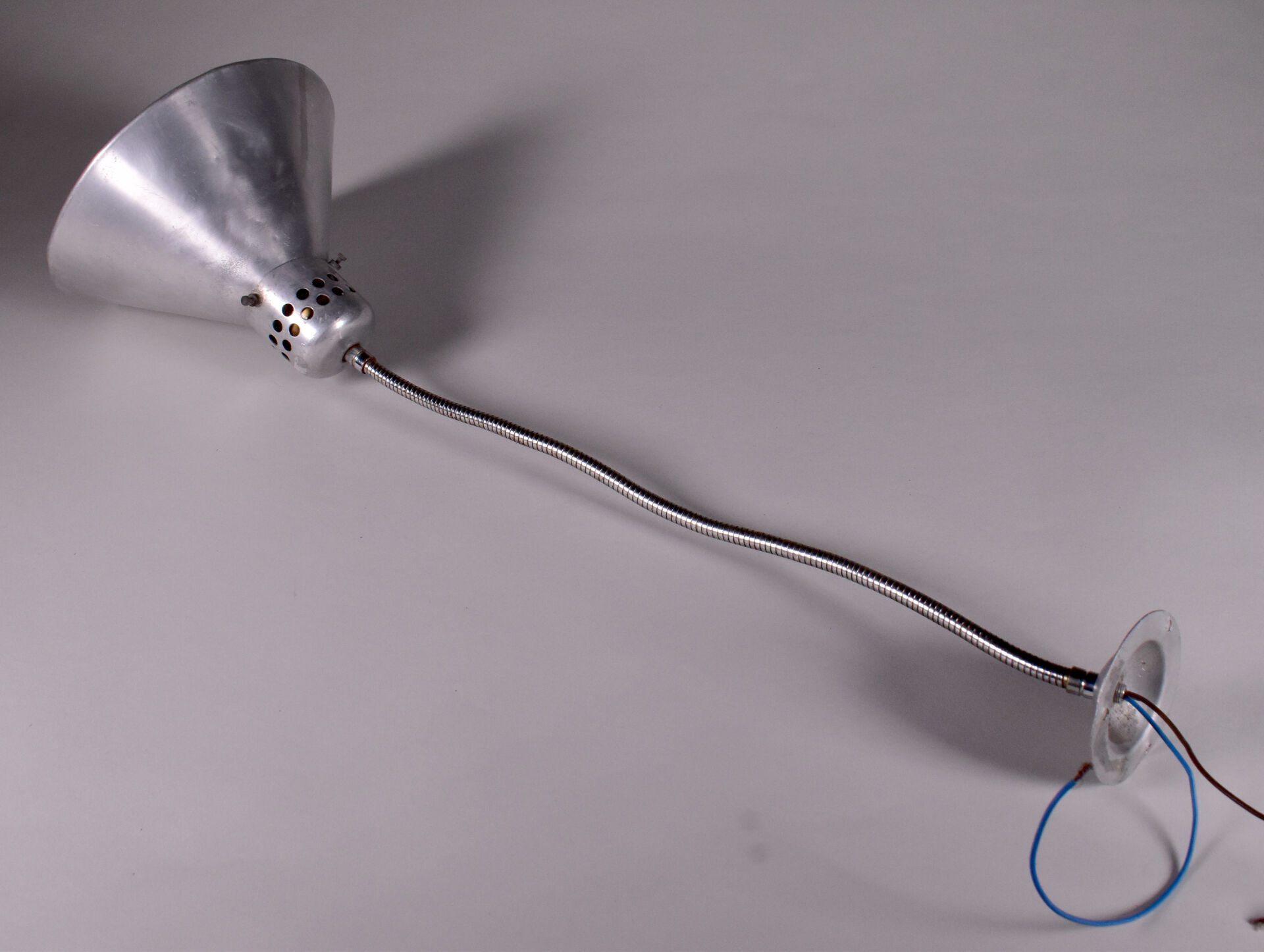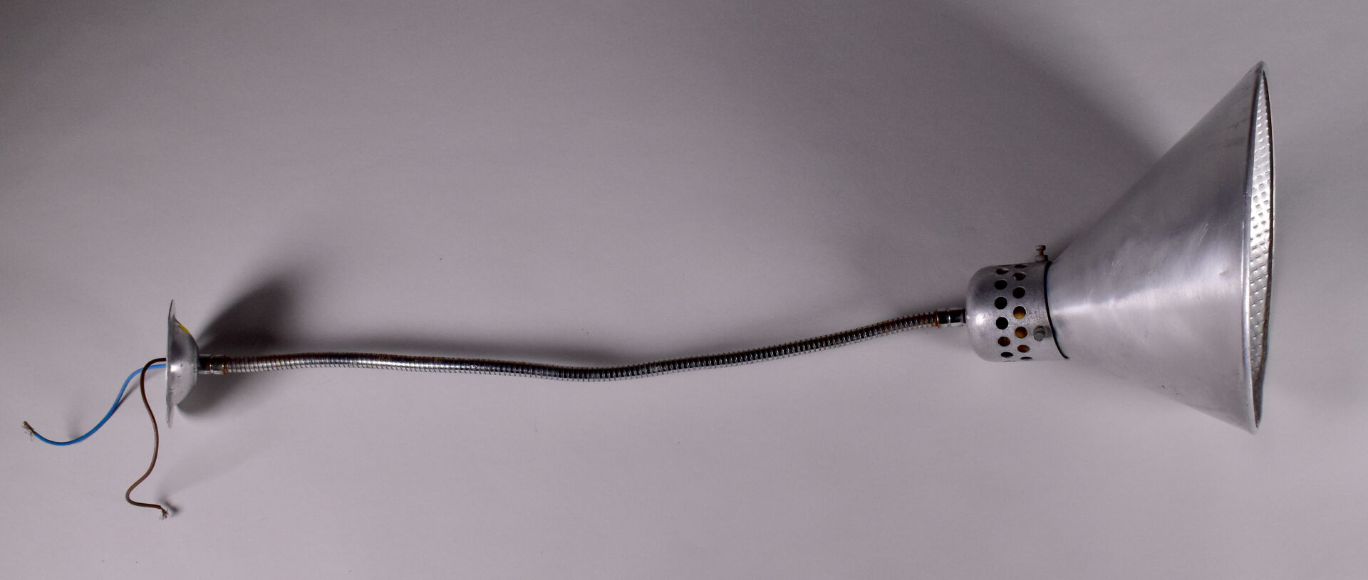 GUILUX. Trois lampes d’atelier en inox à fut en ressort, l’abat-jour conique (petits enfoncements et usures d’usage). Vers 1960. Haut. : 72 cm.