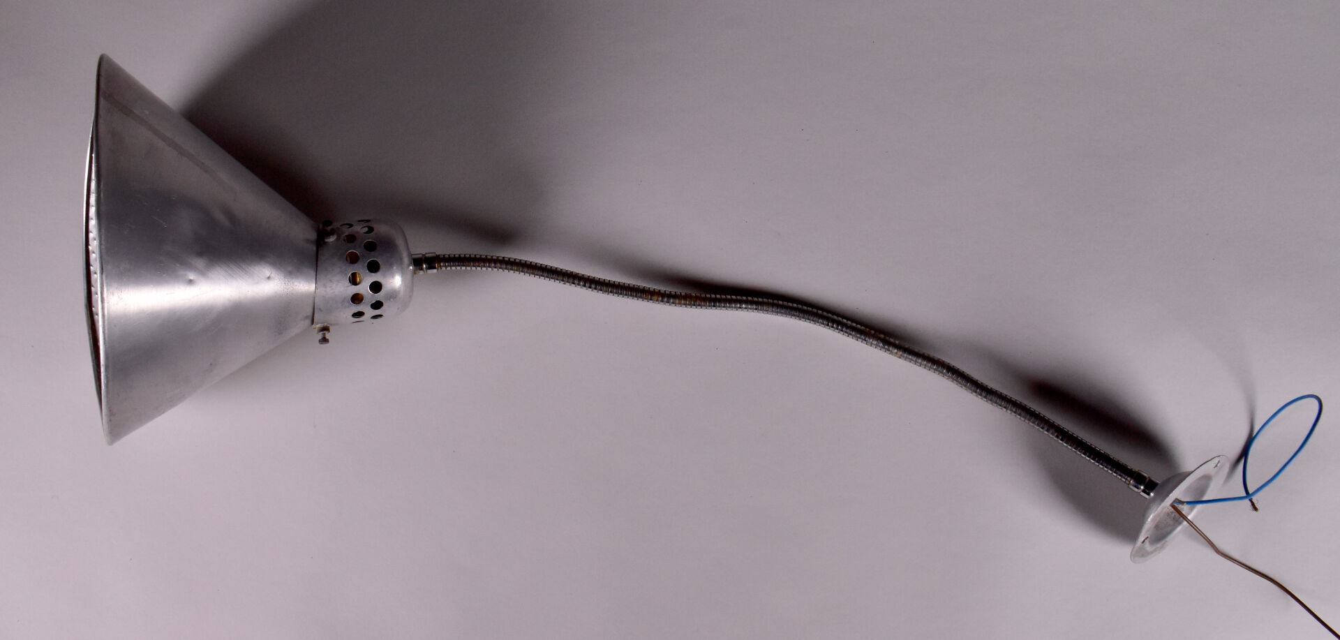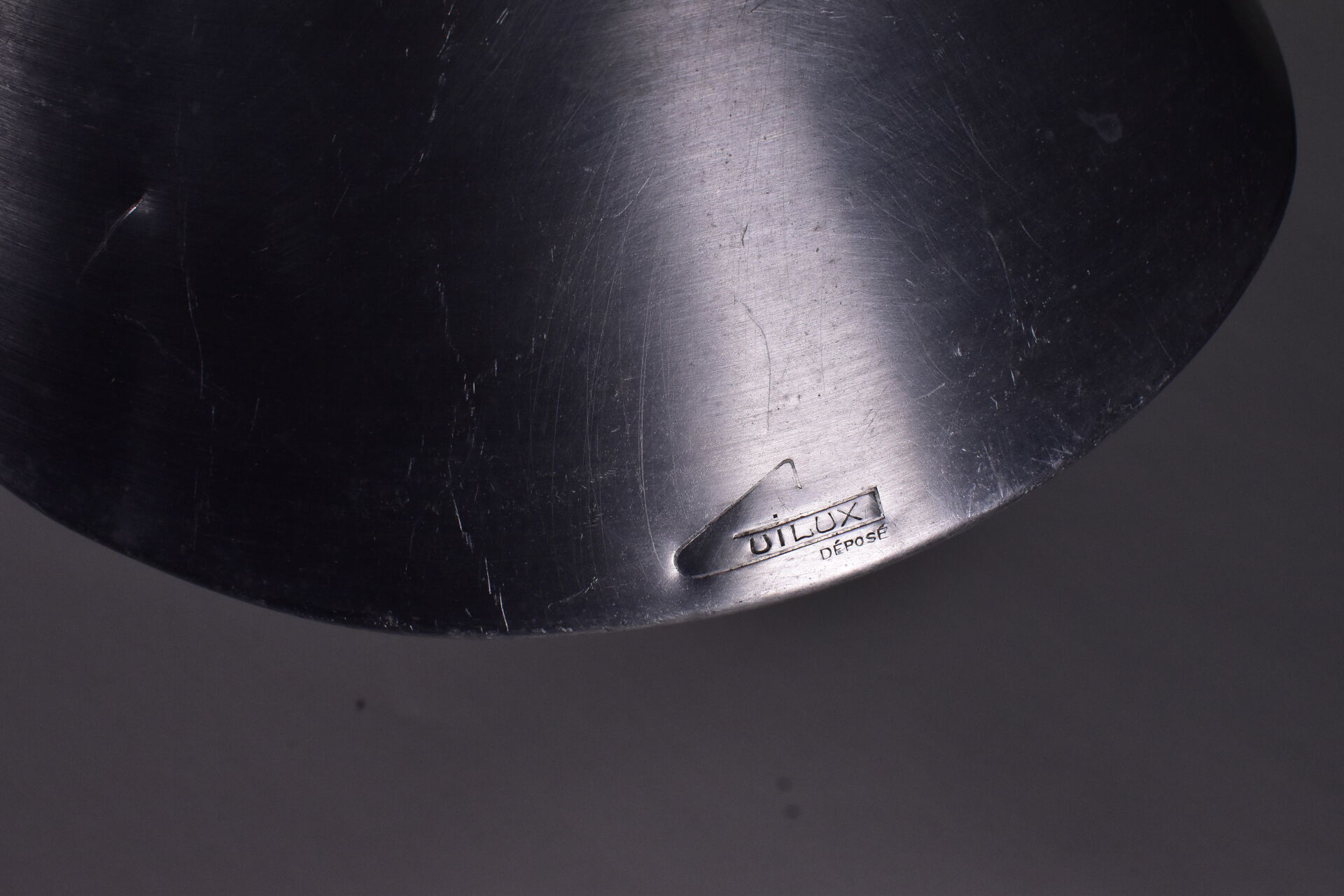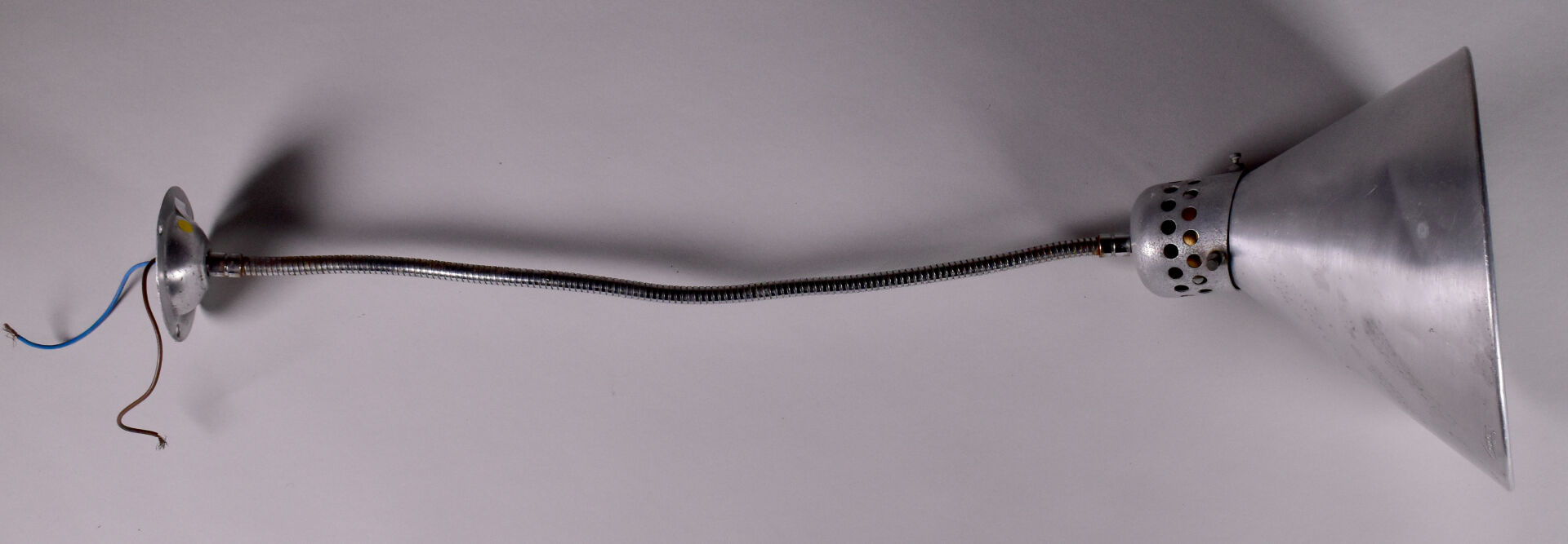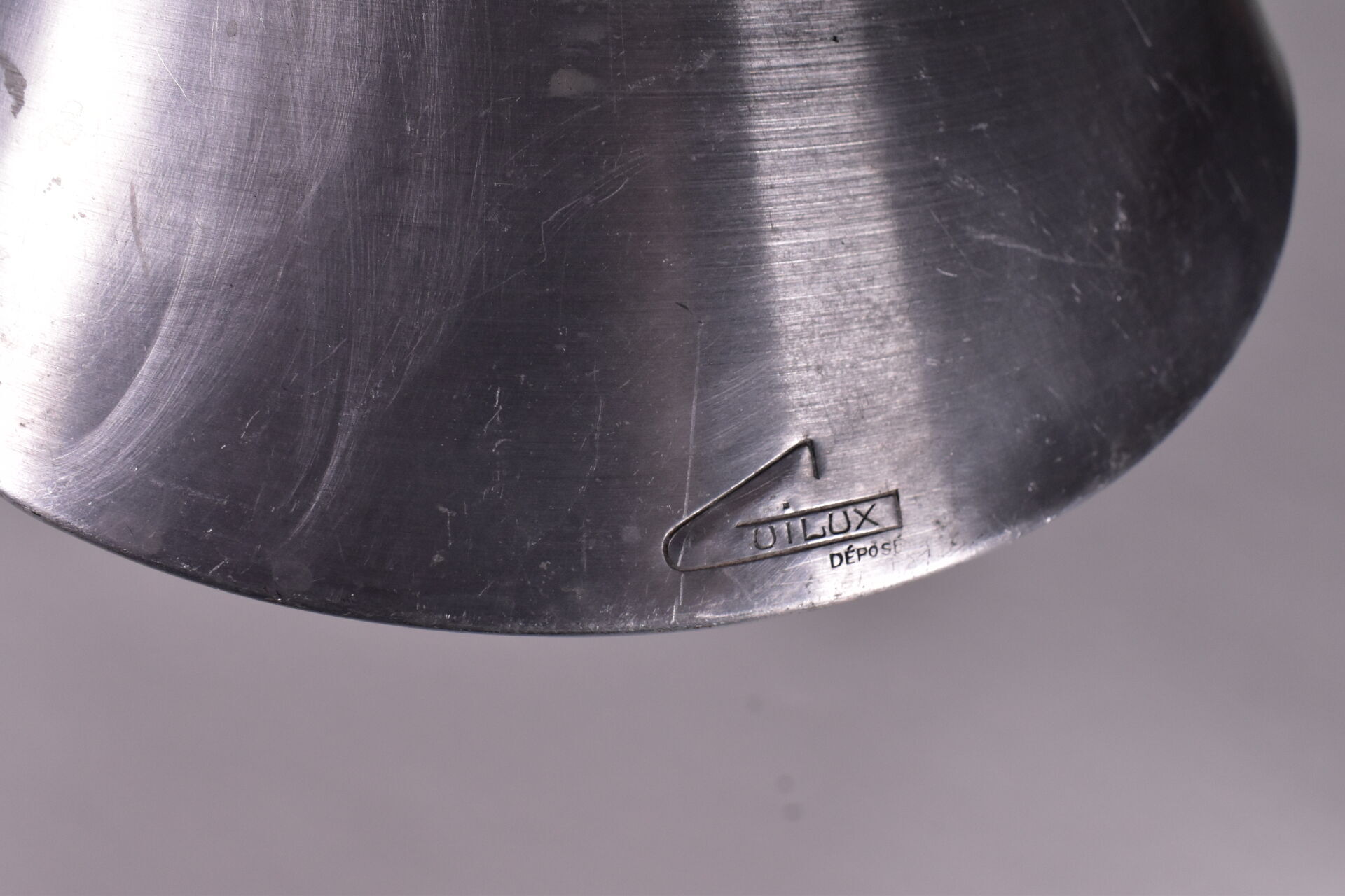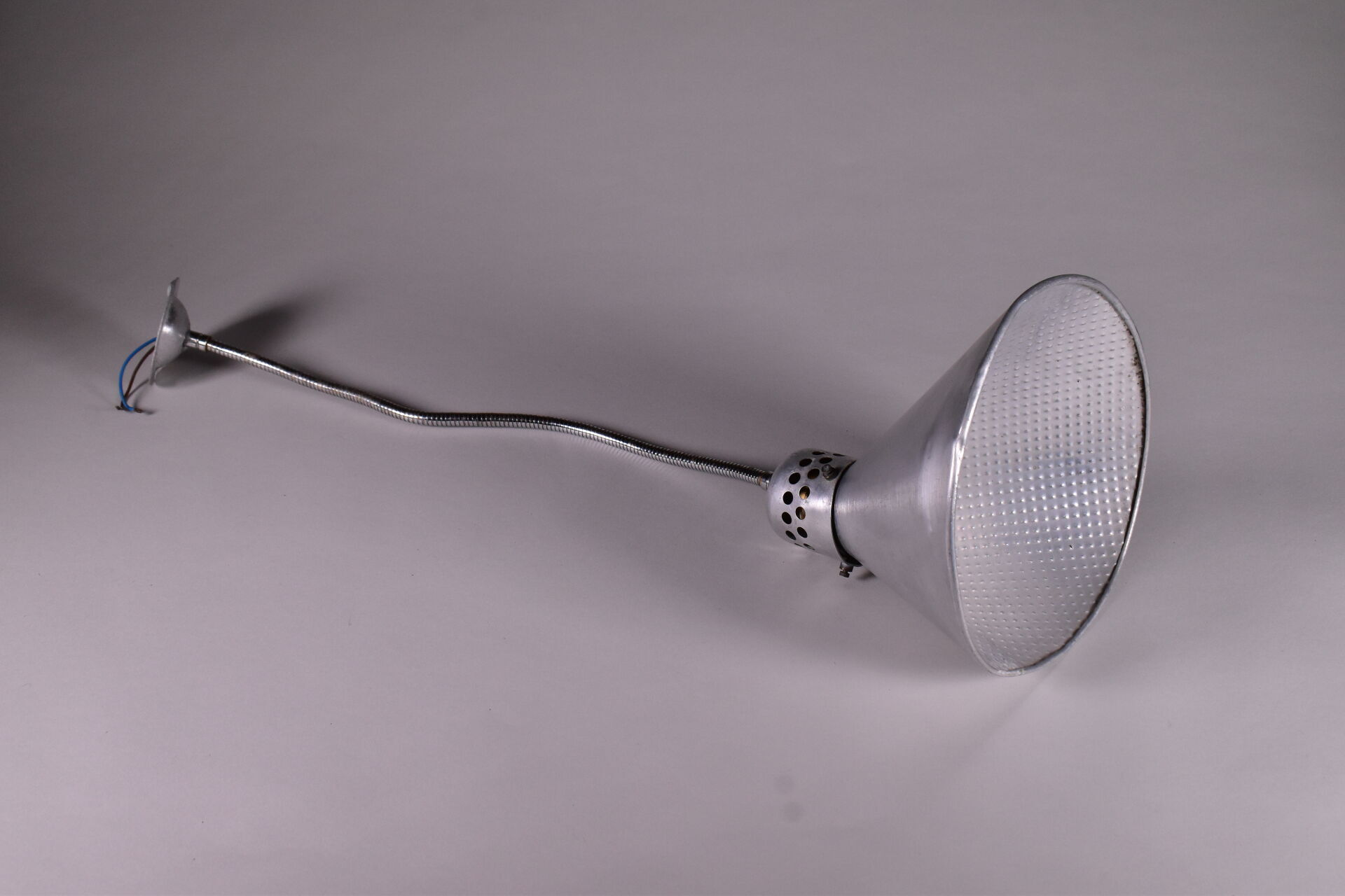 GUILUX. Trois lampes d’atelier en inox à fut en ressort, l’abat-jour conique (petits enfoncements et usures d’usage). Vers 1960. Haut. : 72 cm.
