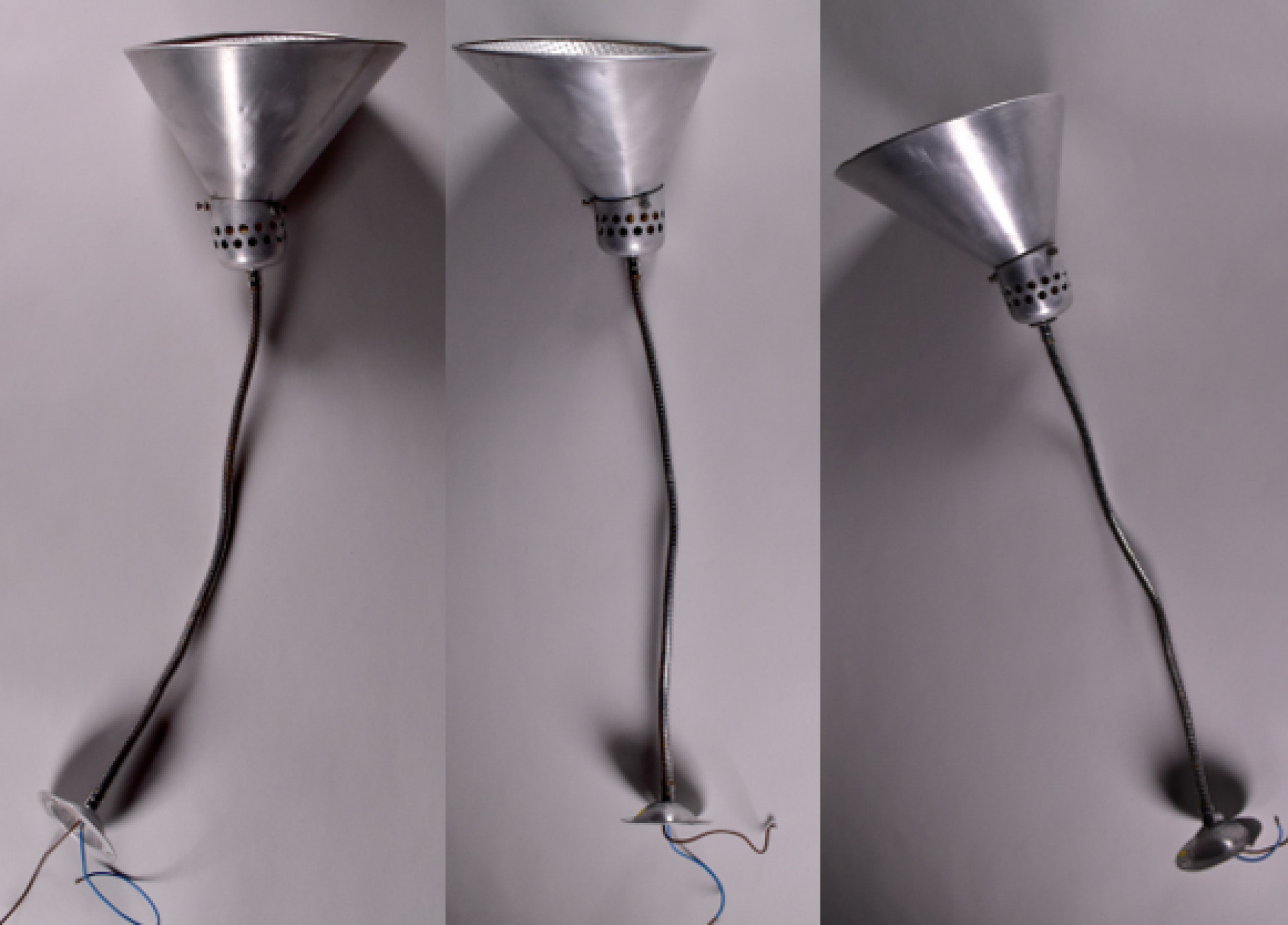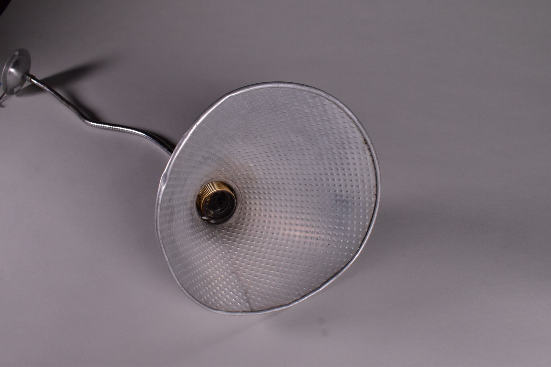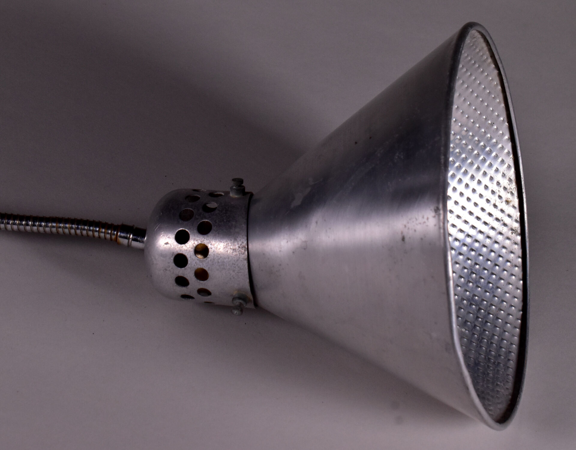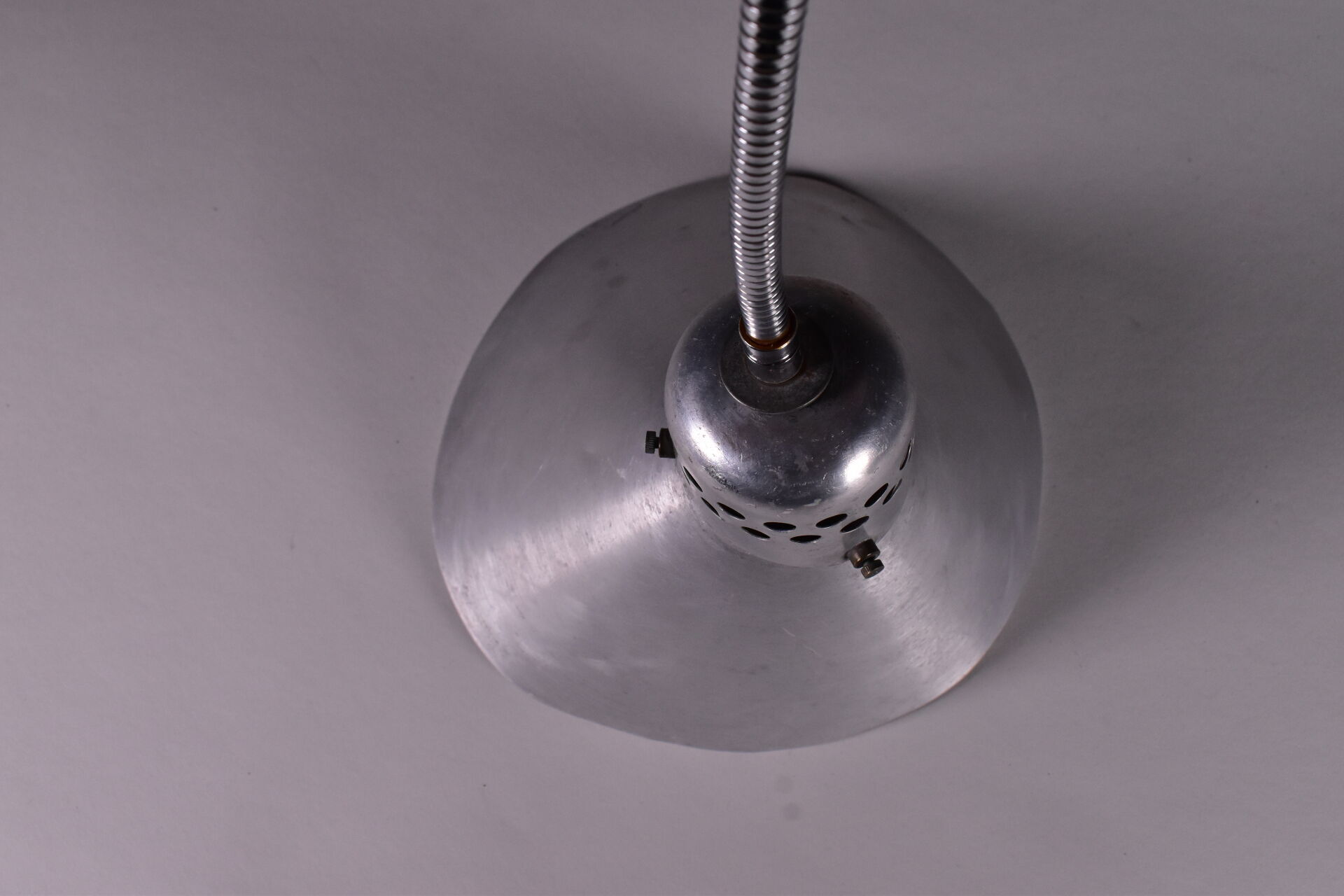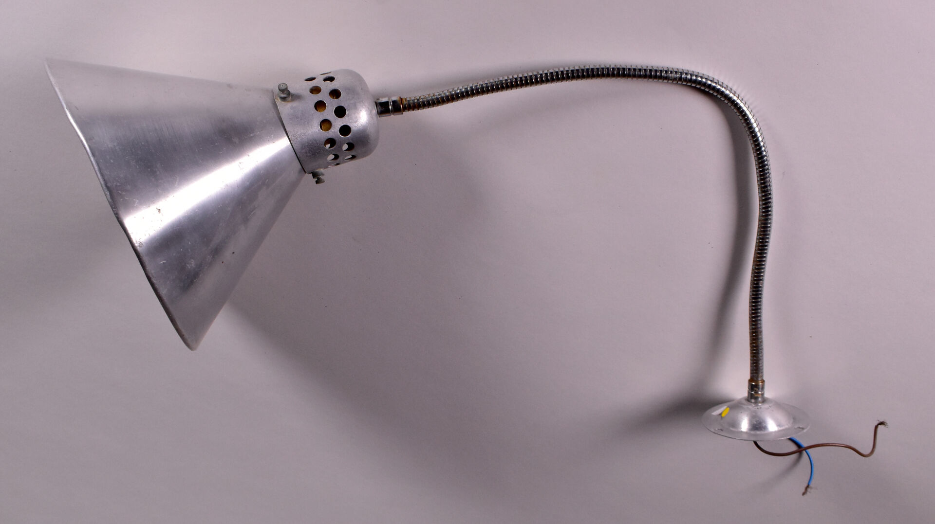 GUILUX. Trois lampes d’atelier en inox à fut en ressort, l’abat-jour conique (petits enfoncements et usures d’usage). Vers 1960. Haut. : 72 cm.