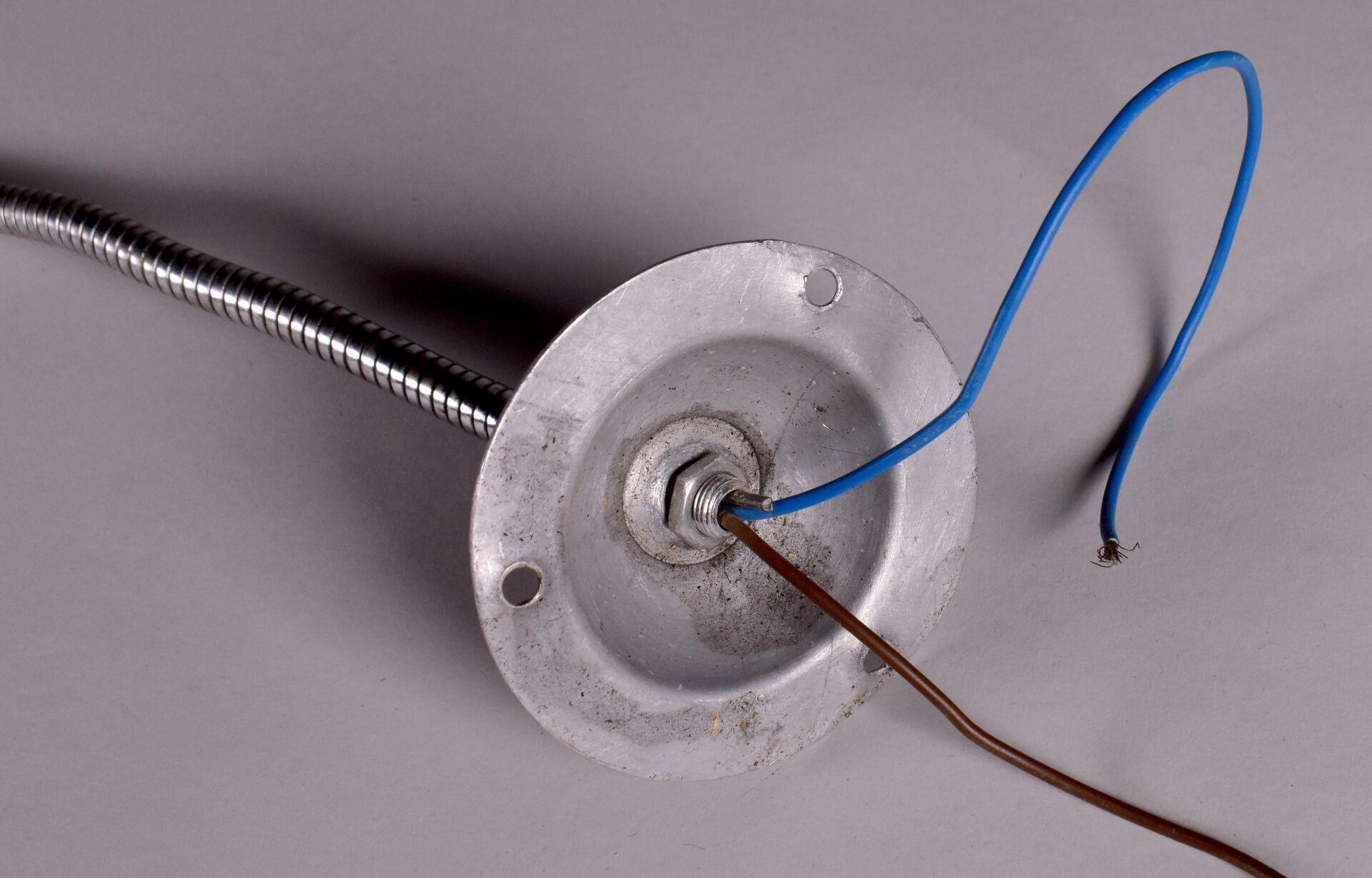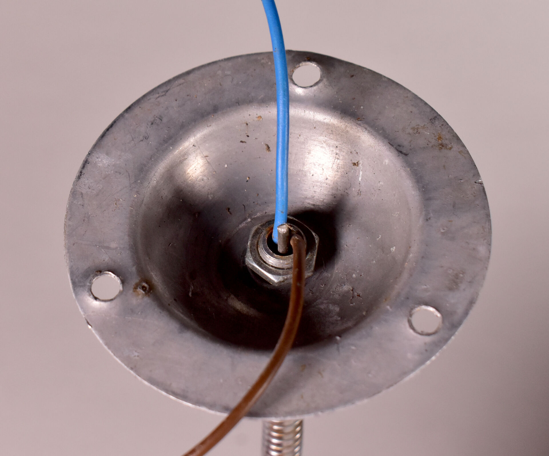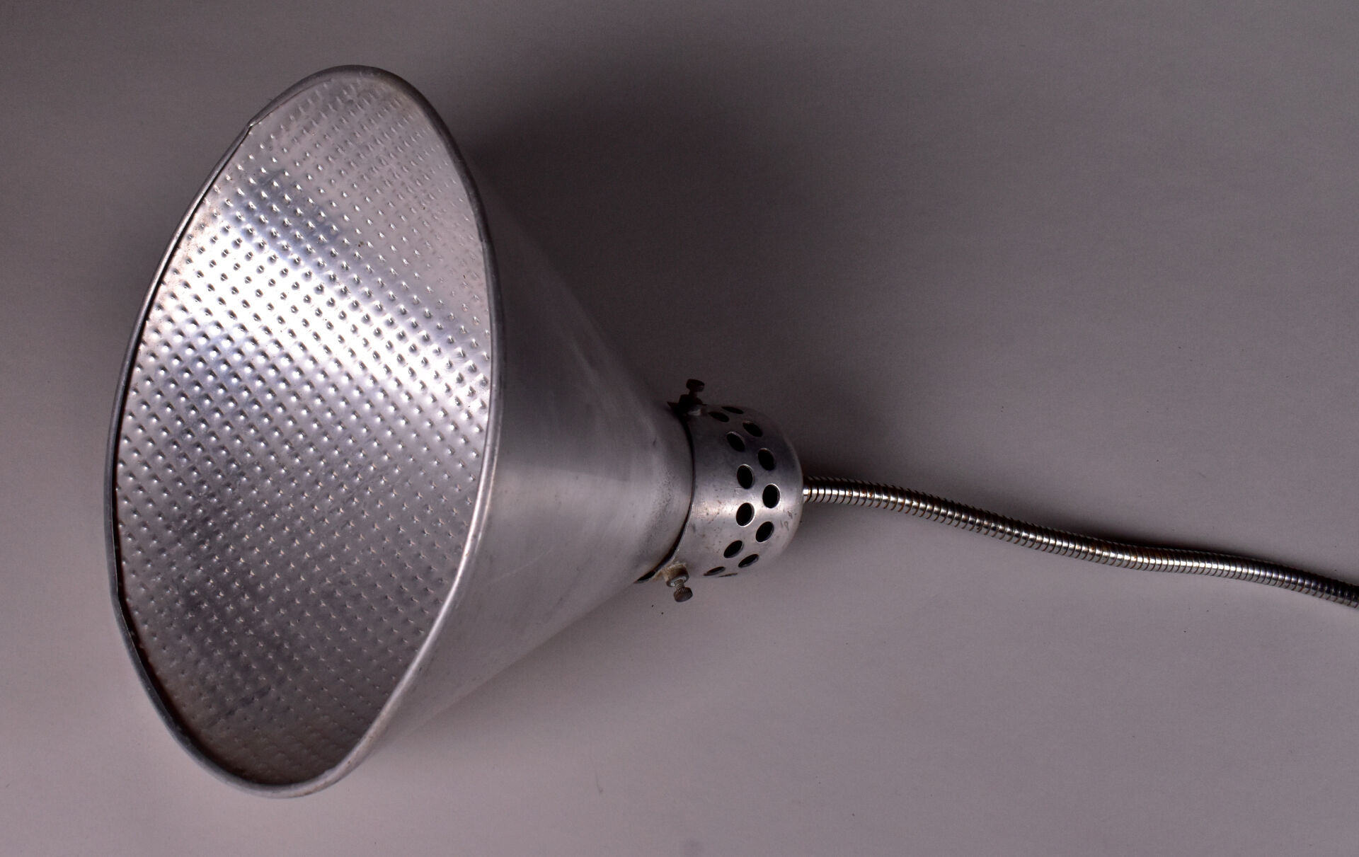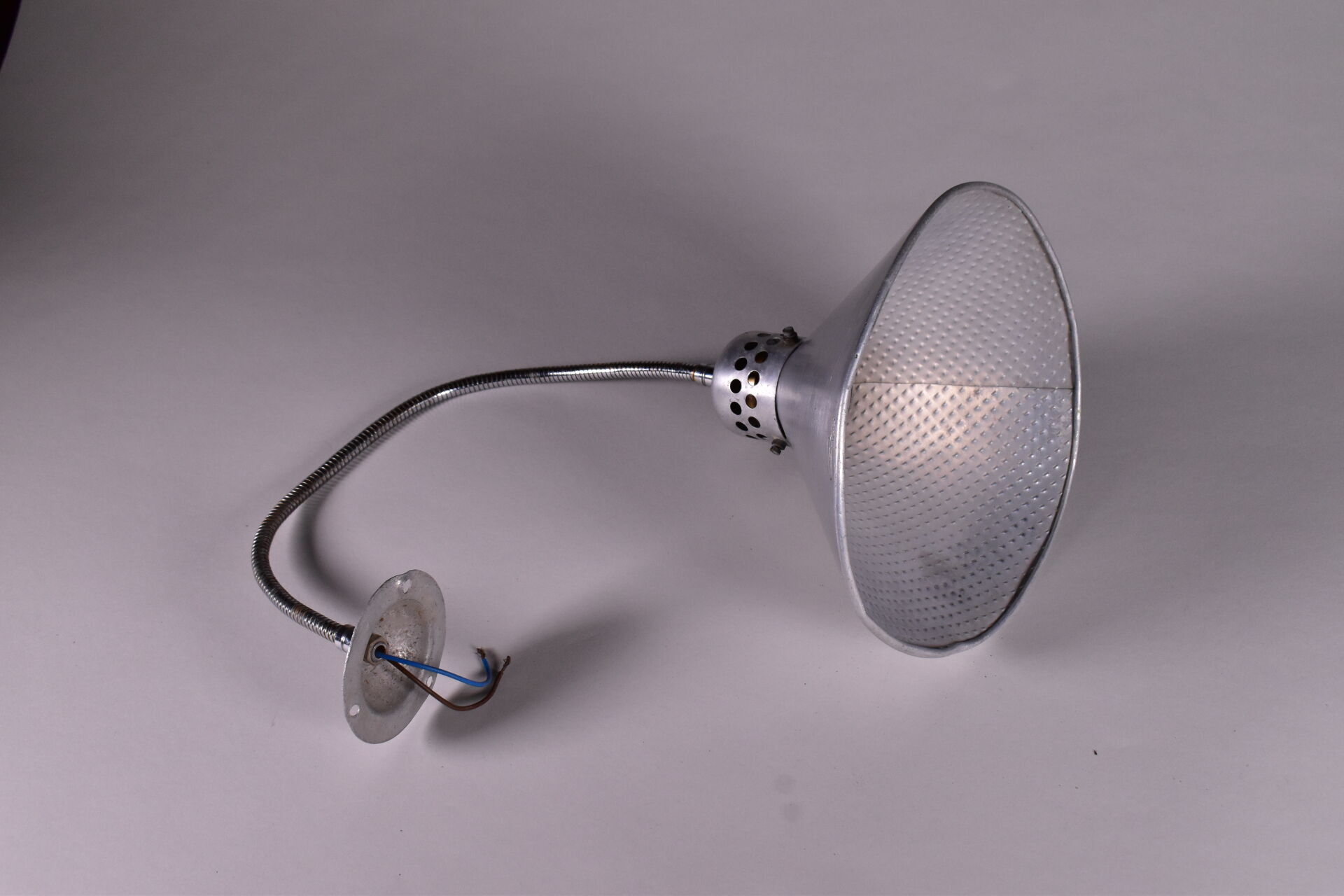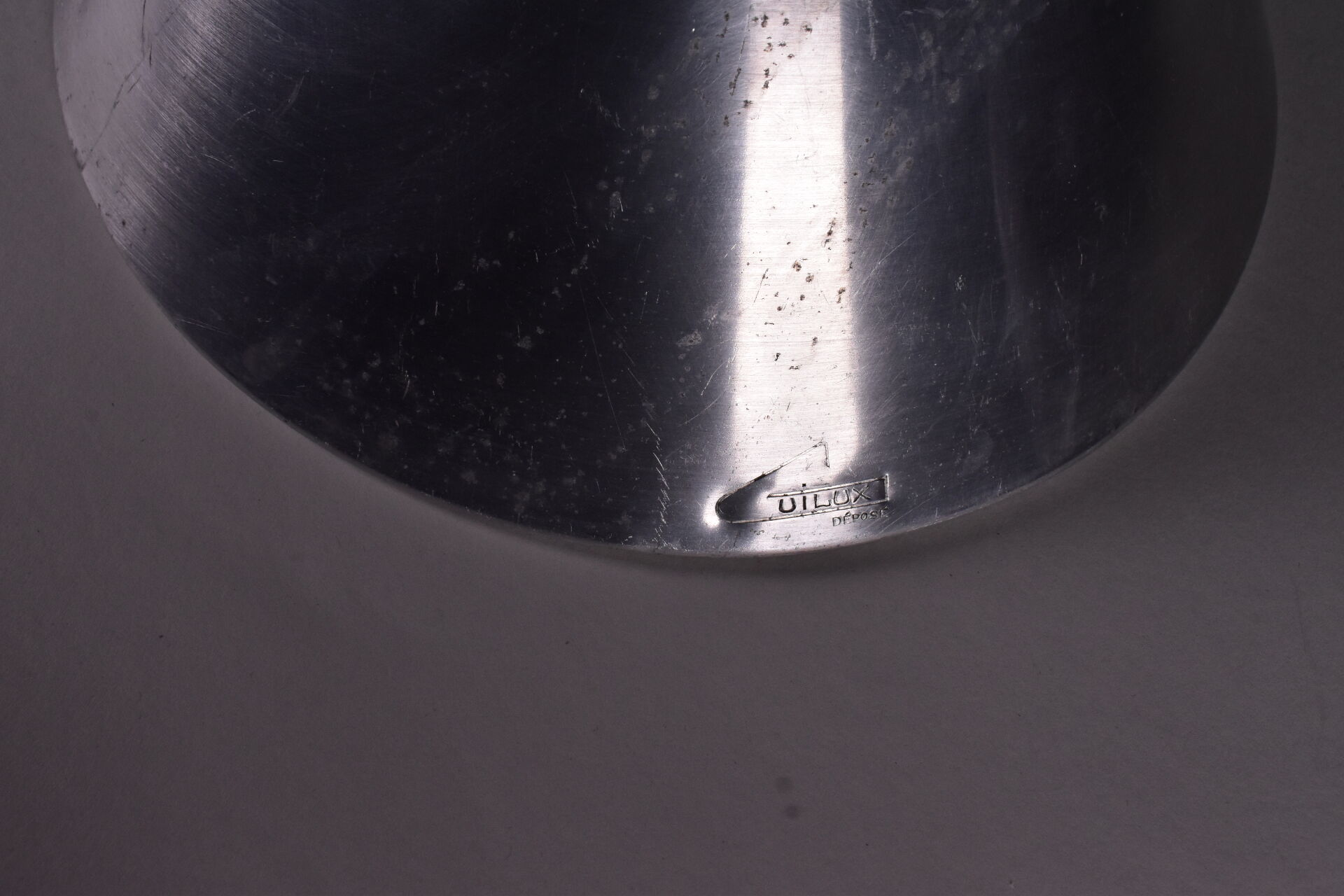 GUILUX. Trois lampes d’atelier en inox à fut en ressort, l’abat-jour conique (petits enfoncements et usures d’usage). Vers 1960. Haut. : 72 cm.