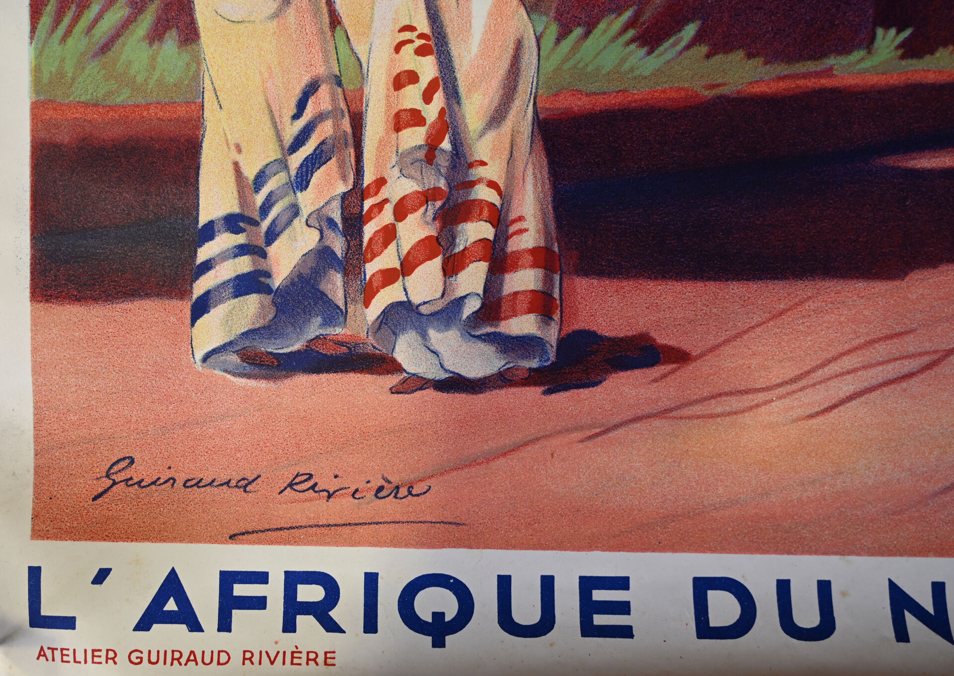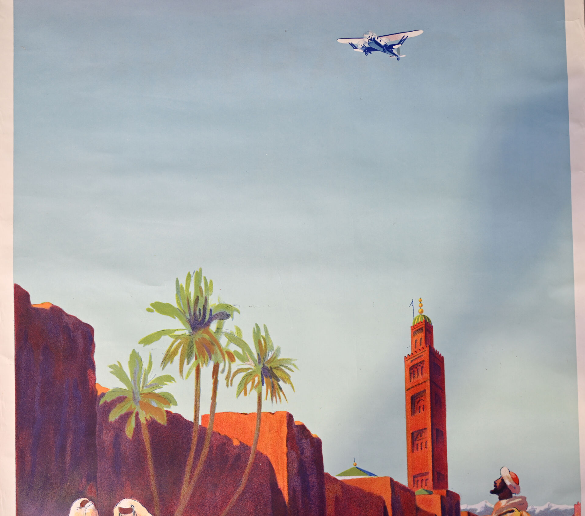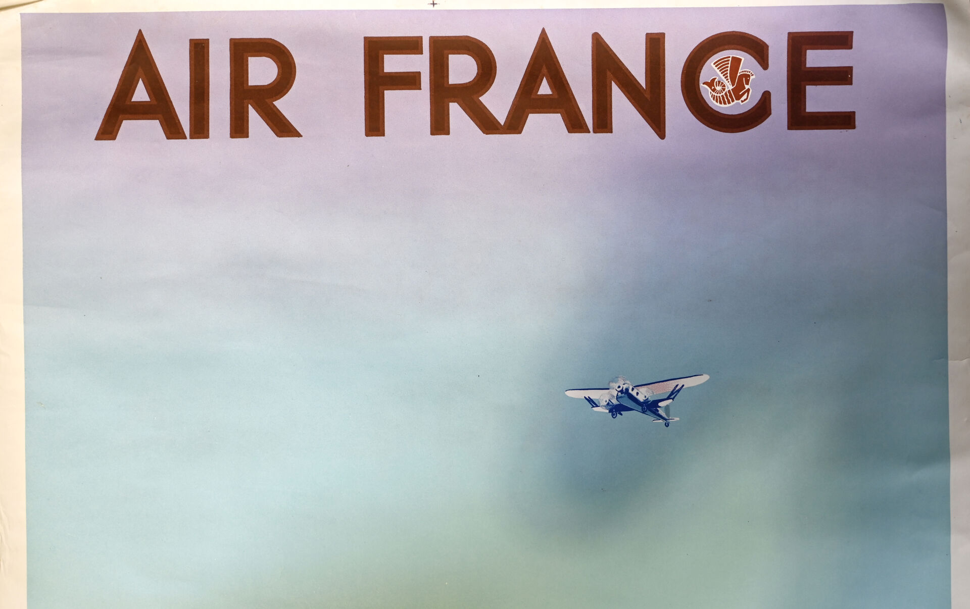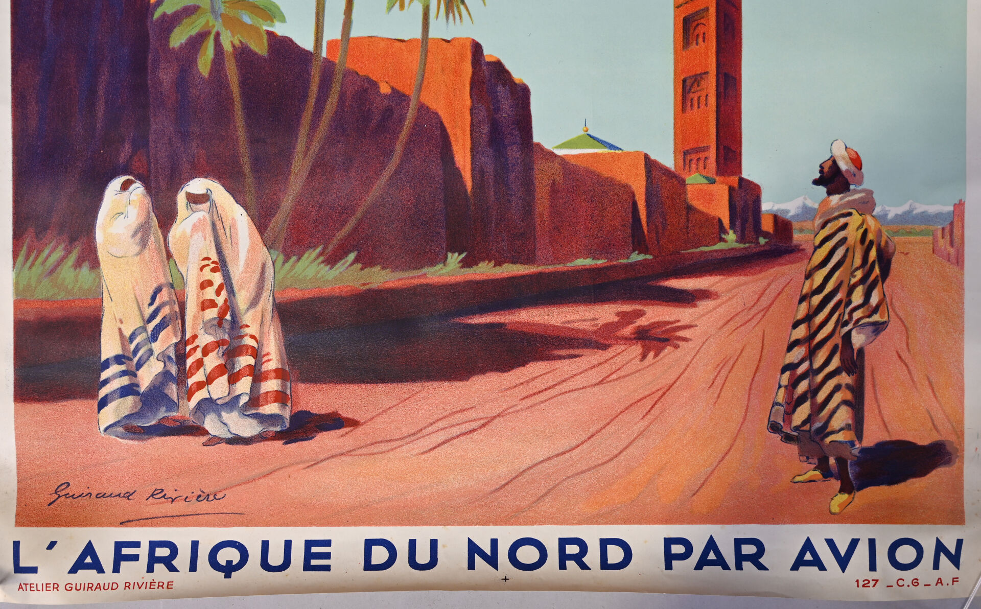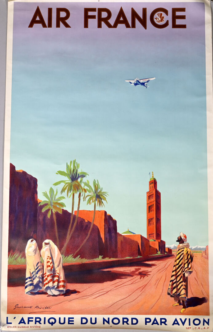 GUIRAUD RIVIERE Maurice. Air France. L’Afrique du Nord par avion. 1934. Affiche lithographique. 127-C6-A.F . Atelier Guiraud Rivière. Non entoilée, très bon état : couleurs vives et fraîches. 100 x 62 cm. Bibliographie : Louis-Jean Calvet – Philippe-Michel Thibault. Affiches Air France. Rêver le Monde. Editions Le Cherche Midi 2006. Page 10.
