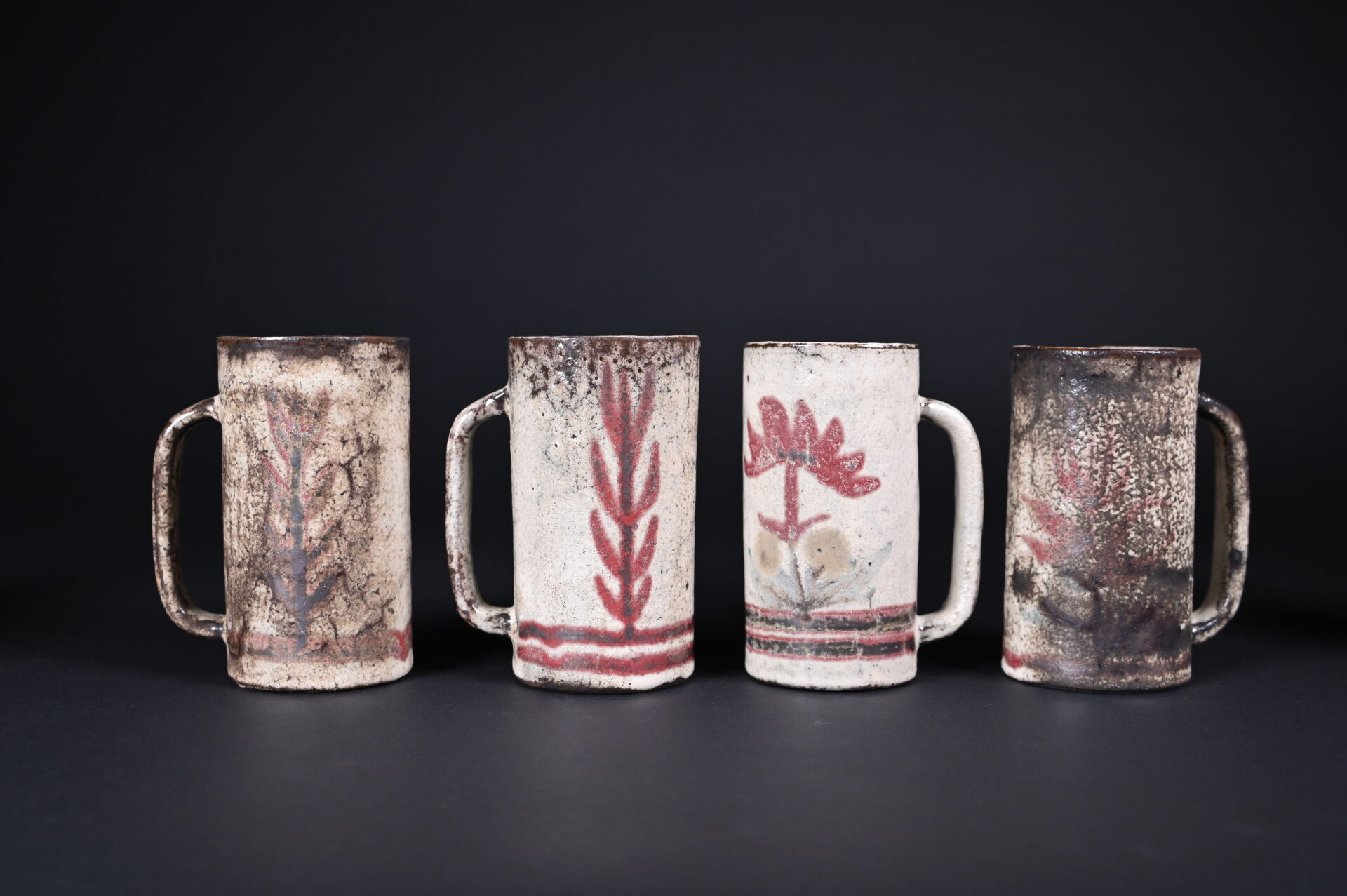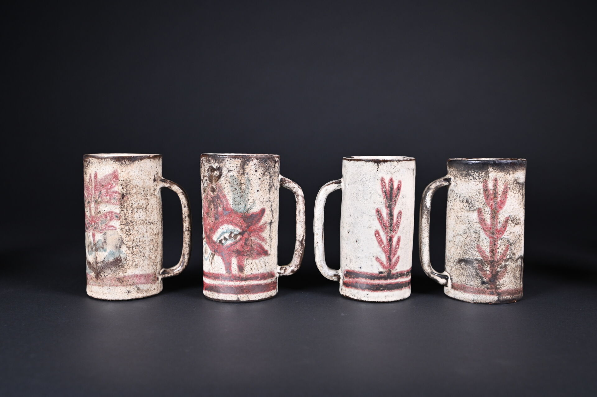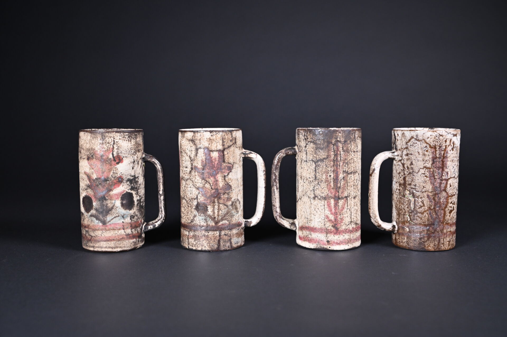 Gustave REYNAUD (1915-1972) Le Mûrier à Vallauris. Ensemble de 8 chopes en céramique à décor végétal sur fond crème (un accident de cuisson (une égrenures). Certaines marquées au dessous. Haut. : 16,5 cm et 13 cm.