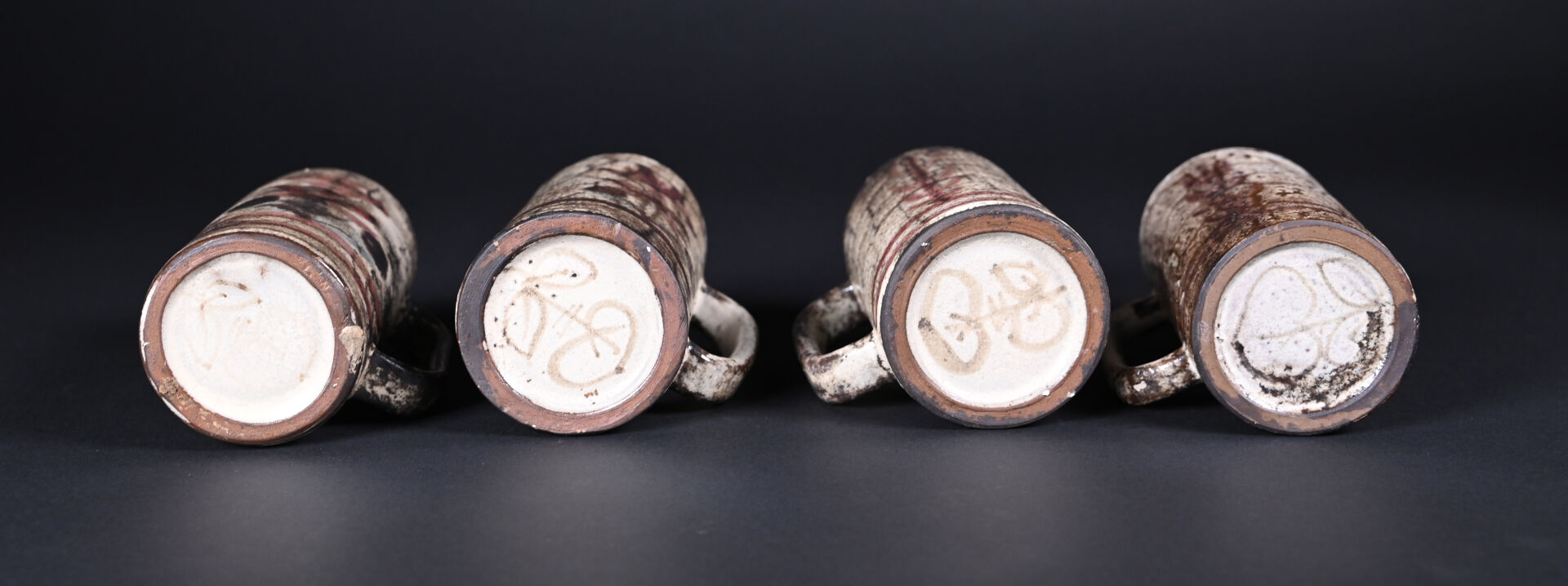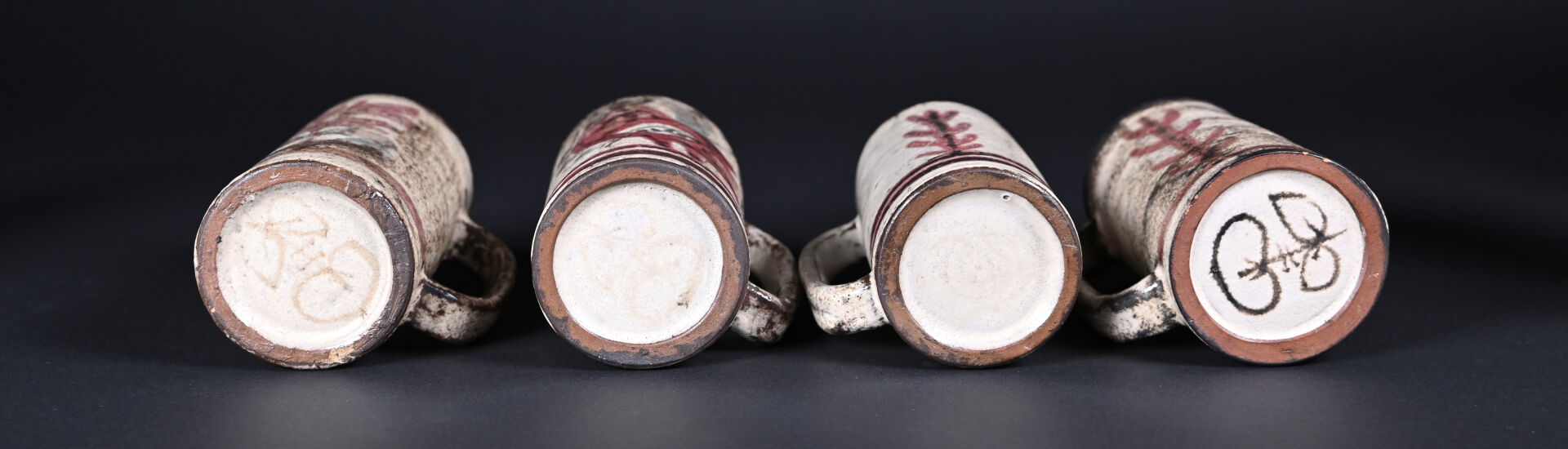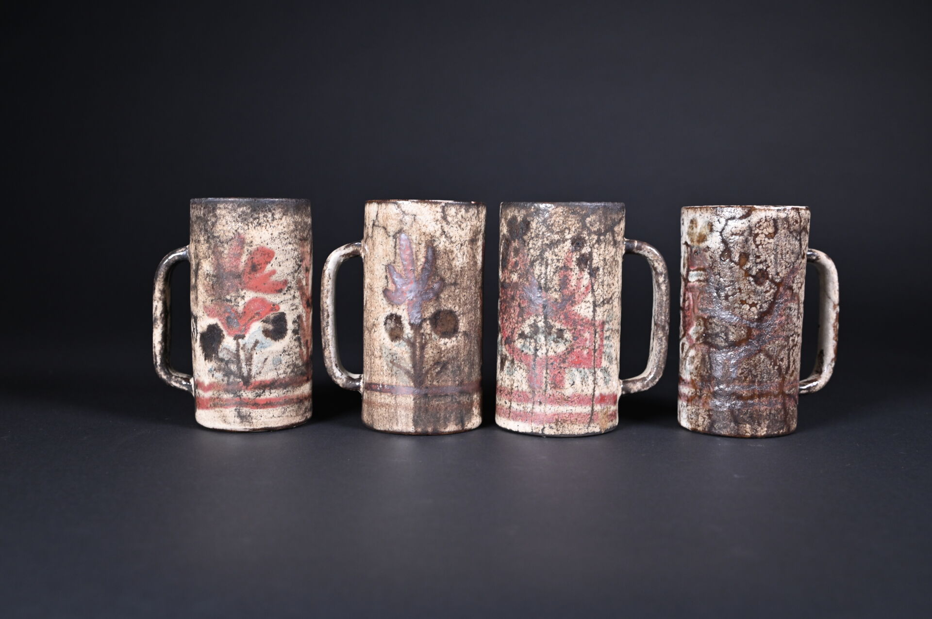 Gustave REYNAUD (1915-1972) Le Mûrier à Vallauris. Ensemble de 8 chopes en céramique à décor végétal sur fond crème (un accident de cuisson (une égrenures). Certaines marquées au dessous. Haut. : 16,5 cm et 13 cm.