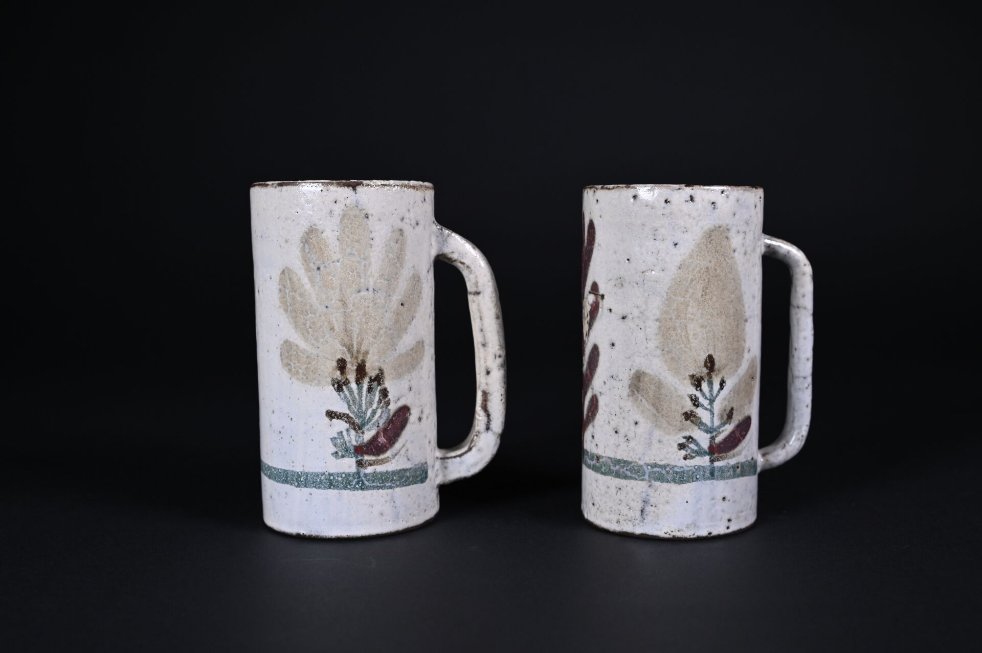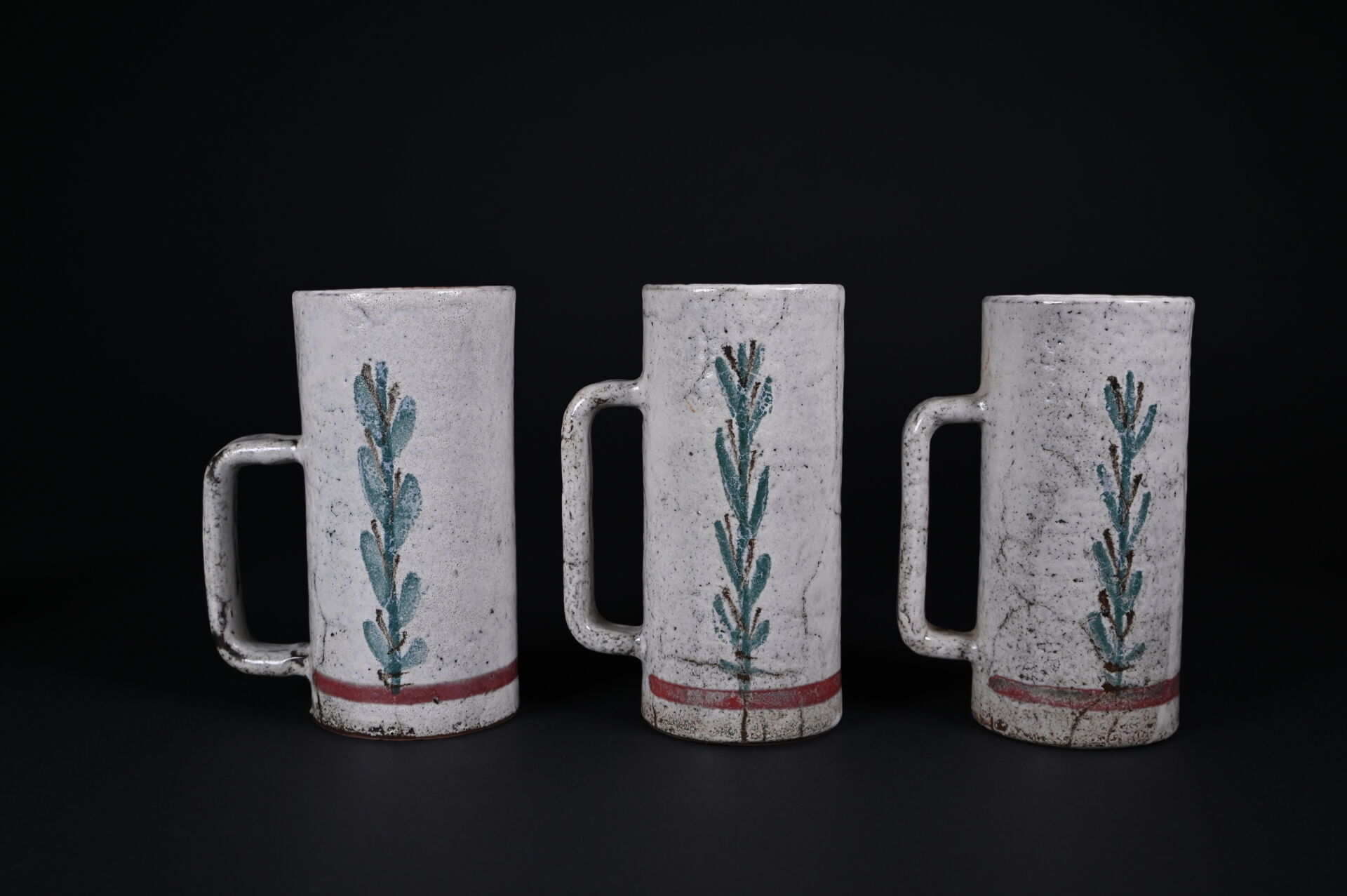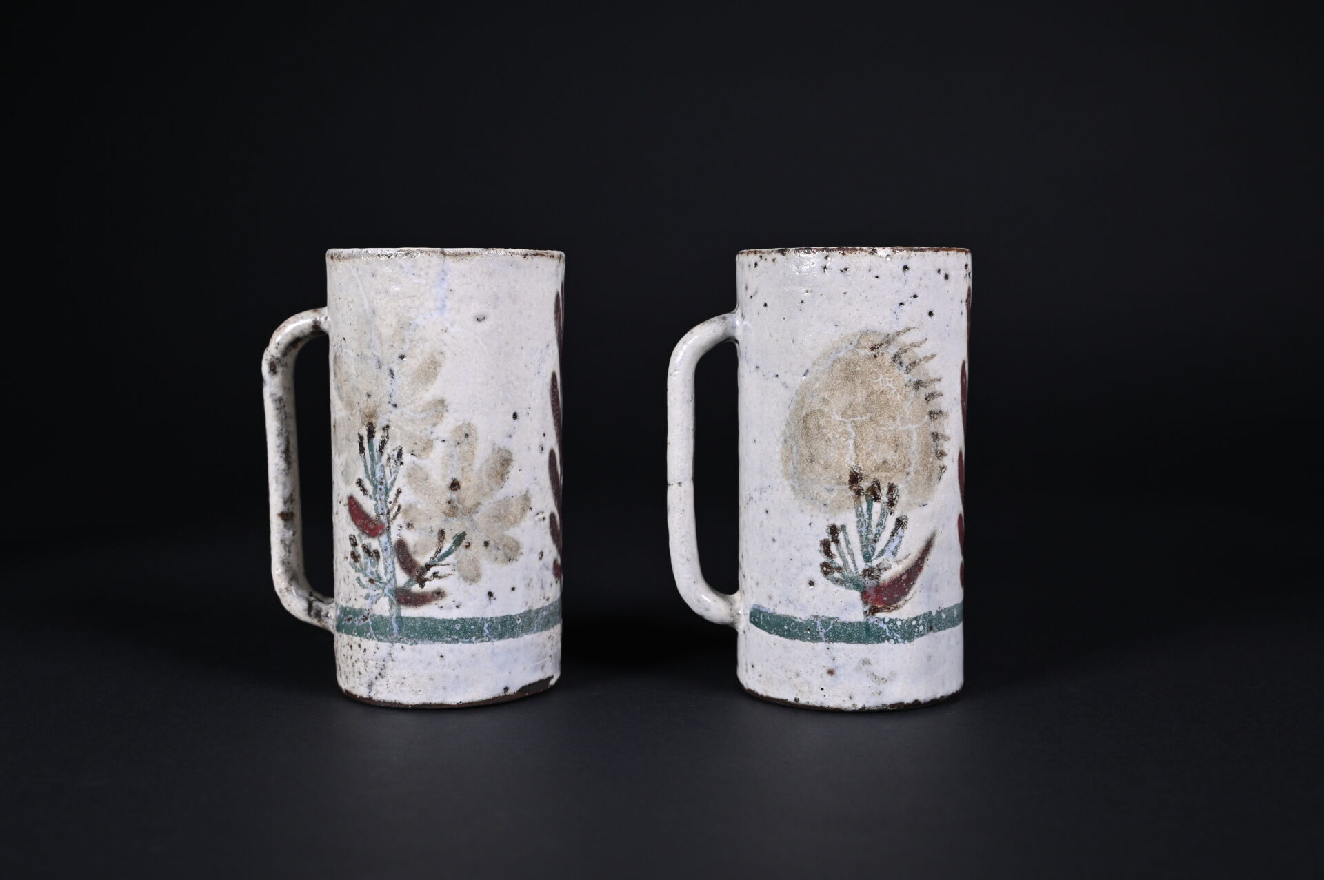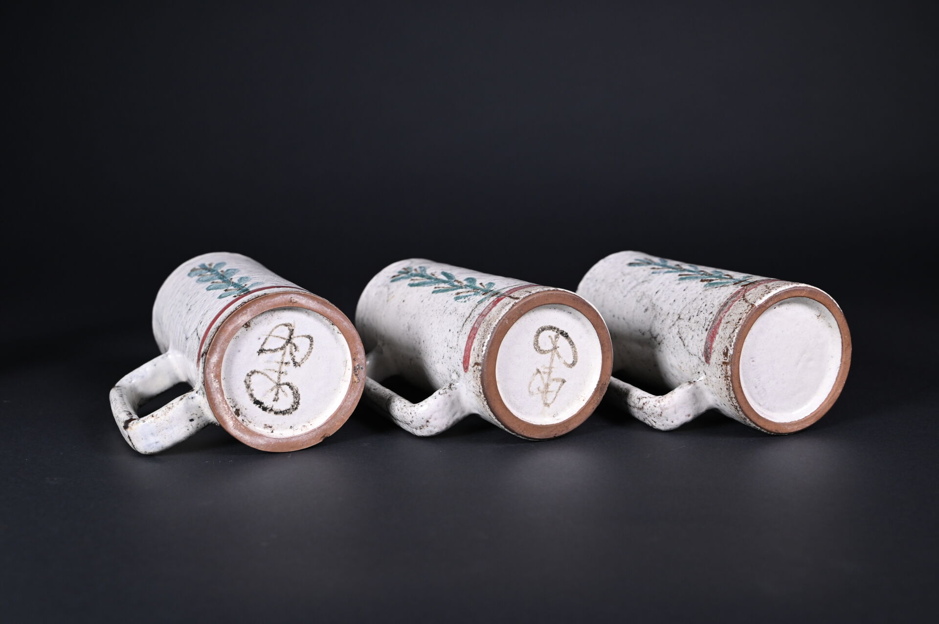 Gustave REYNAUD (1915-1972) Le Mûrier à Vallauris. Ensemble soit 3 grandes chopes et 6 petites en céramique à décor végétal sur fond crème (un accident de cuisson. Marquées au dessous sauf une. Haut. : 16,5 cm et 13 cm.
