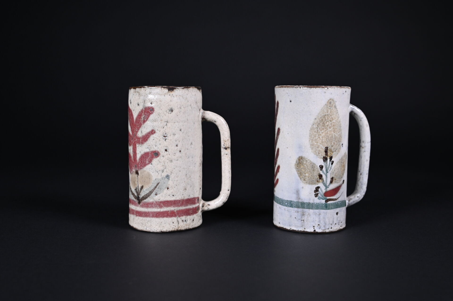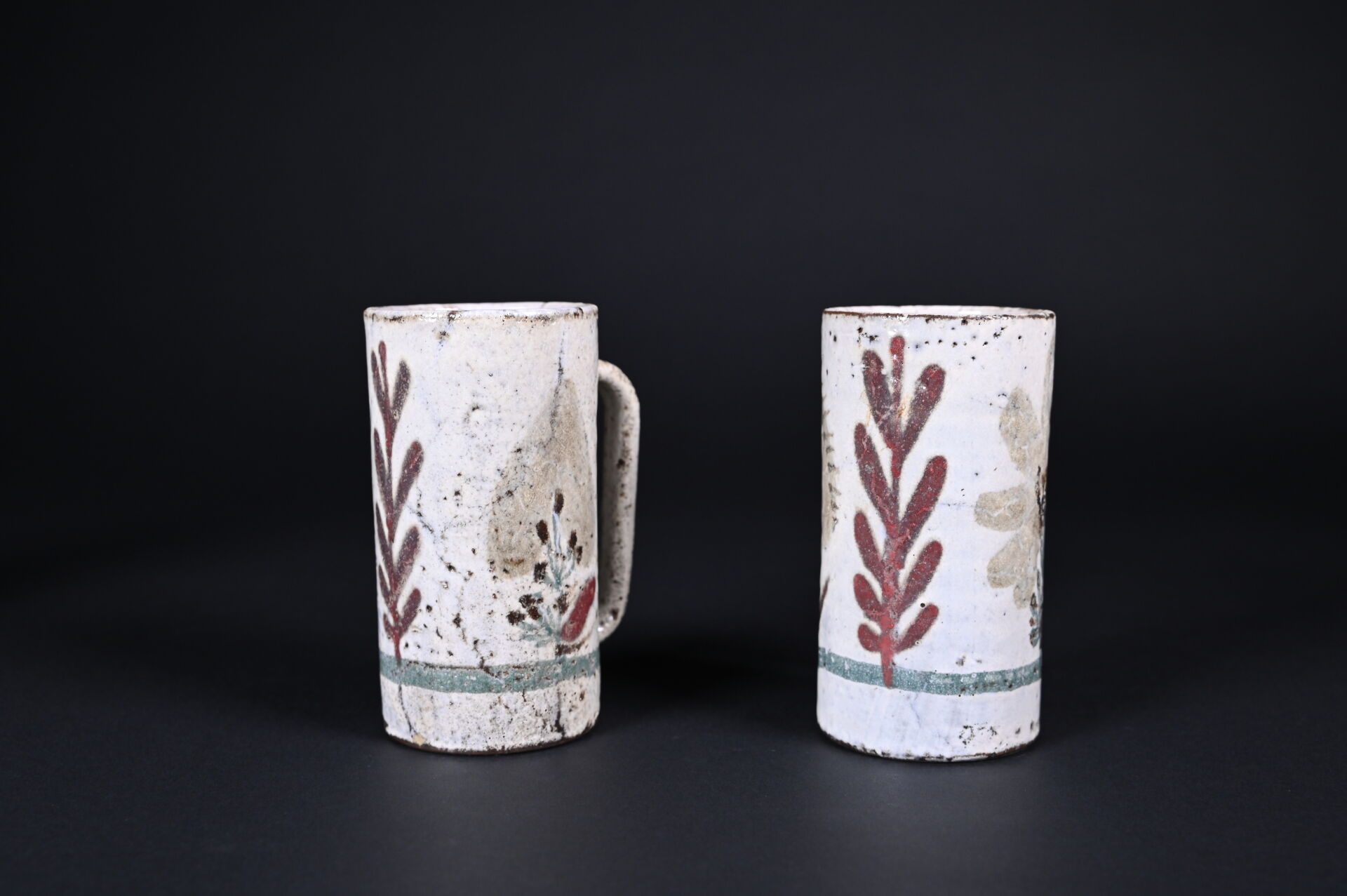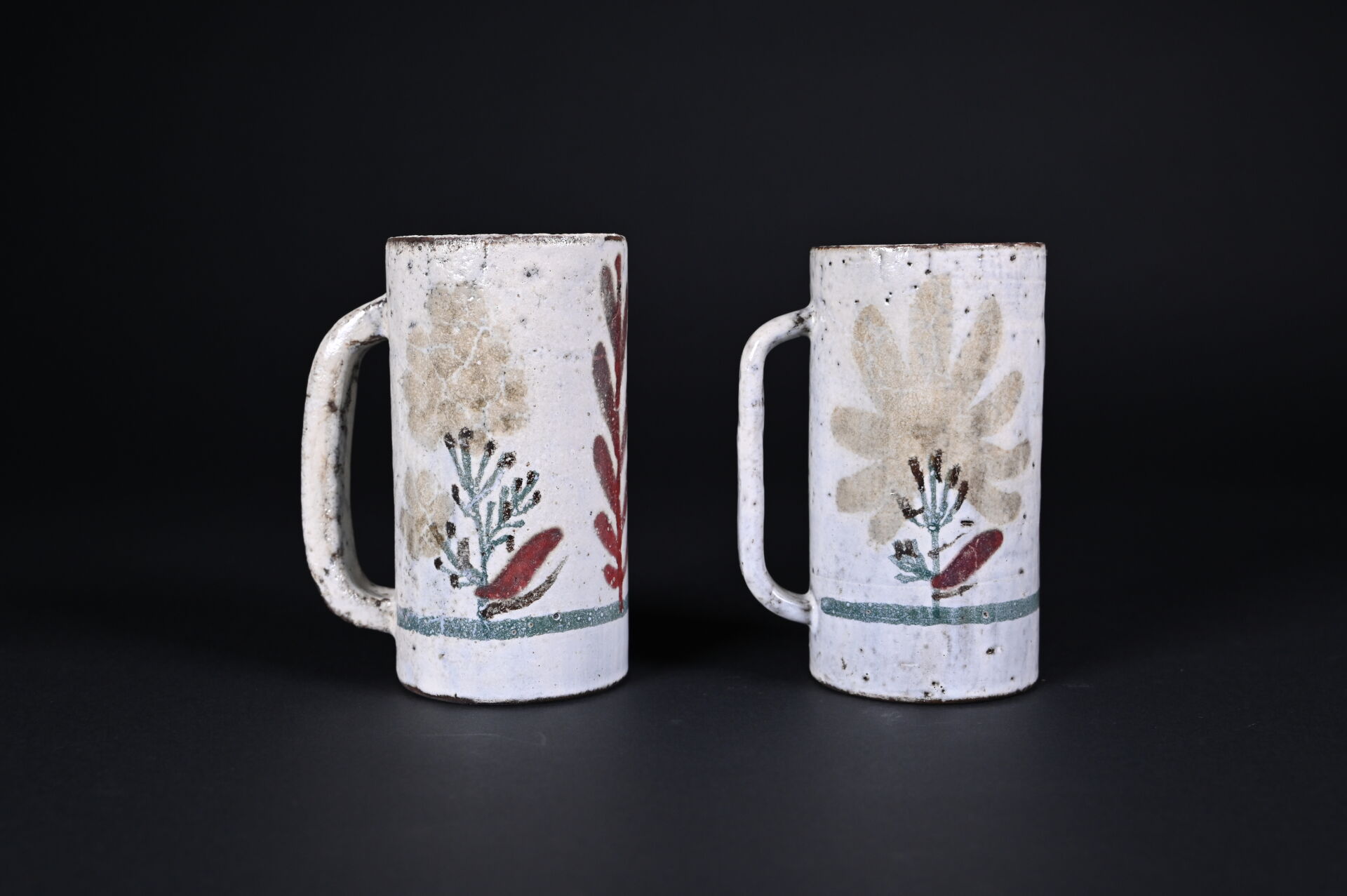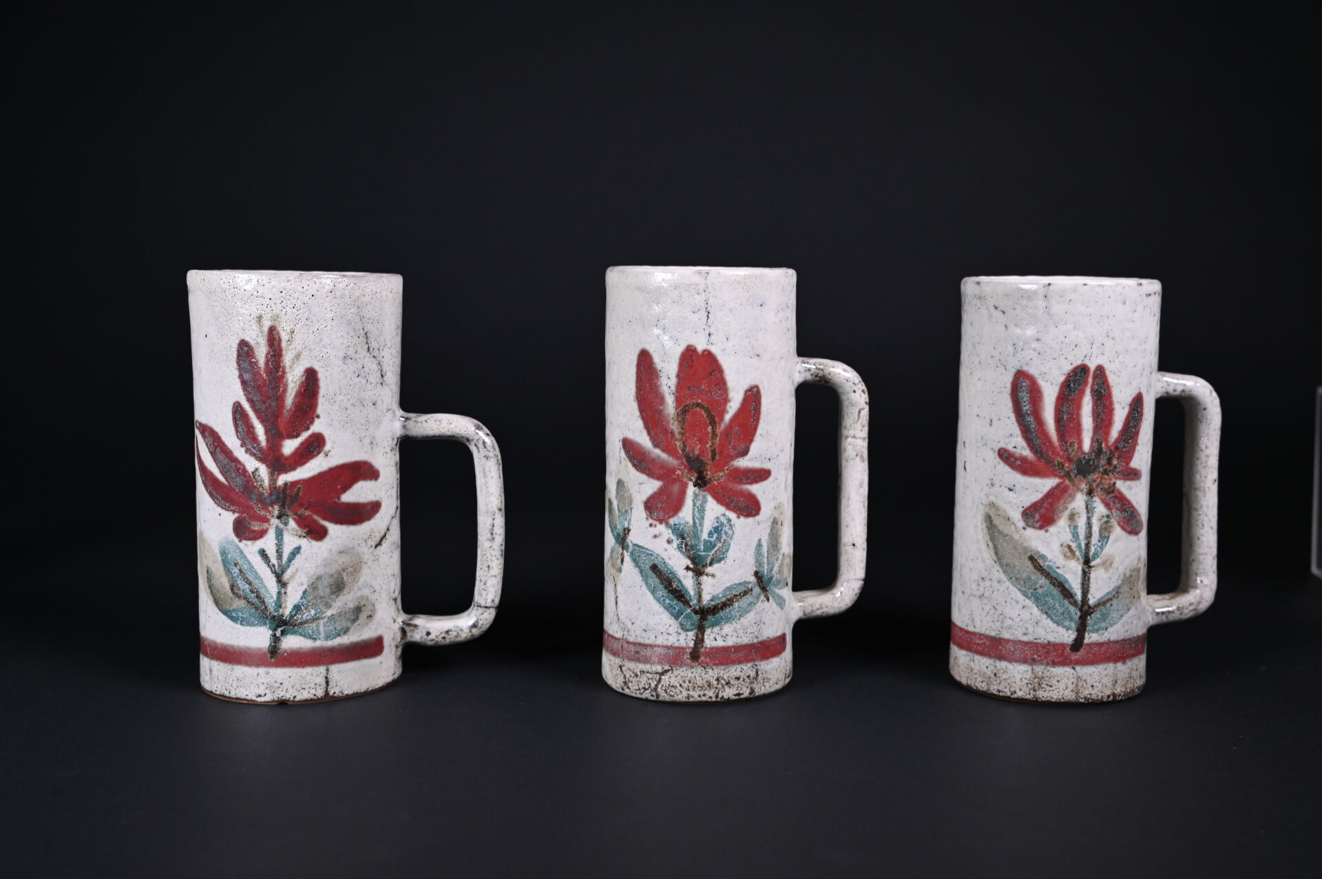 Gustave REYNAUD (1915-1972) Le Mûrier à Vallauris. Ensemble soit 3 grandes chopes et 6 petites en céramique à décor végétal sur fond crème (un accident de cuisson. Marquées au dessous sauf une. Haut. : 16,5 cm et 13 cm.