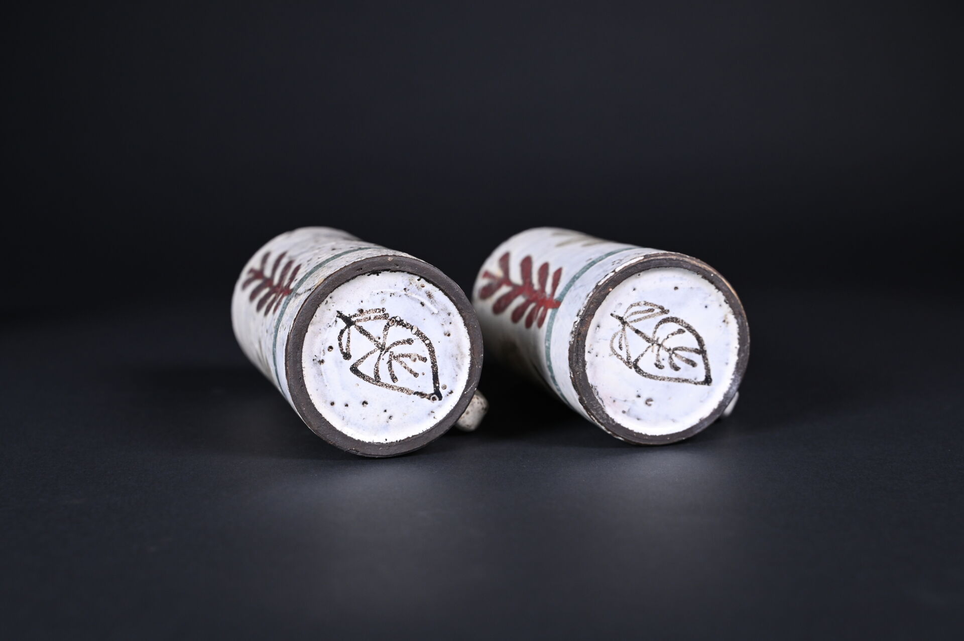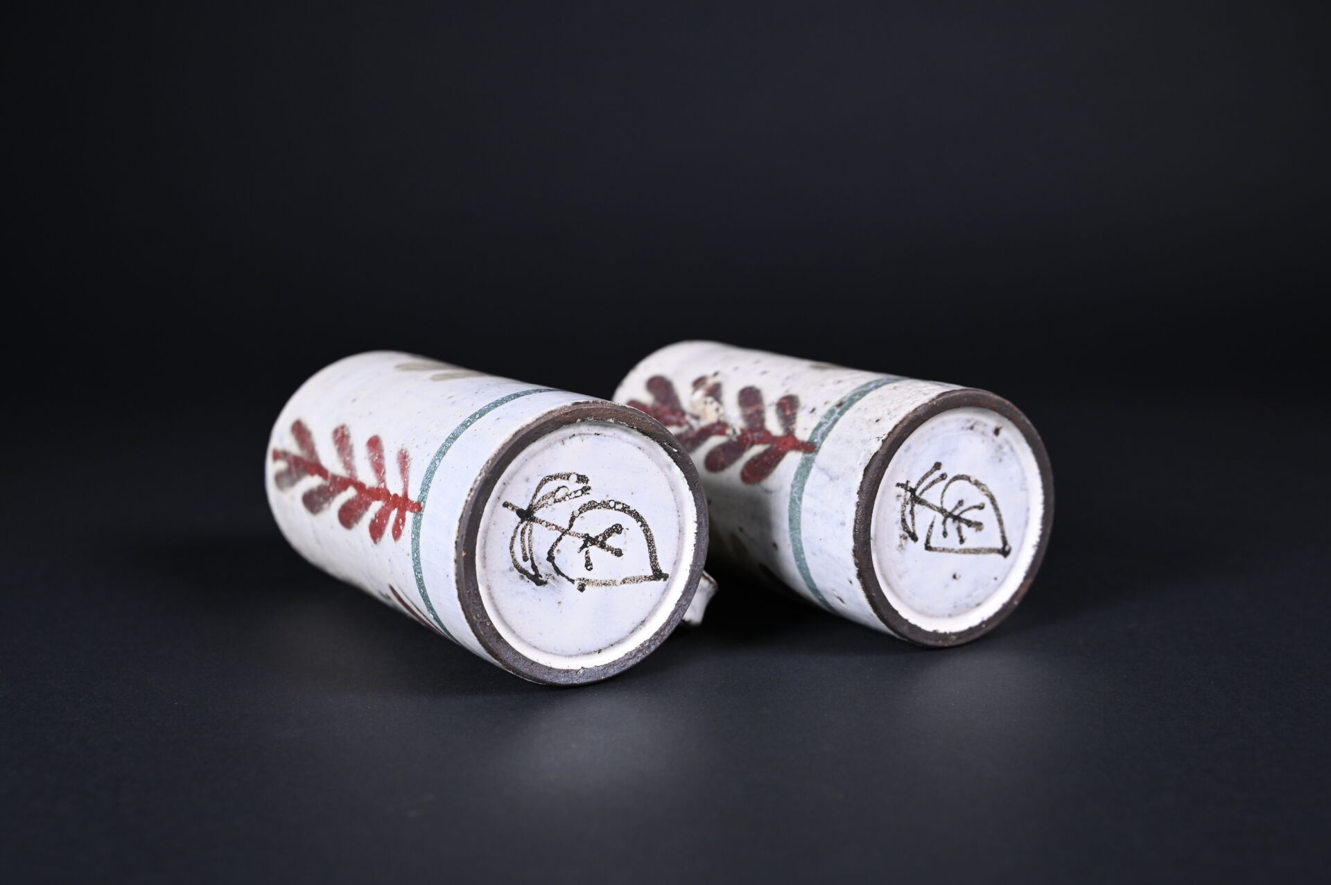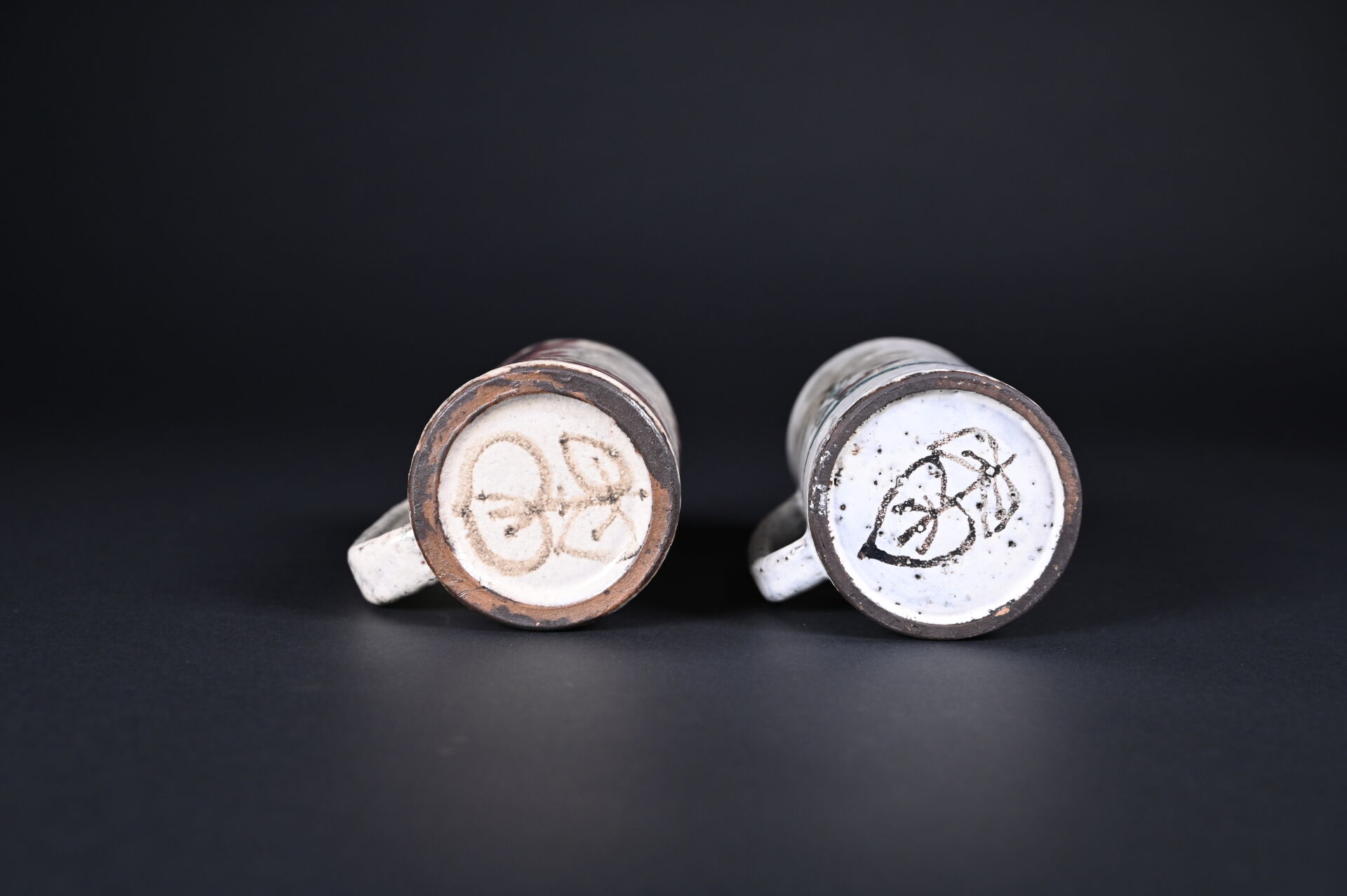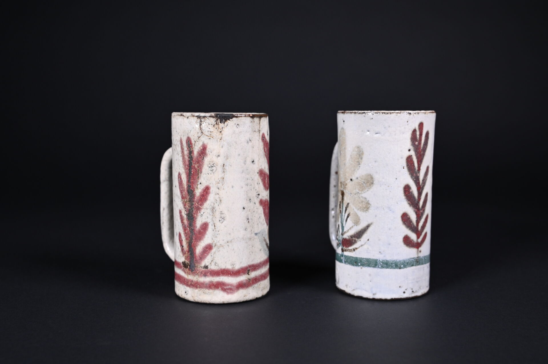 Gustave REYNAUD (1915-1972) Le Mûrier à Vallauris. Ensemble soit 3 grandes chopes et 6 petites en céramique à décor végétal sur fond crème (un accident de cuisson. Marquées au dessous sauf une. Haut. : 16,5 cm et 13 cm.