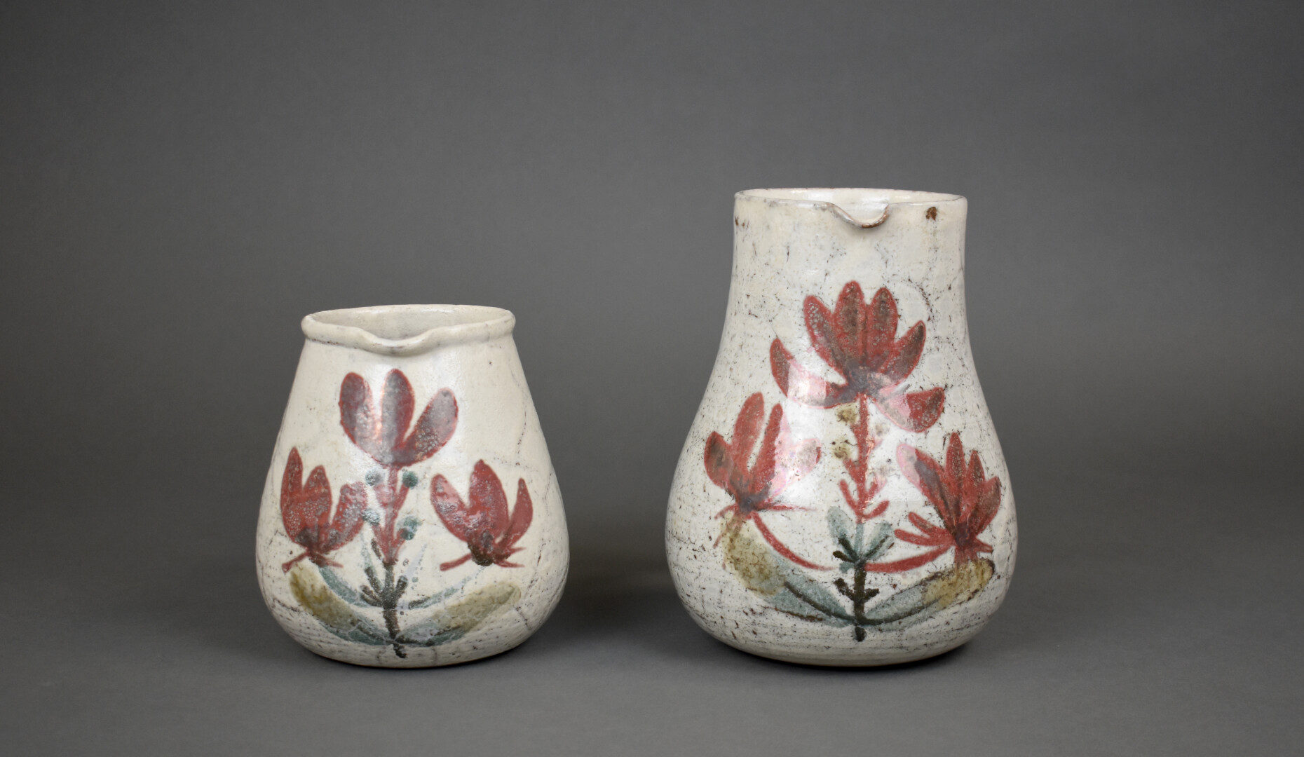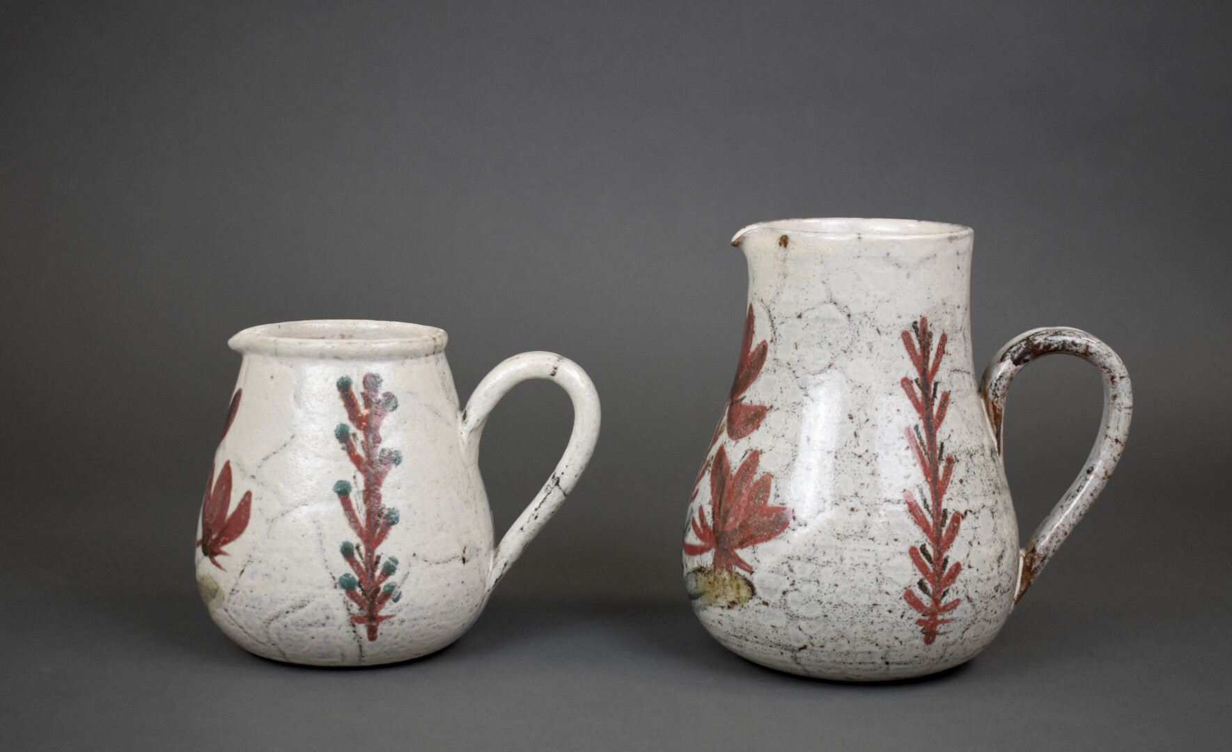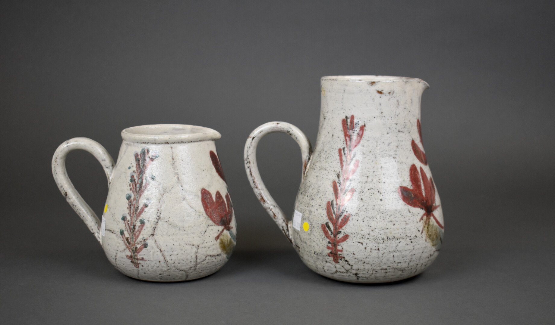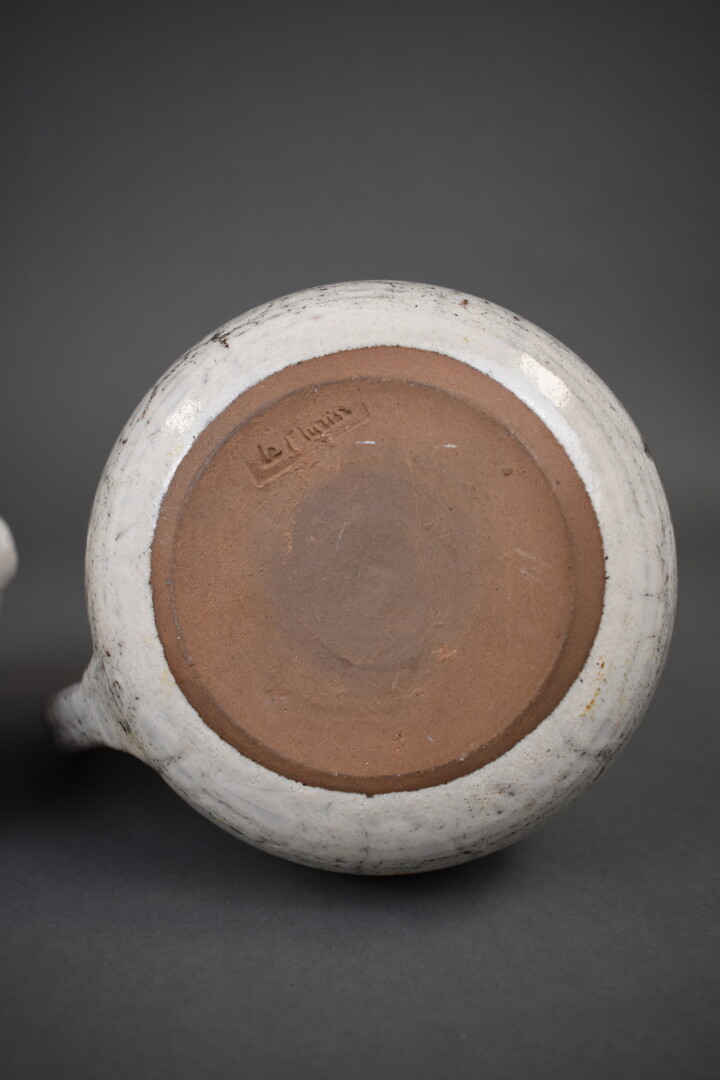 Gustave REYNAUD (1915-1972) les mûriers. Deux pichets en céramique à décor émaillé de feuilles sur fond crème. Haut. : 19 cm.