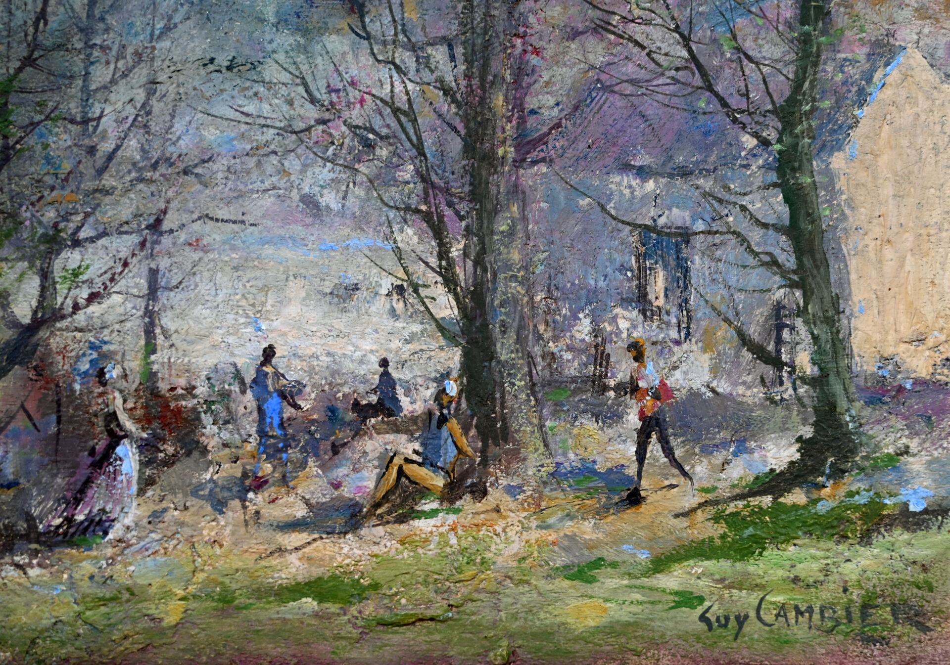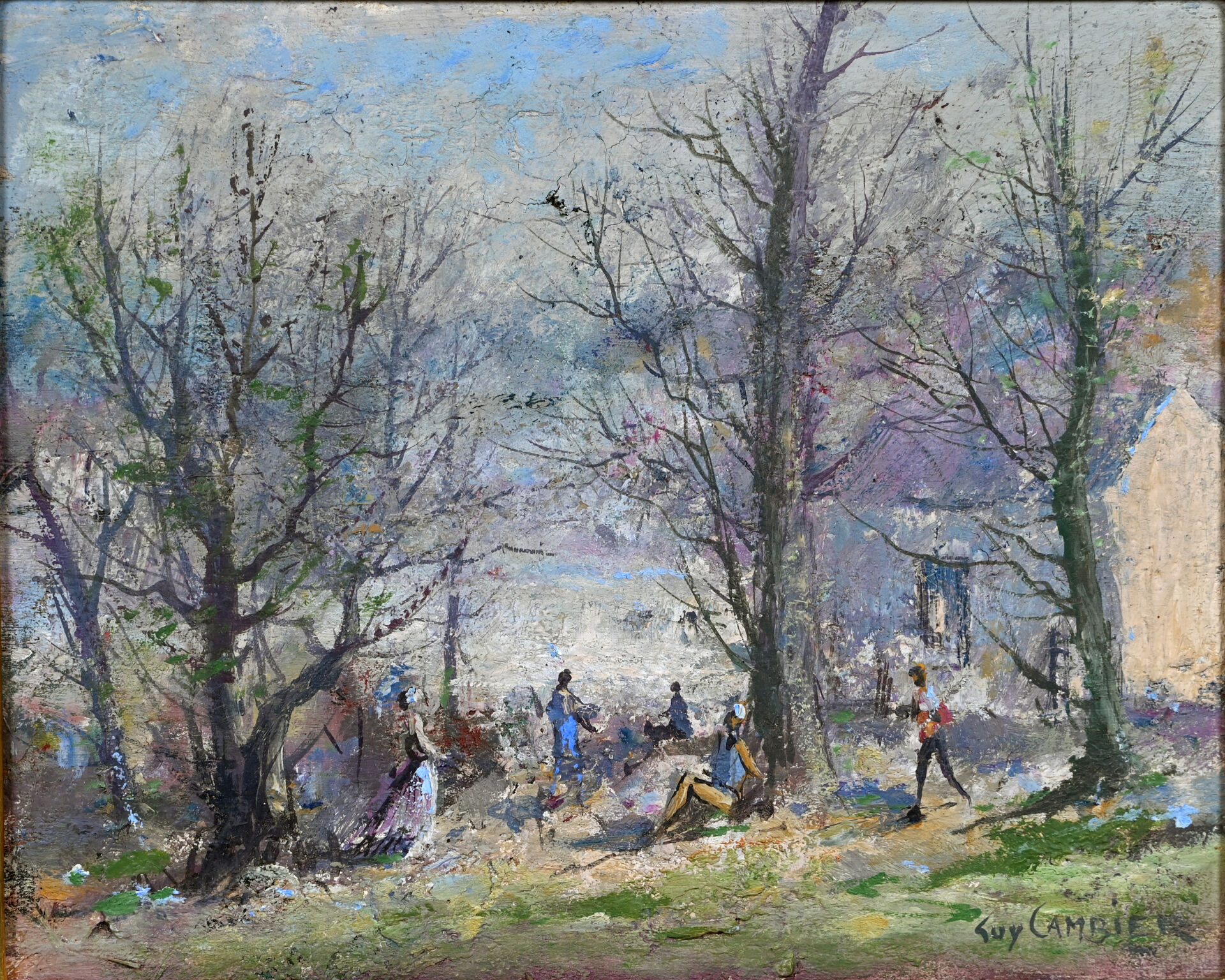 Guy CAMBIER (1923 – 2008) Après-midi dans les bois. Huile sur panneau de bois signée en bas à droite. 22 x 27 cm.