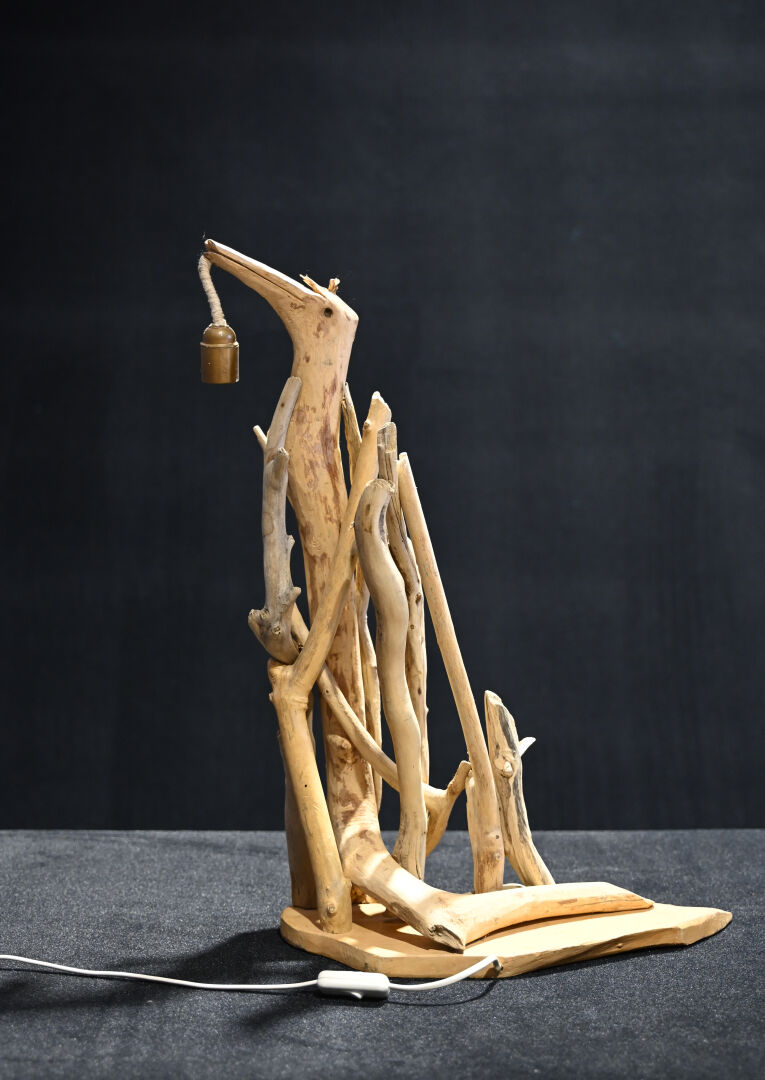 Guy SAINT AROMAN (XXe – XXIe siècle). Pied de lampe en bois flotté. 69 x 45 x 20 cm.