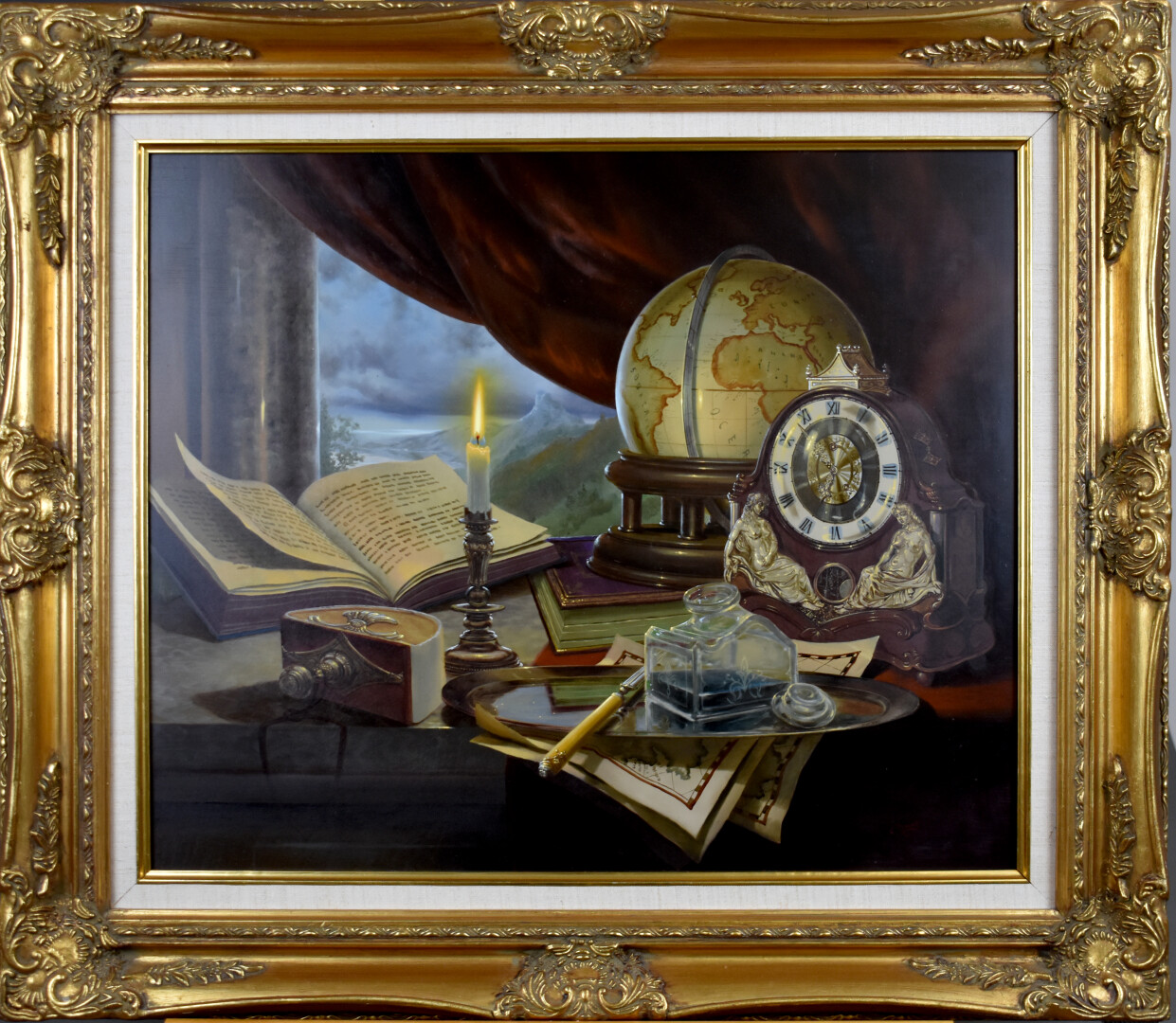 Gyula BOROS (née à Budapest en 1950). « Nature morte à l’encrier ». Huile sur panneau signée en bas à droite. 50,5 x 60 cm.