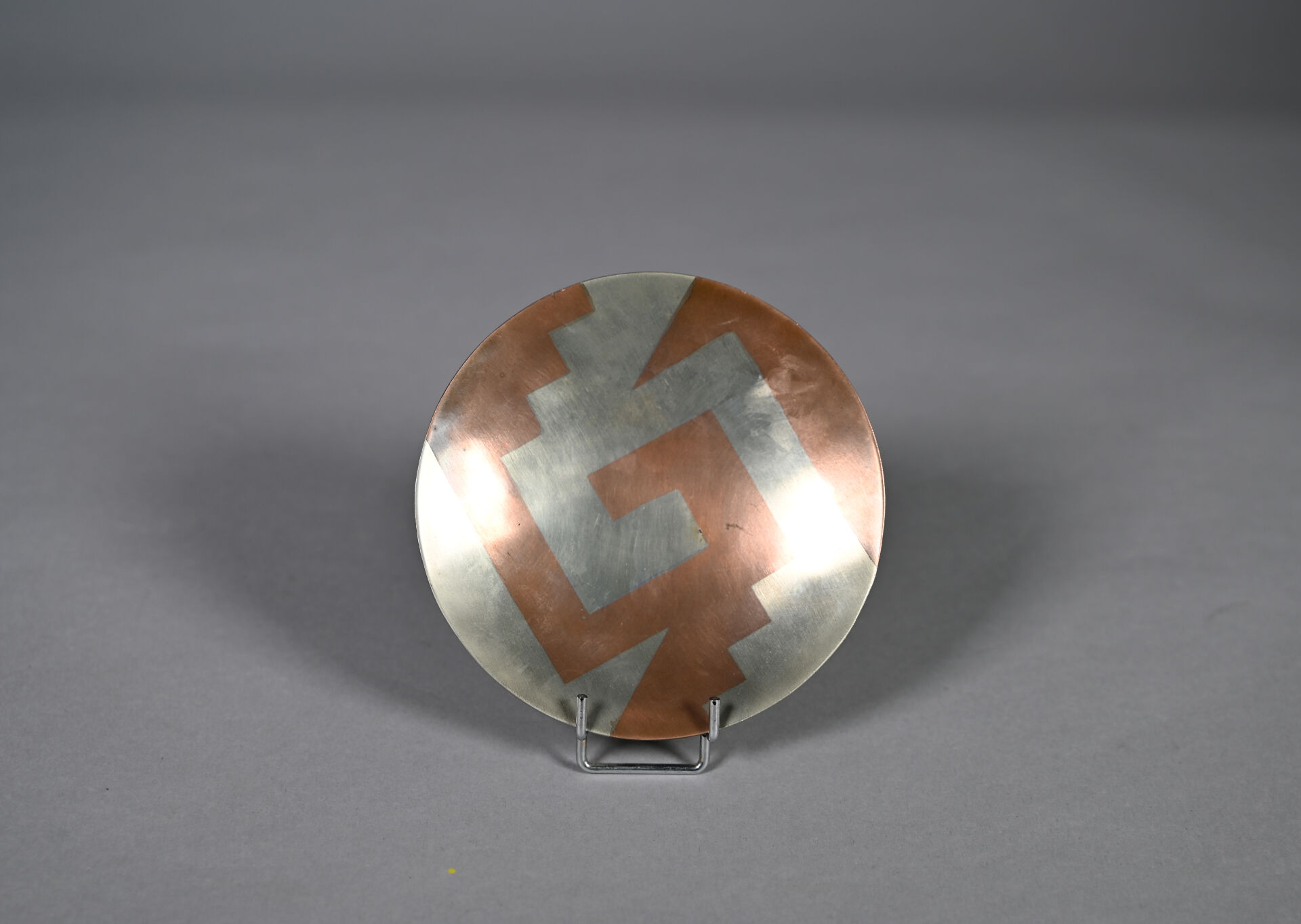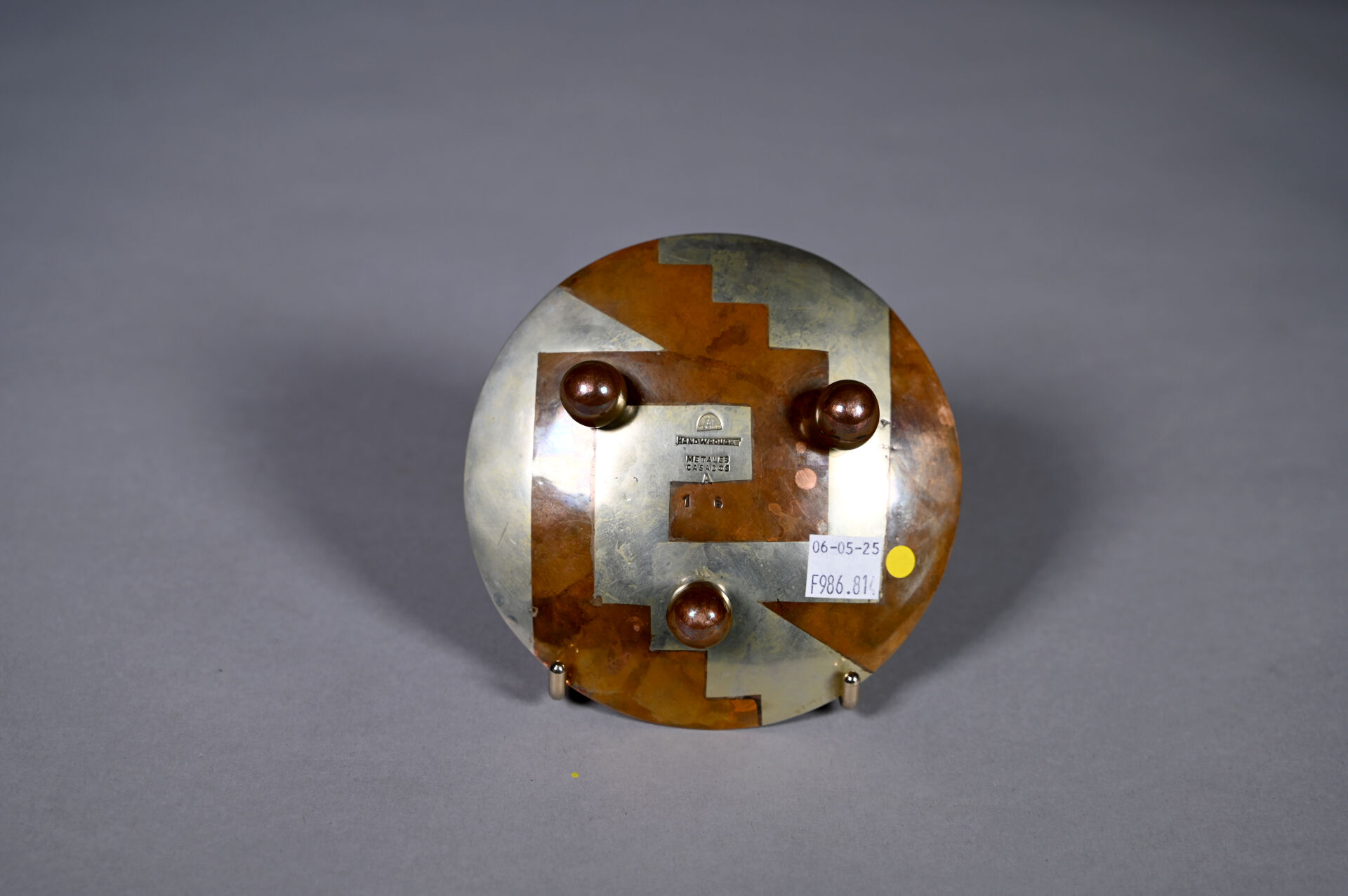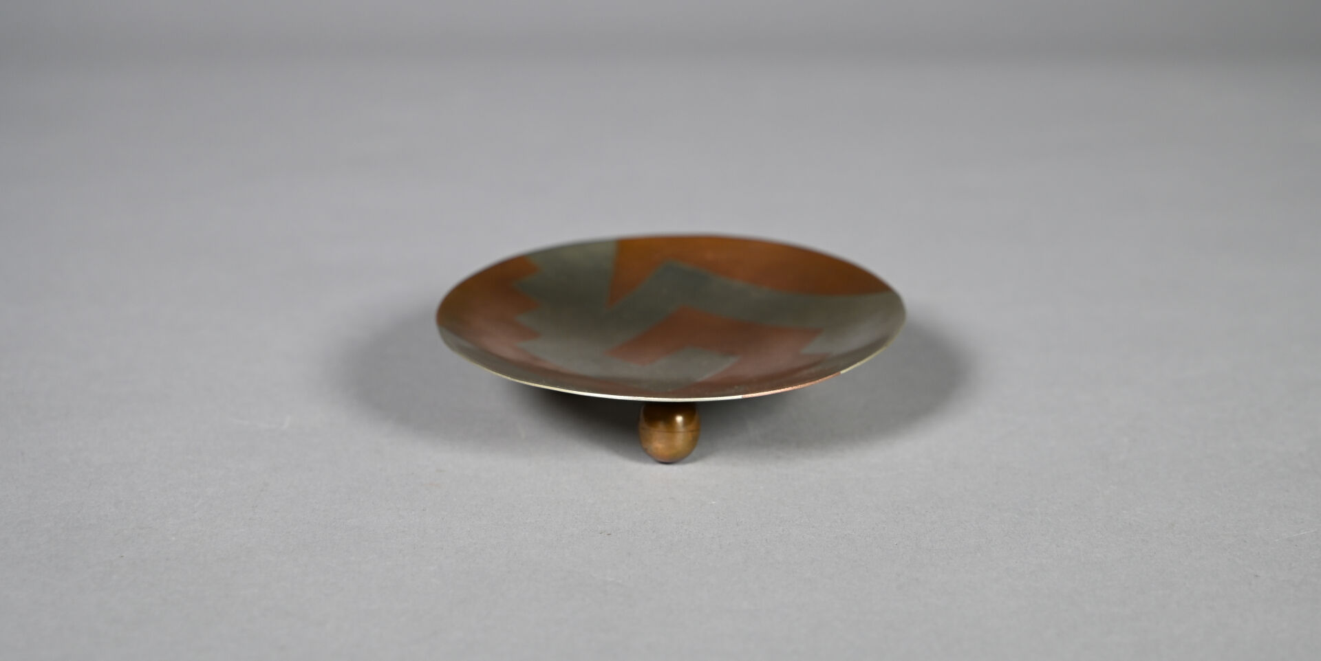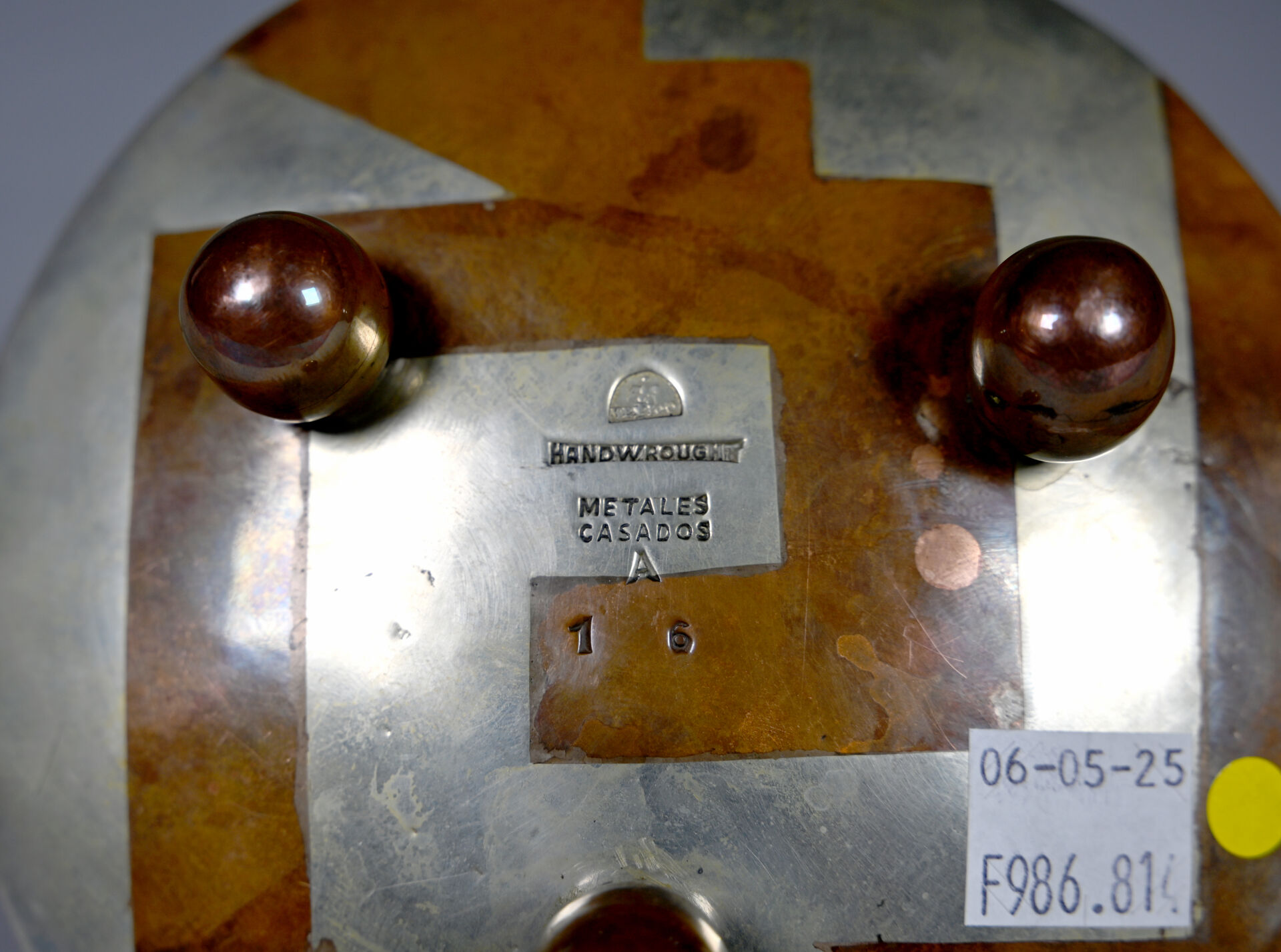 HANDWROUGHT – LOS CASTILLO. Vide-poche en métal reposant sur 3 pieds boules. Travail mexicain de dinanderie. Diam. : 13,4 cm.