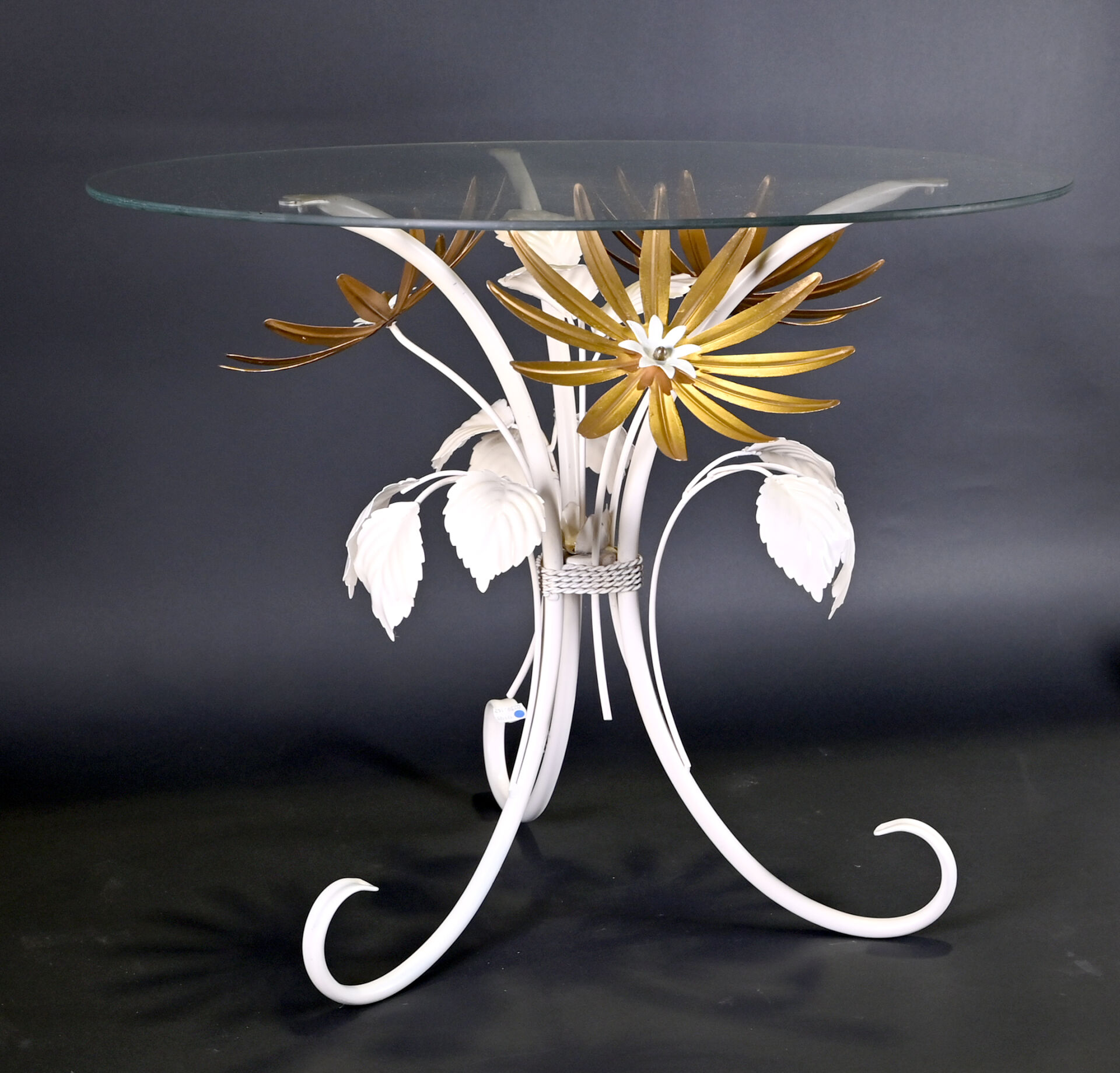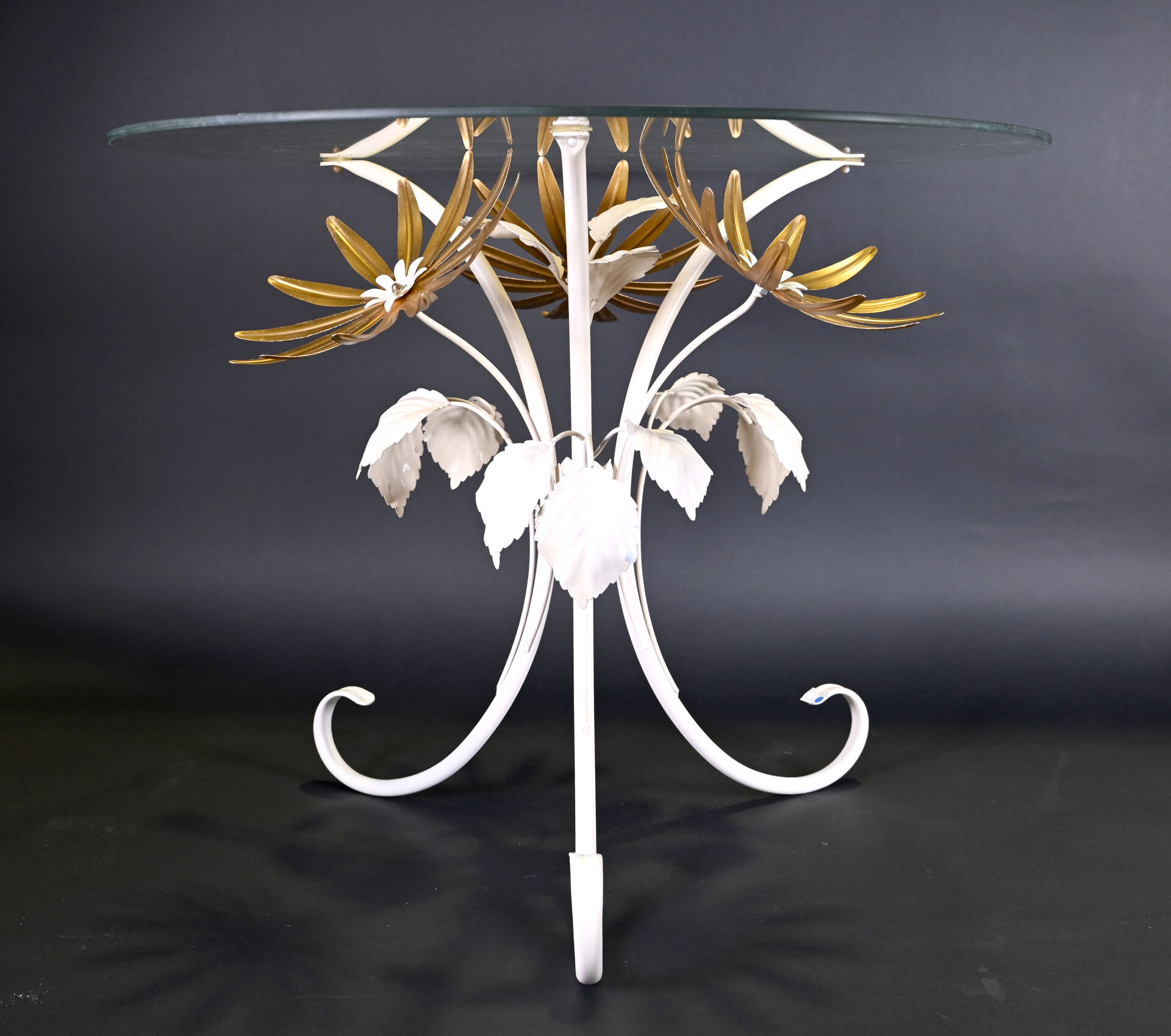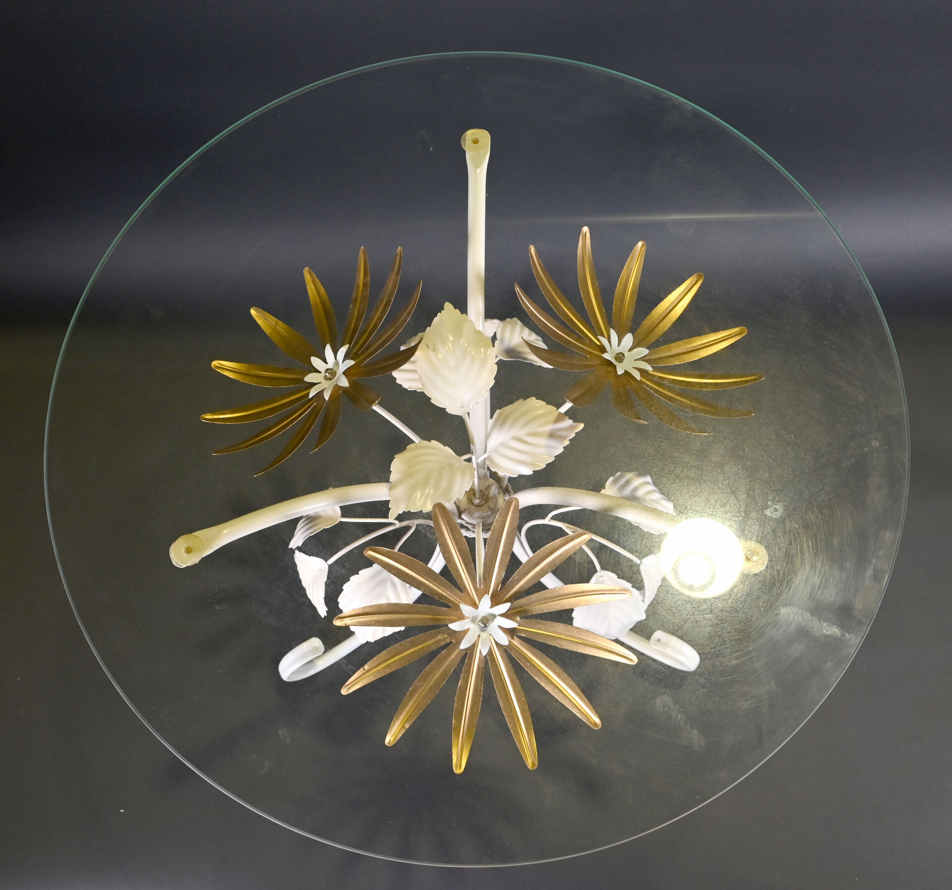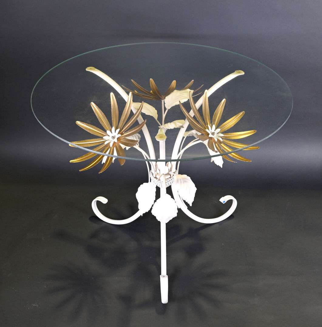 Hans KOGL (XXe siècle). Guéridon ou table basse à plateau en verre et piètement gerbe de fleurs en métal laqué crème et or. Haut. : 53 cm – Diam. : 64,5 cm.